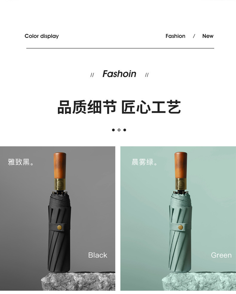 완전 자동 3 배 우산 검은 고무 선 스크린 비 이중 사용 우산 복고풍 단단한 나무 손잡이 비즈니스 광고 맞춤 로고스토어 가기