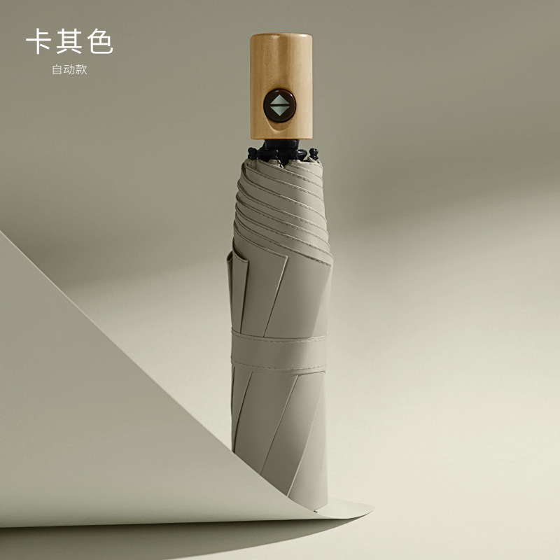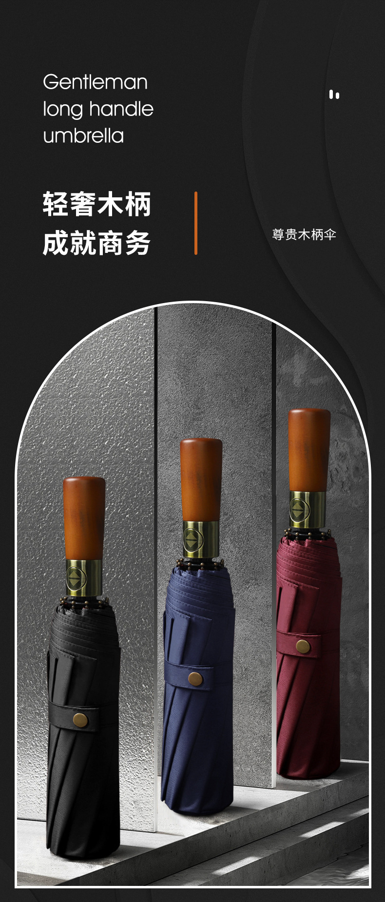 완전 자동 3 배 우산 검은 고무 선 스크린 비 이중 사용 우산 복고풍 단단한 나무 손잡이 비즈니스 광고 맞춤 로고