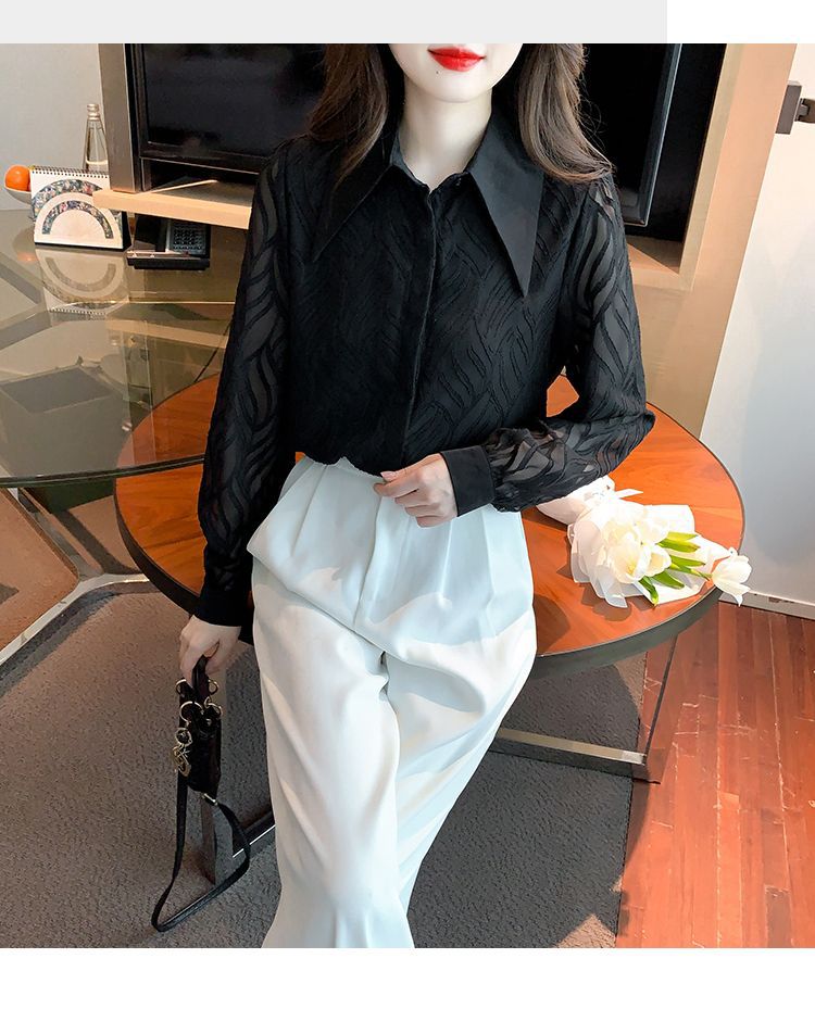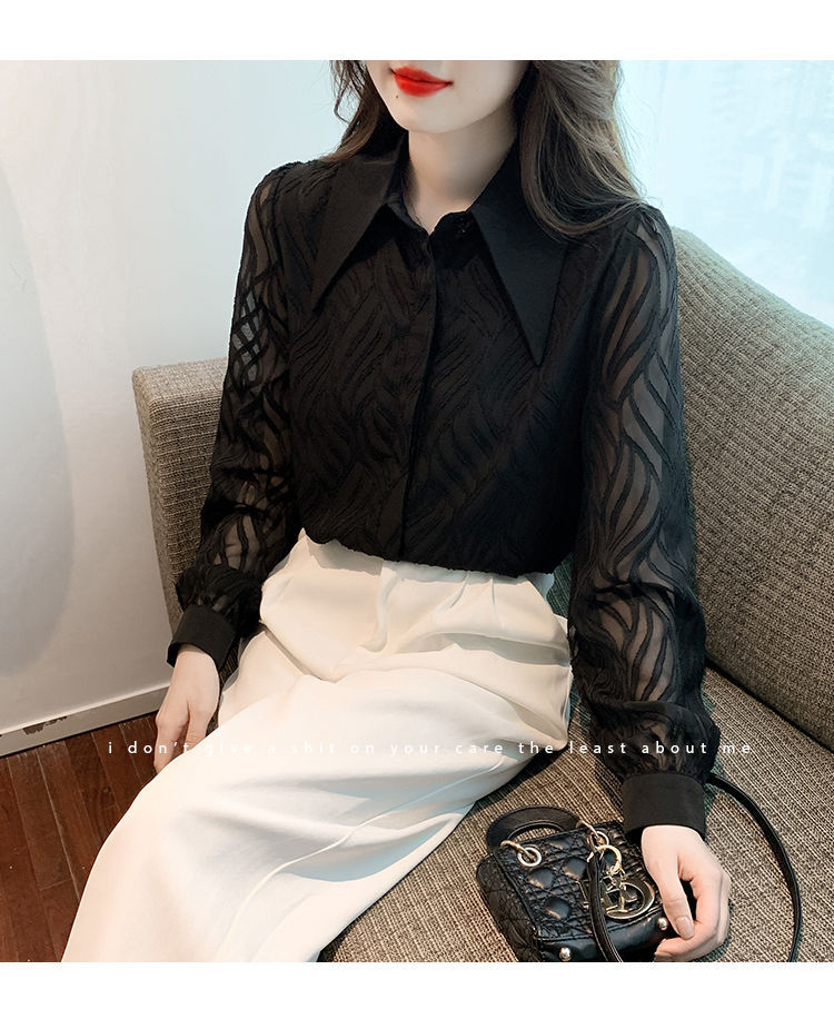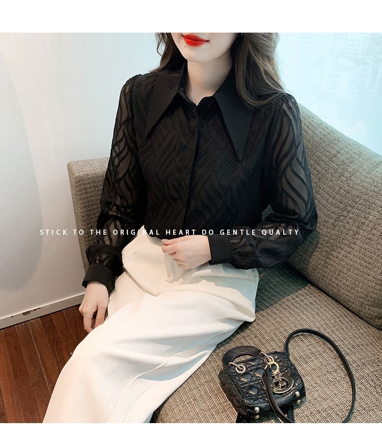 폴로 칼라 블랙 쉬폰 셔츠 여성의 가을 새로운 디자인 감각 틈새 복고풍 프랑스 긴 소매 탑스토어 가기