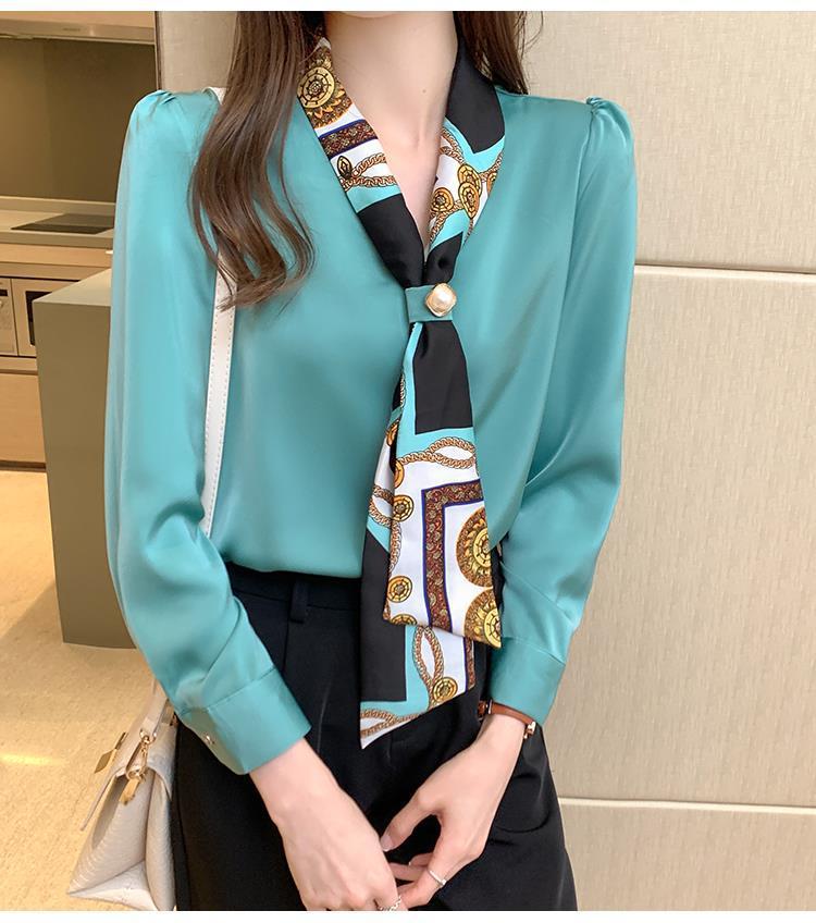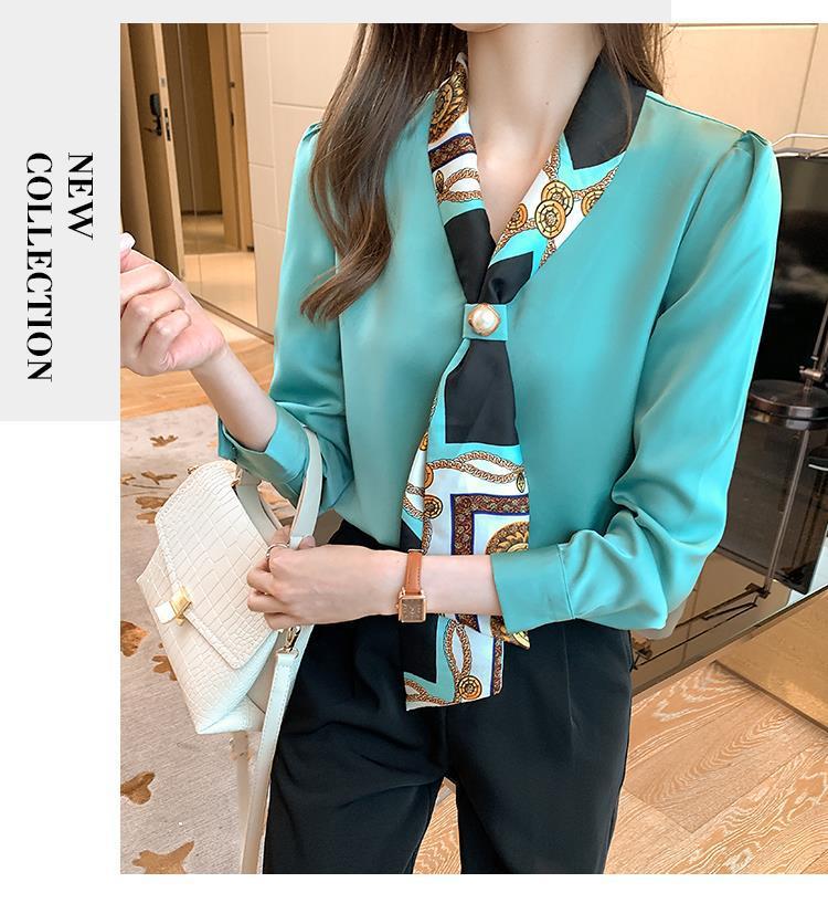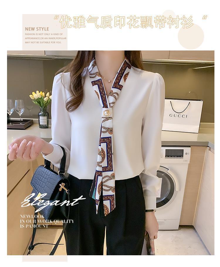 봄 새로운 디자인 감각 틈새 V 넥 화이트 셔츠 긴 소매 탑 우아한 넥타이 전문 셔츠 여성스토어 가기