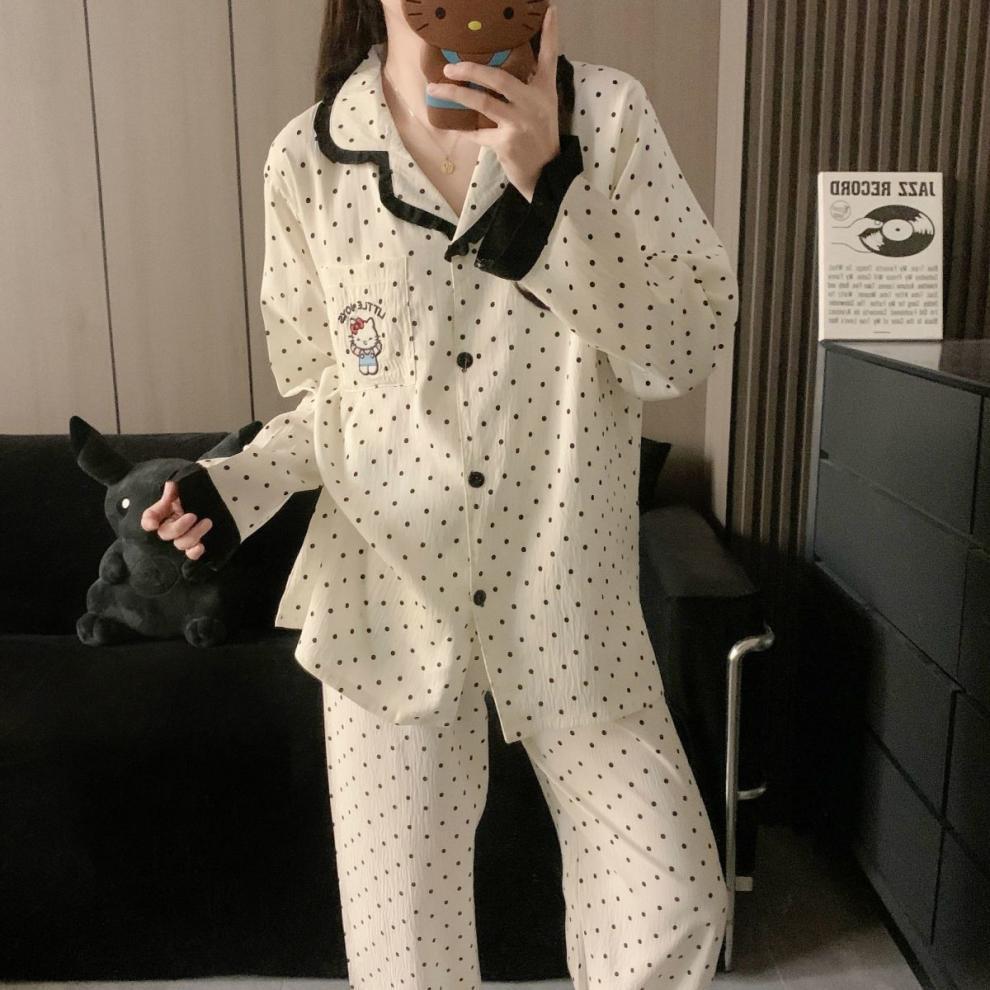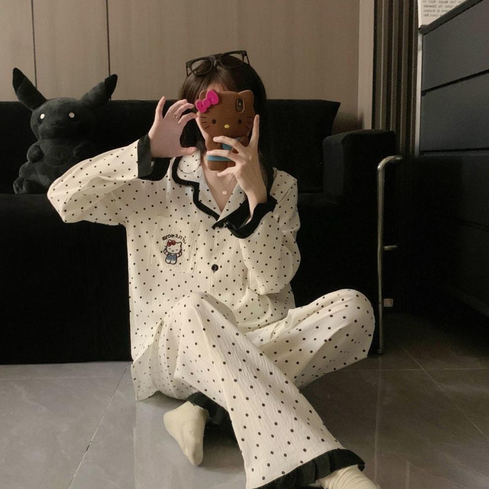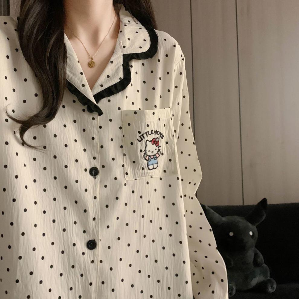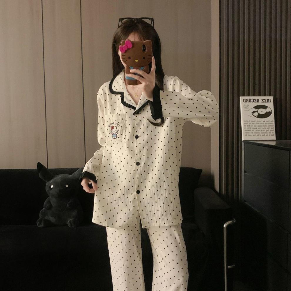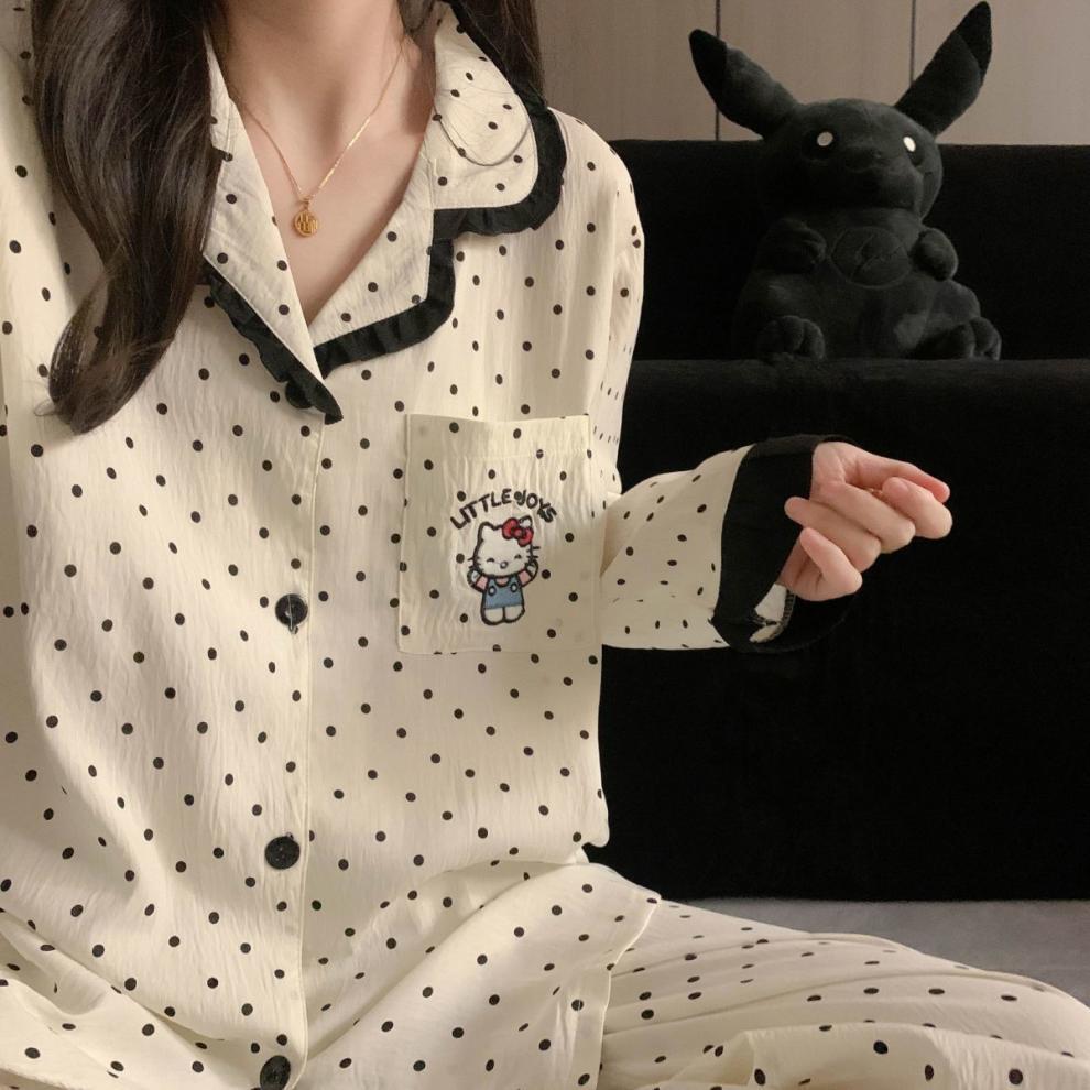 2025 새로운 달콤한 폴로 도트 KT 고양이 잠옷 여성 달콤한 소녀 레이스 긴 소매 세트 집 옷스토어 가기