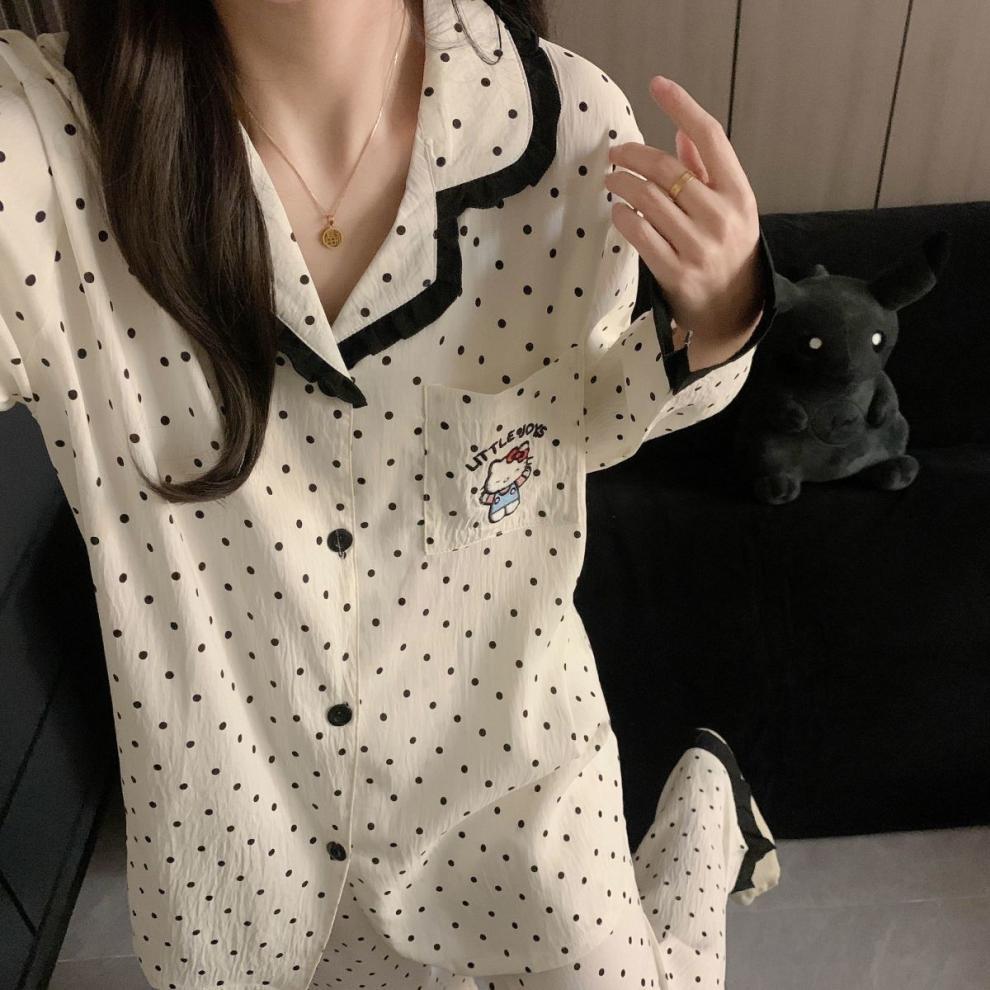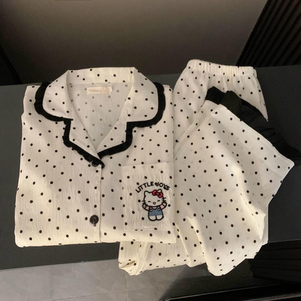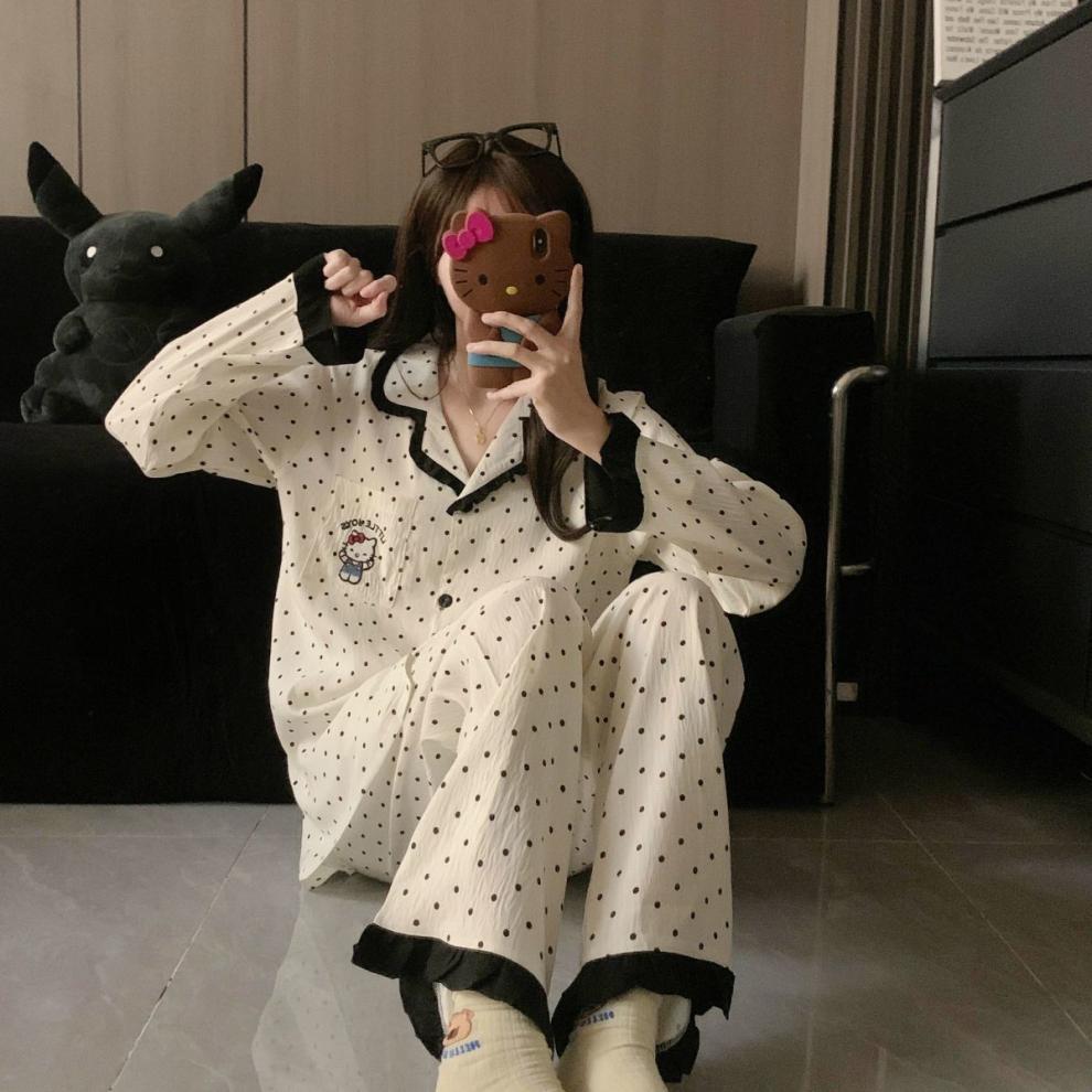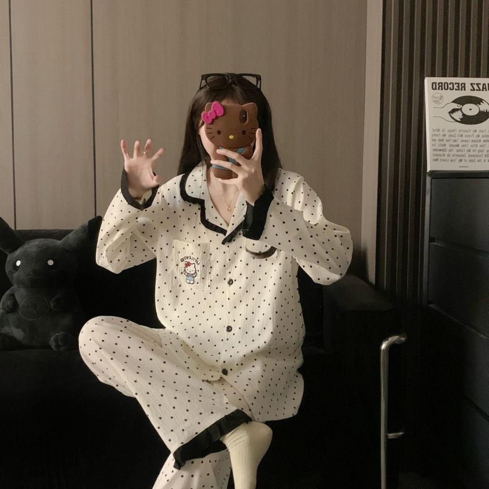 2025 새로운 달콤한 폴로 도트 KT 고양이 잠옷 여성 달콤한 소녀 레이스 긴 소매 세트 집 옷스토어 가기
