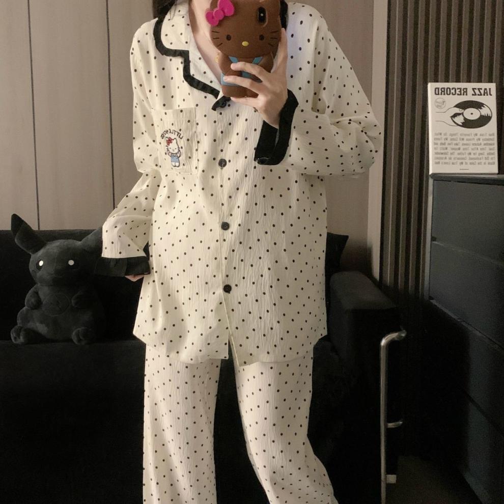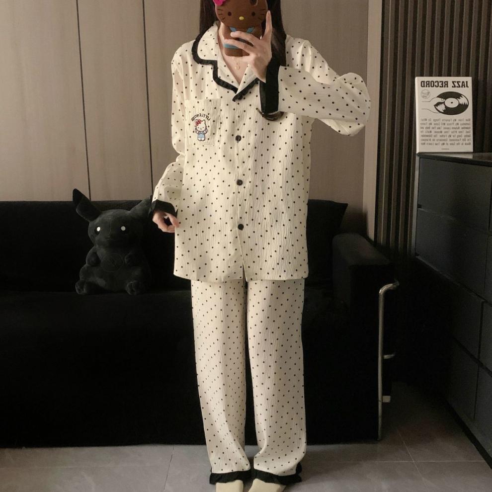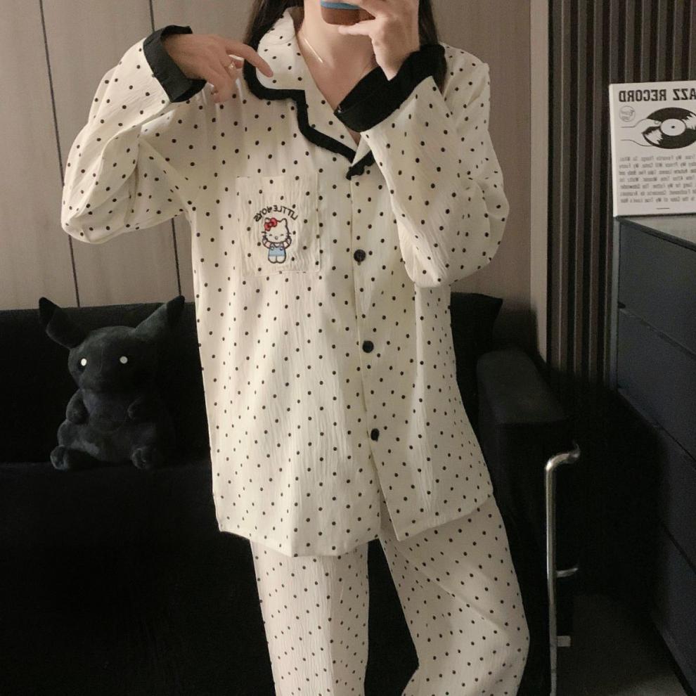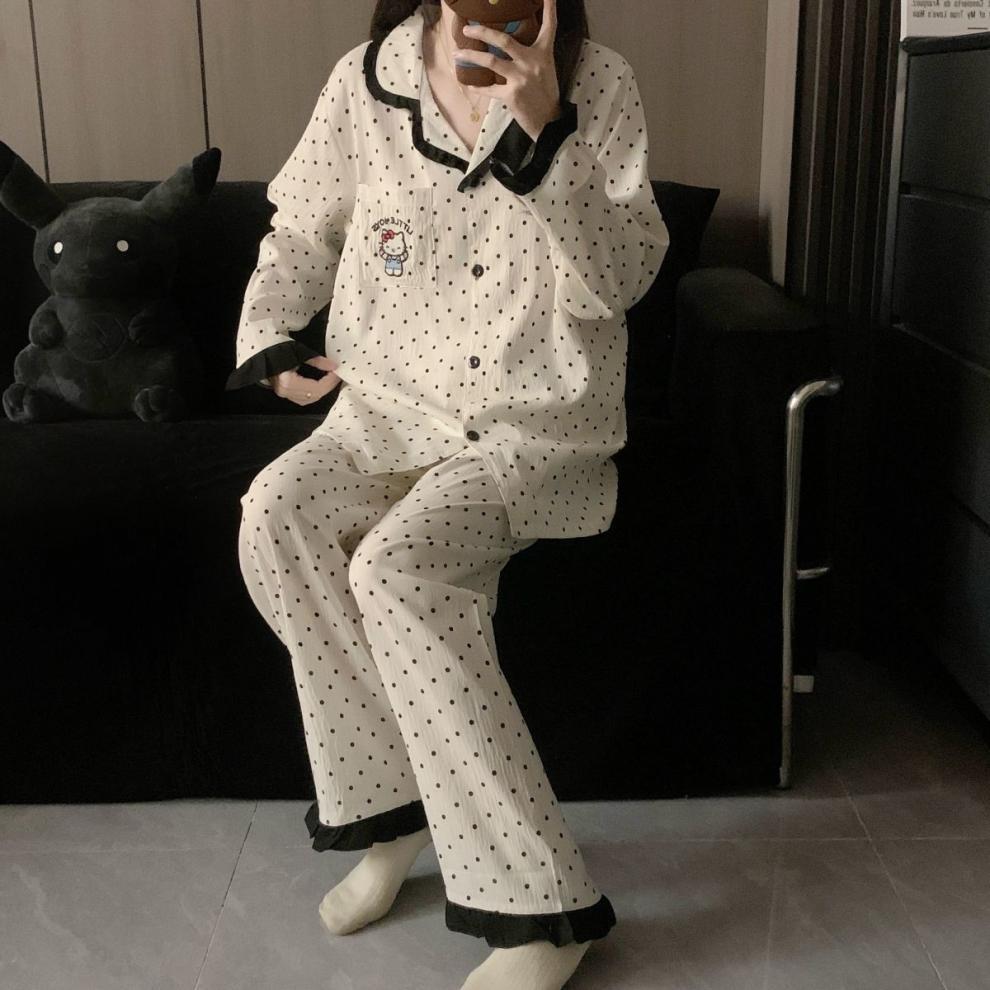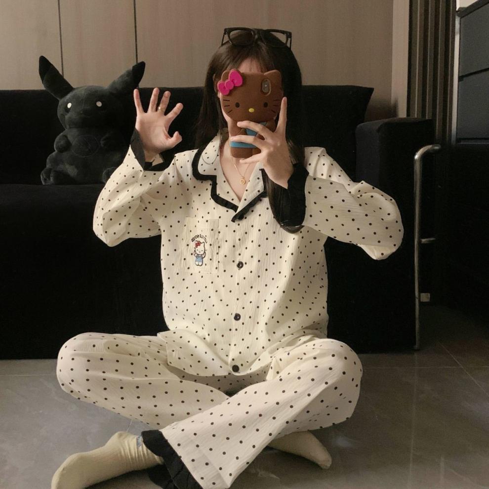 2025 새로운 달콤한 폴로 도트 KT 고양이 잠옷 여성 달콤한 소녀 레이스 긴 소매 세트 집 옷스토어 가기