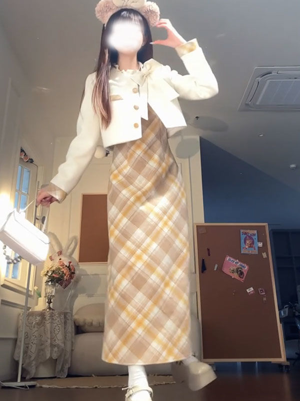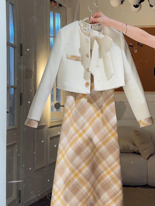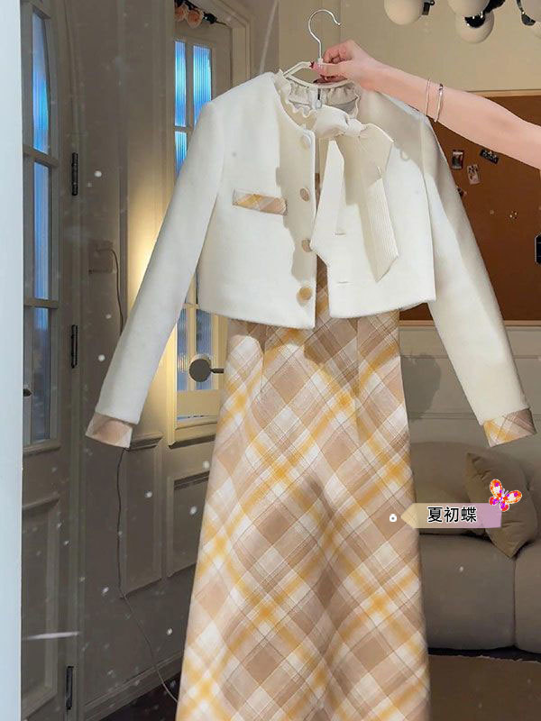 한국 스타일 스위트 스타일 격자 무늬 원피스 세트 여성 가을 서양식 연령 감소 짧은 재킷 하이 엔드 웨이스트 롱 원피스