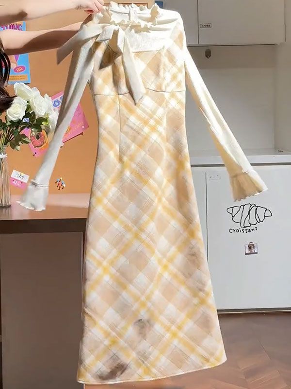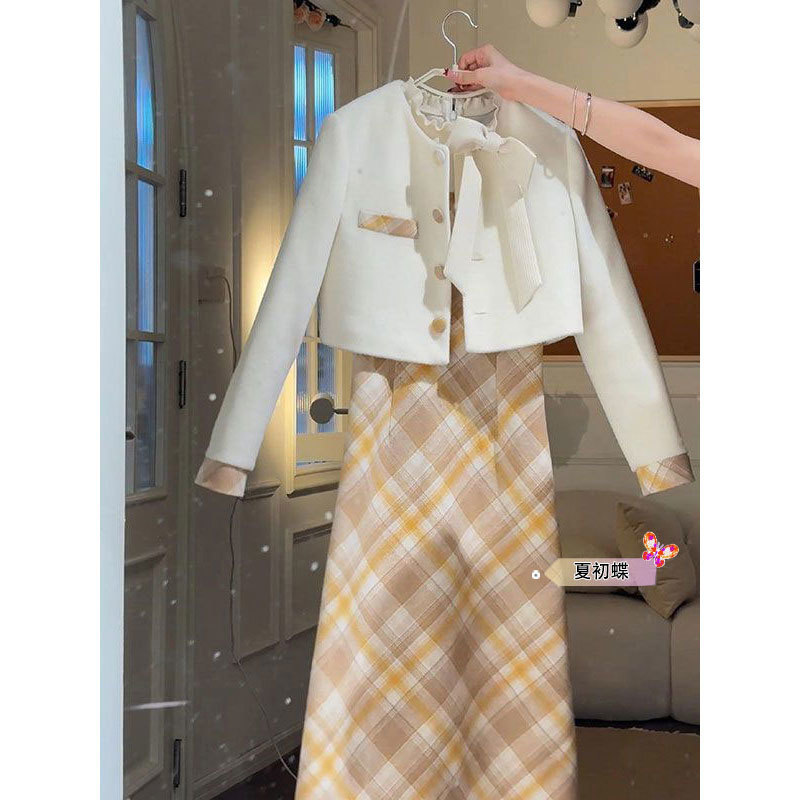 한국 스타일 스위트 스타일 격자 무늬 원피스 세트 여성 가을 서양식 연령 감소 짧은 재킷 하이 엔드 웨이스트 롱 원피스스토어 가기