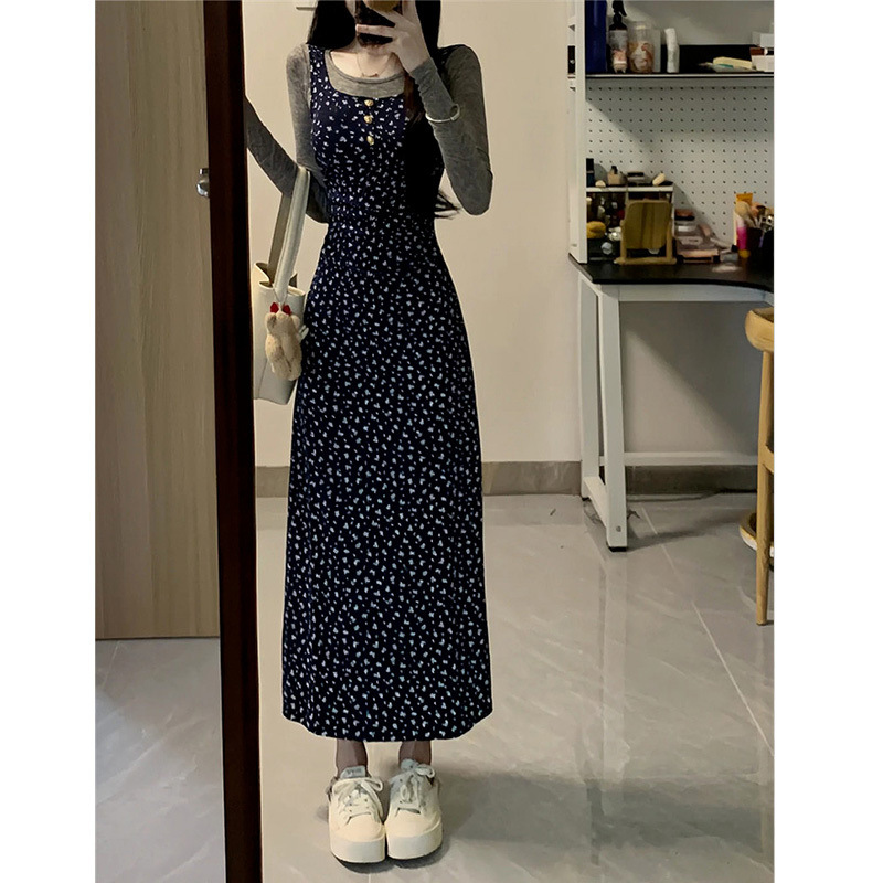 블루 스트랩 꽃 원피스 어린이 2025 새로운 초가을 한국 스타일 원피스 프랑스 우아한 바느질스토어 가기