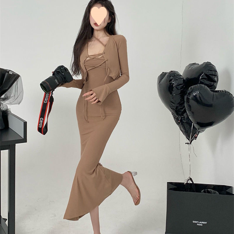 순수 슬링 원피스 여성 여름 카키 스파이스 소녀 타이트 허리 고급 우아한 엉덩이 중간 길이의 피쉬 스커트