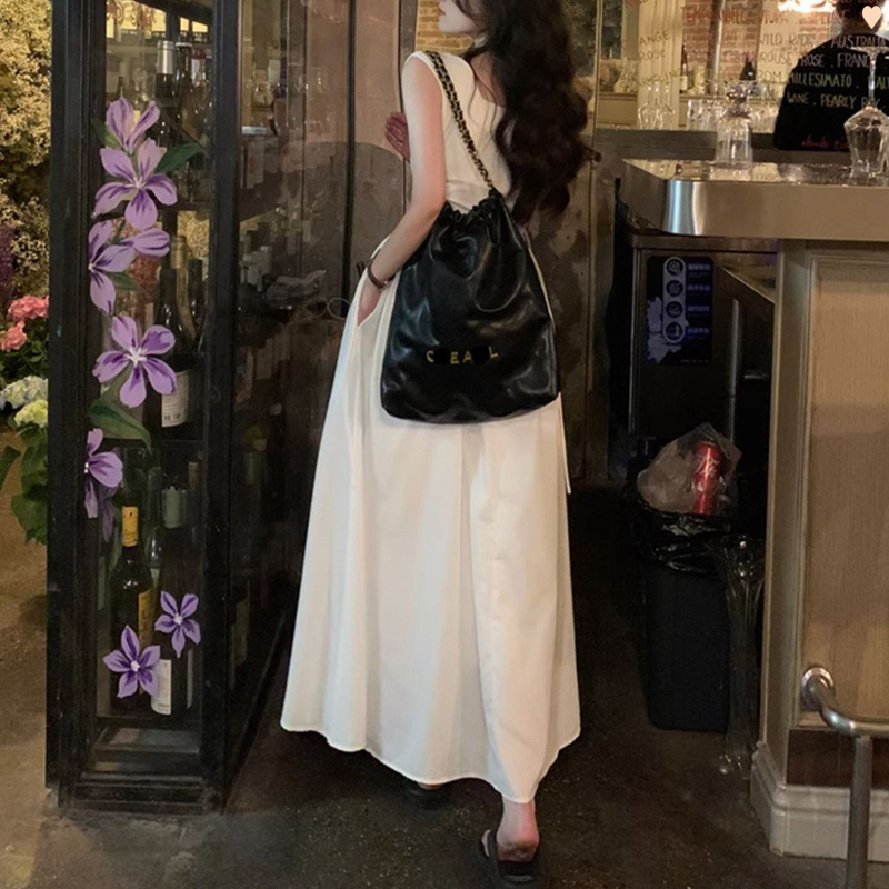 2025 봄과 여름 흰색 민소매 우아한 원피스 게으른 높은 허리 광장 칼라 슬링베이스 조끼 긴 치마