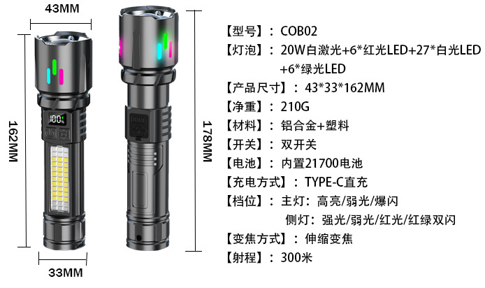 국경을 넘는 새로운 모델의 레이저 장거리 야외용 줌 디지털 디스플레이 COB 사이드 라이트 작업등, 후면 자석, 직접 충전식 손전등
