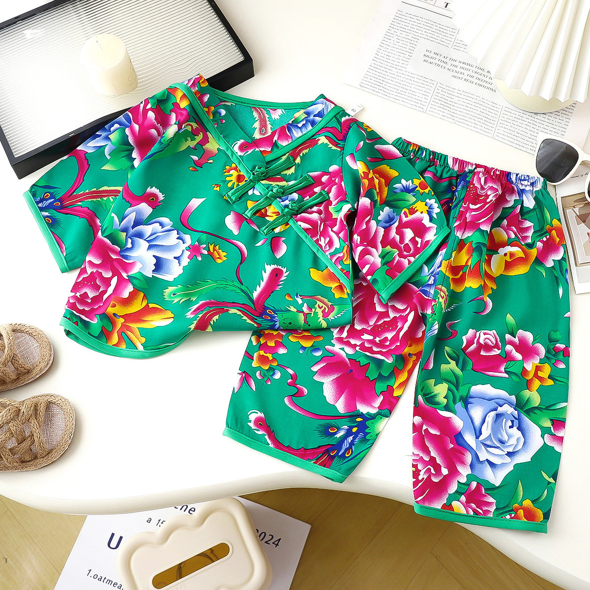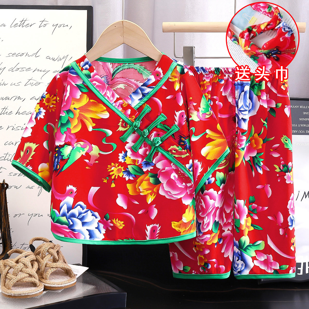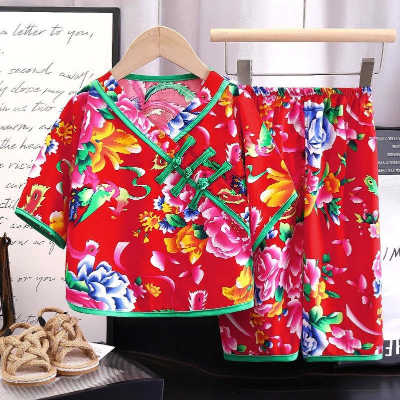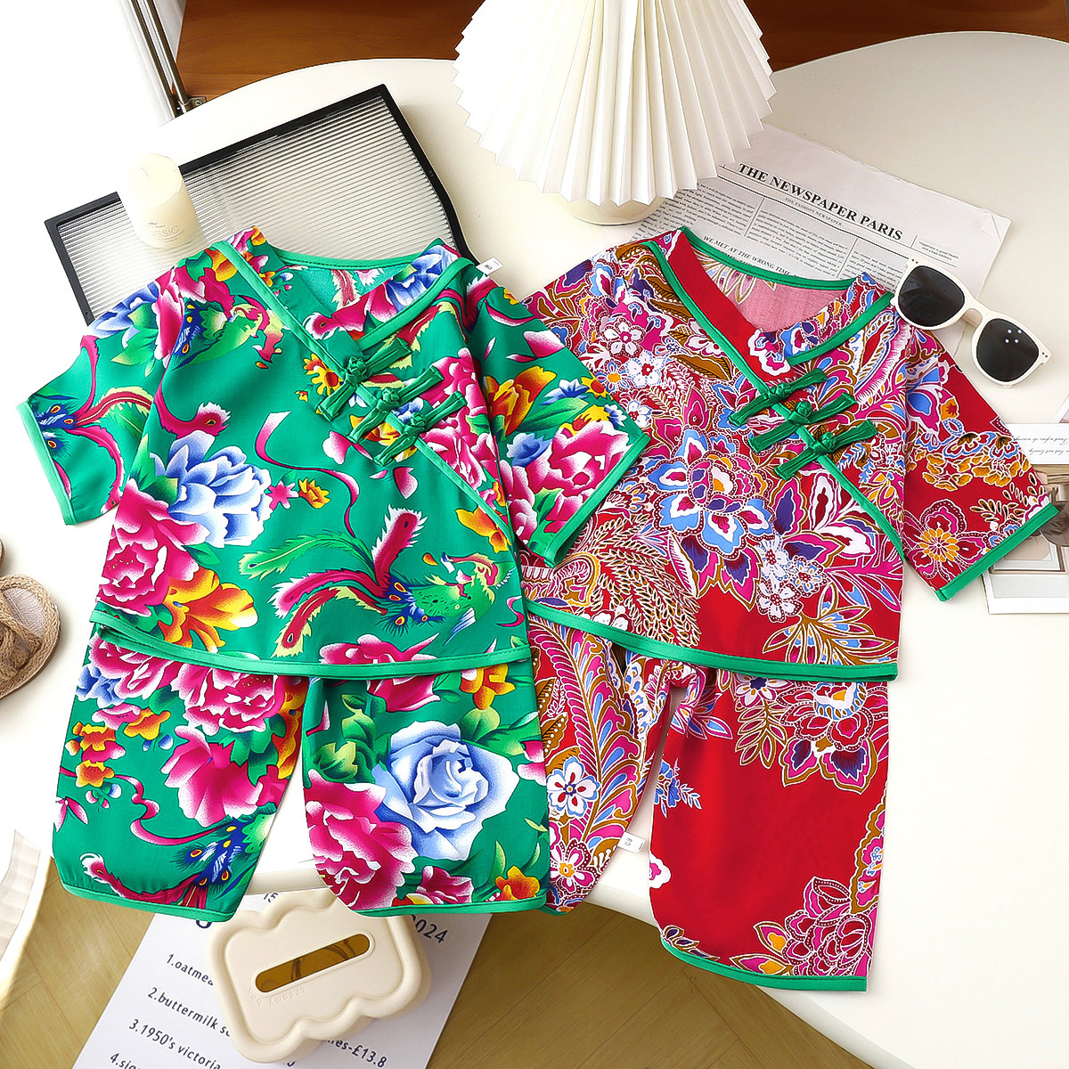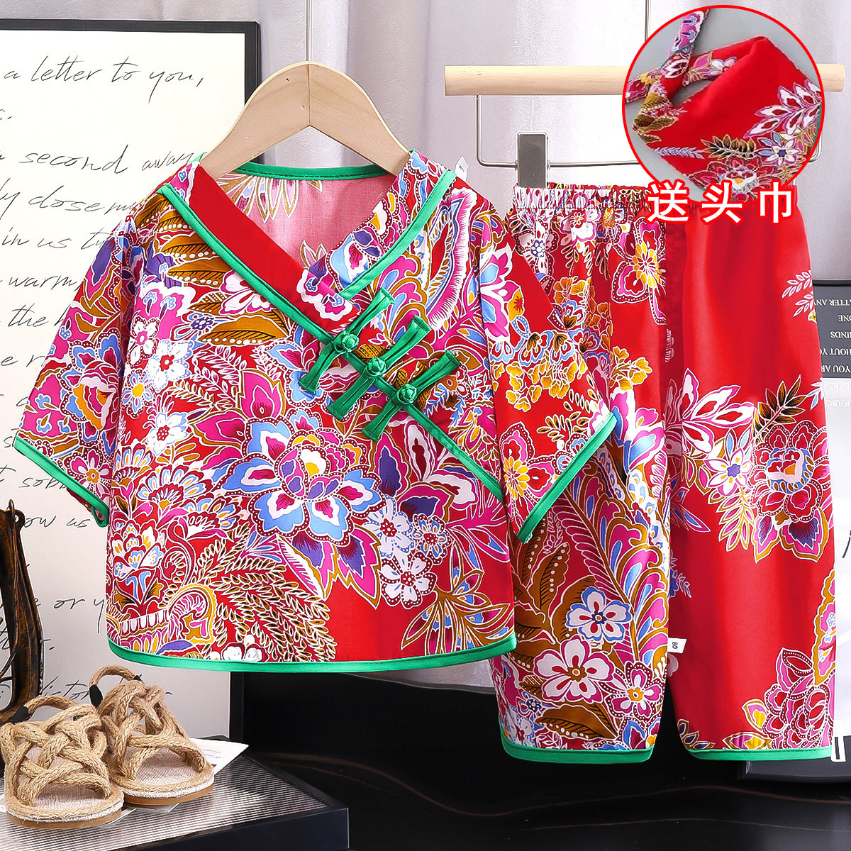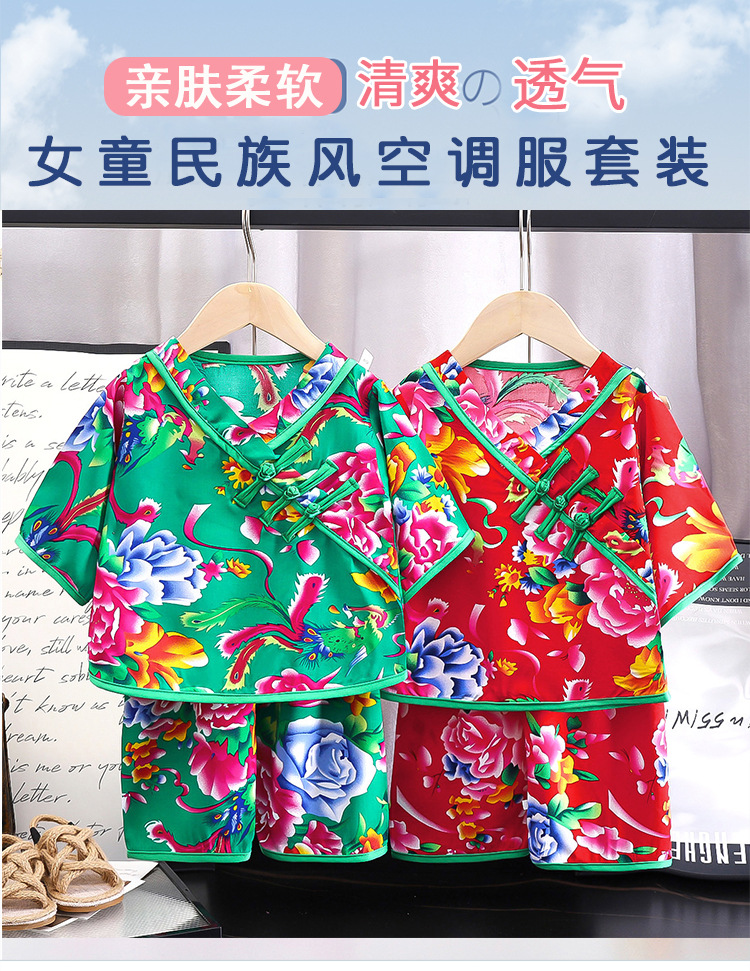 새로운 어린이 Guofeng 잠옷 세트 에어컨 의류 아기 소녀의 집 옷 면 실크 여름 얇은 투피스 세트
