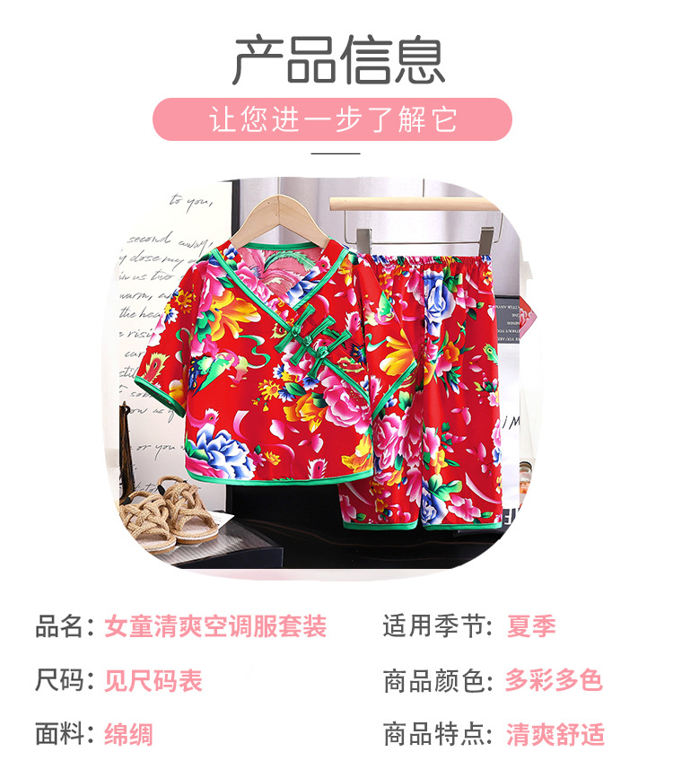 새로운 어린이 Guofeng 잠옷 세트 에어컨 의류 아기 소녀의 집 옷 면 실크 여름 얇은 투피스 세트스토어 가기