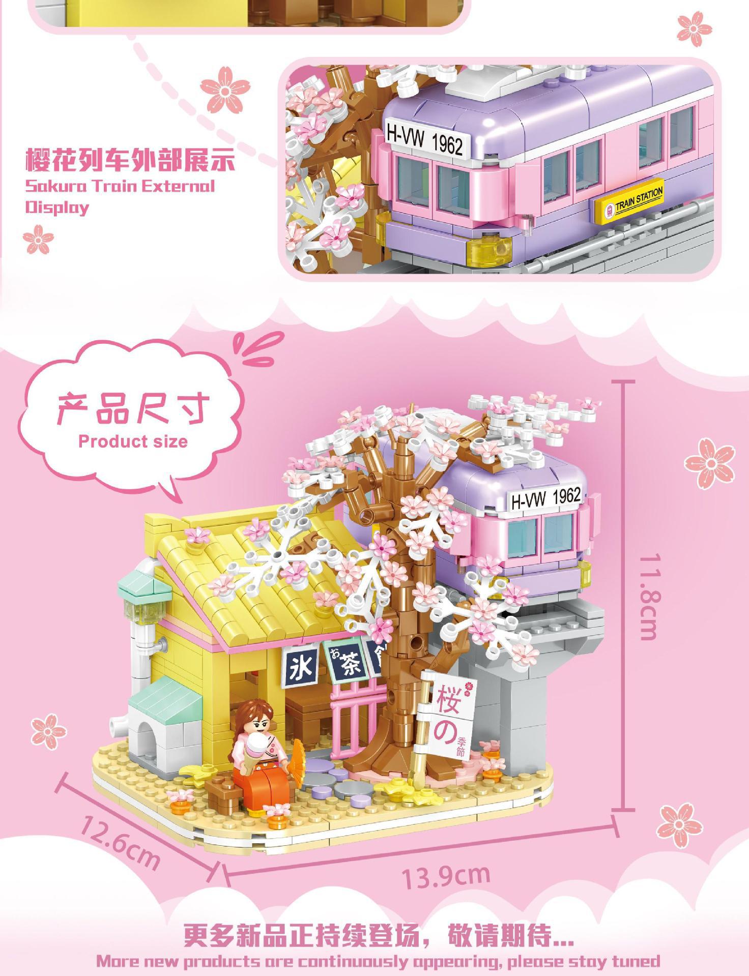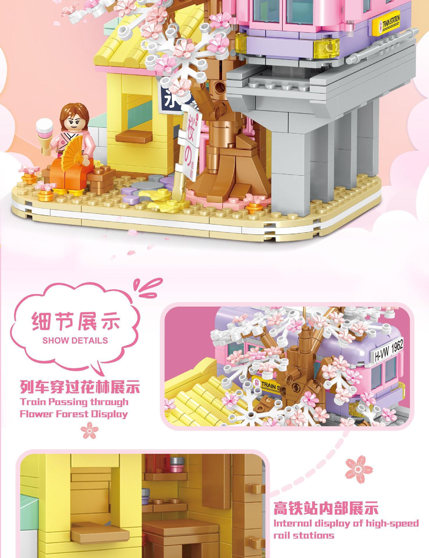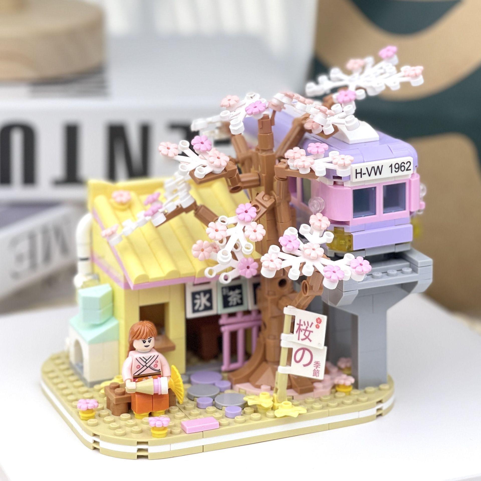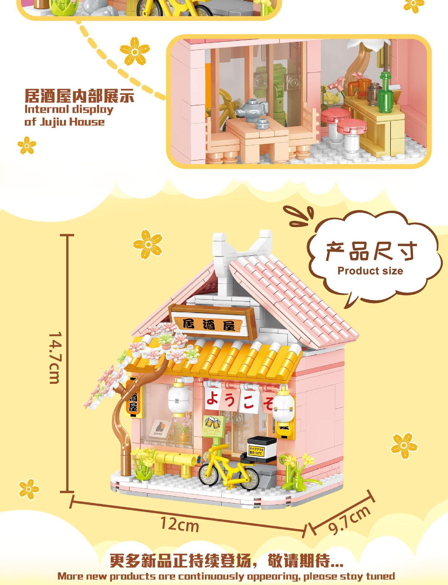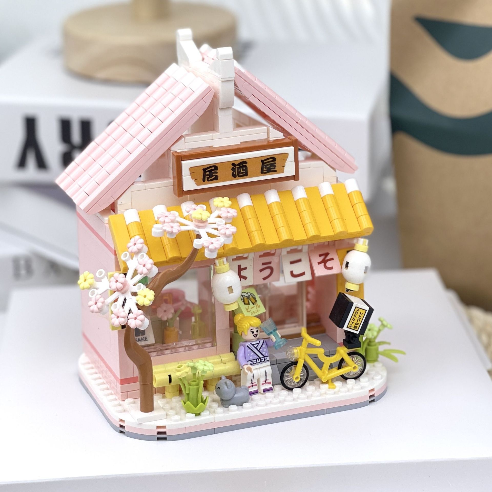 Weile Chuanghua 퍼즐 빌딩 블록 미니 스트리트 뷰 소녀 벚꽃 나무 집 이자카야 조립 장난감 소녀 선물스토어 가기