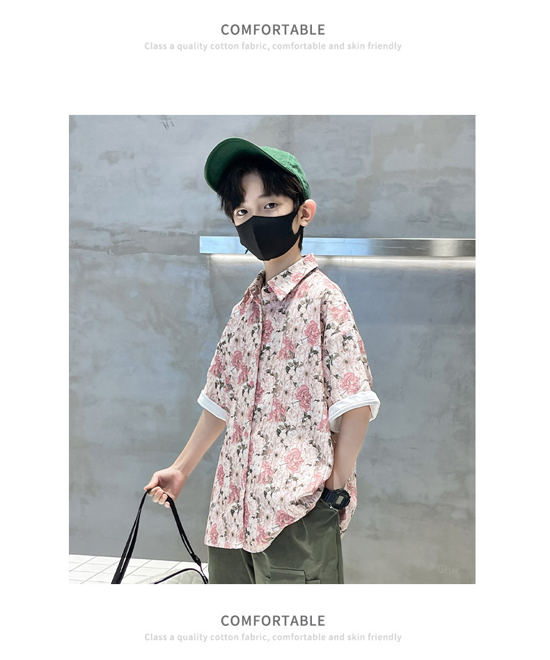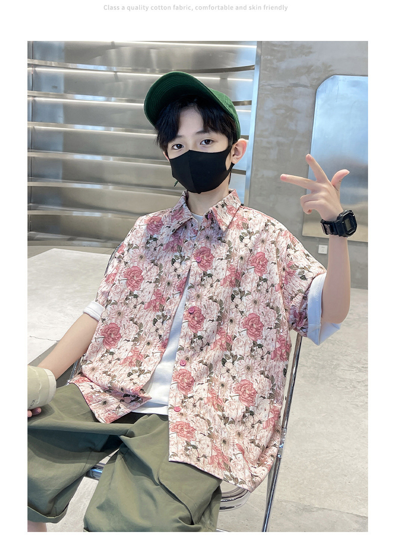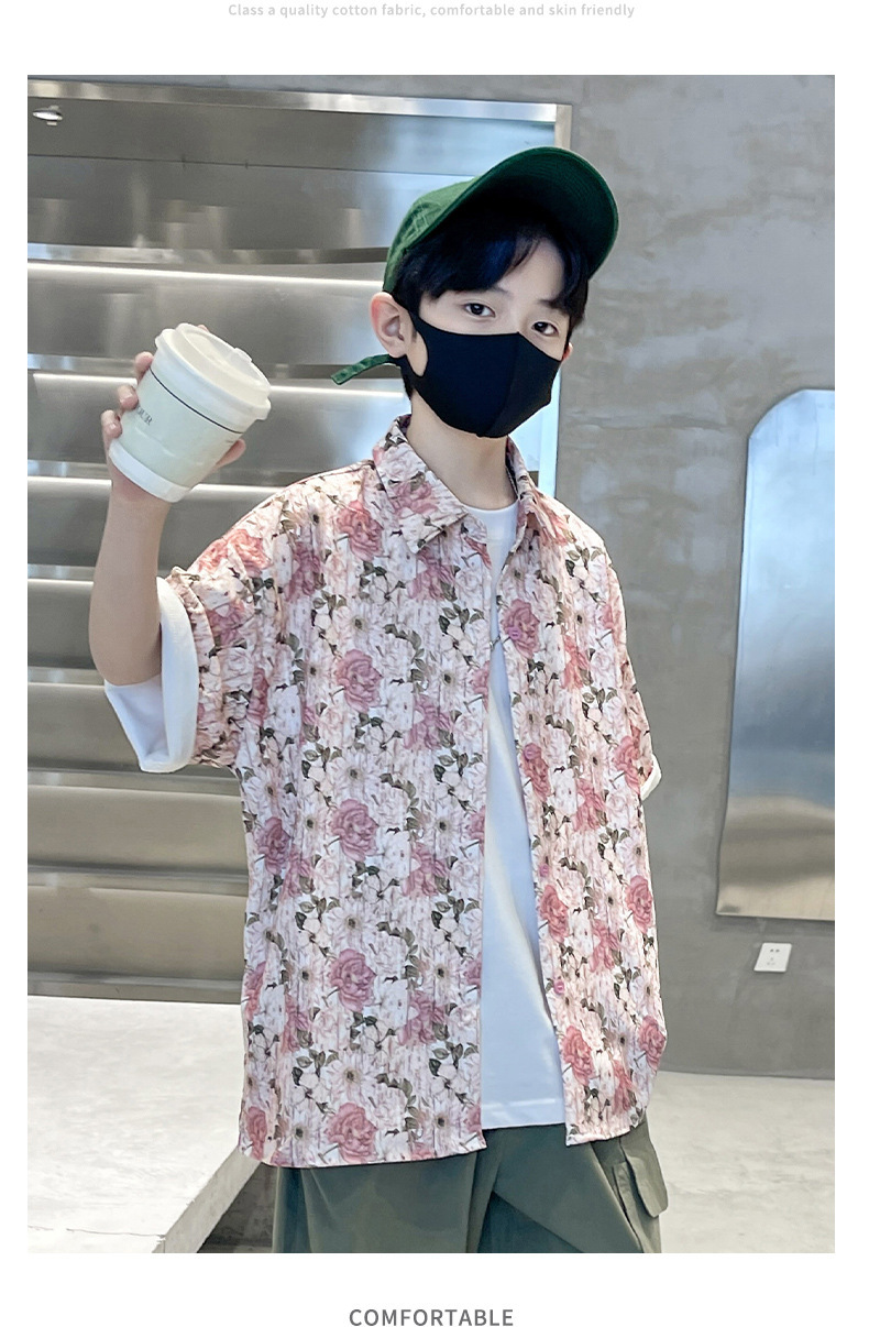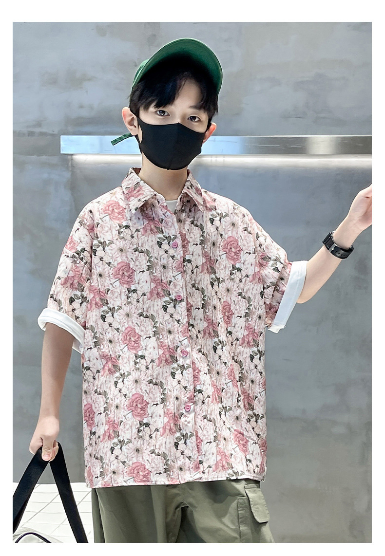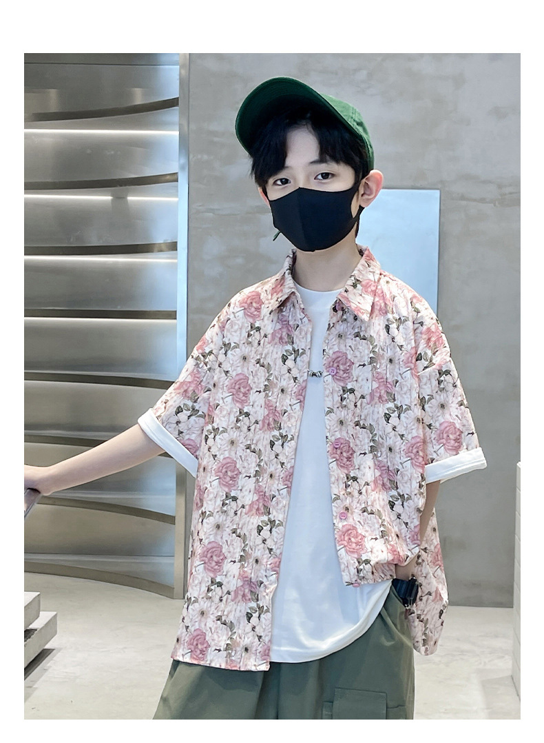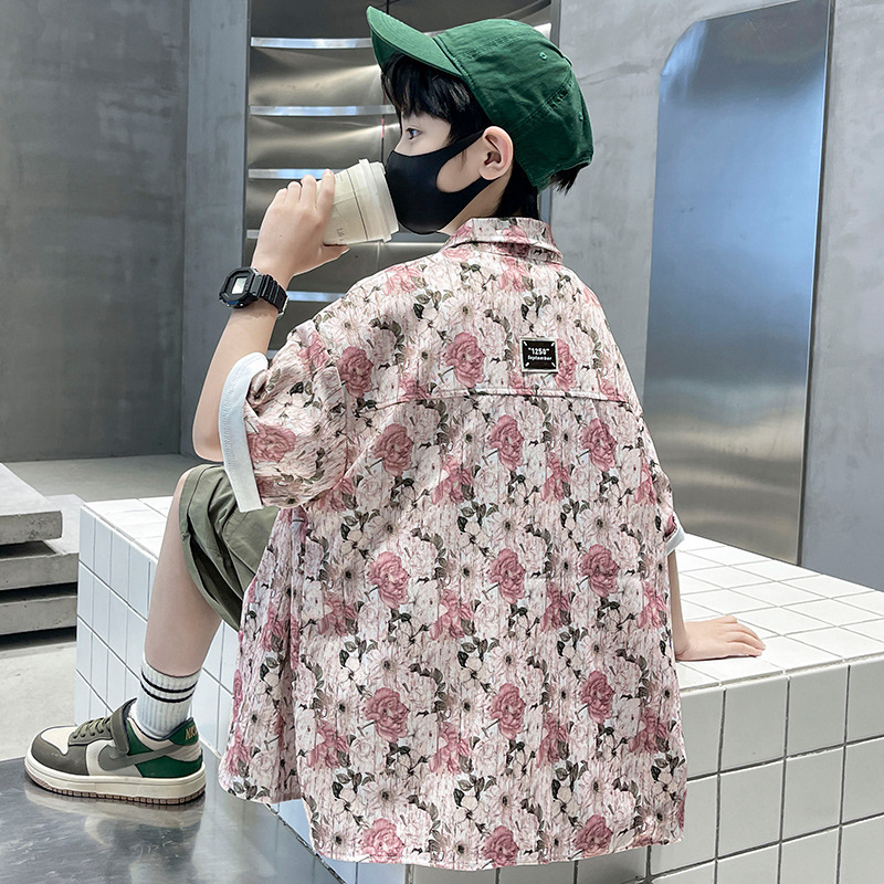 어린이 반팔 셔츠 소년 여름 얇은 2025 새로운 도착 트렌디 시원하고 잘 생긴 꽃 셔츠 여름
