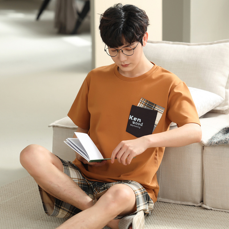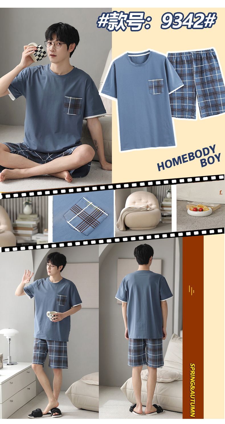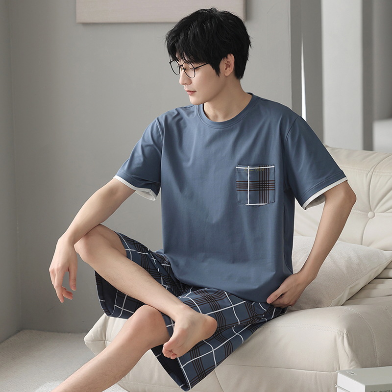 하이 퀄리티 코튼 파자마 남자 여름 얇은 반팔 반바지 코튼 학생 캐주얼 아웃웨어 홈 세트스토어 가기