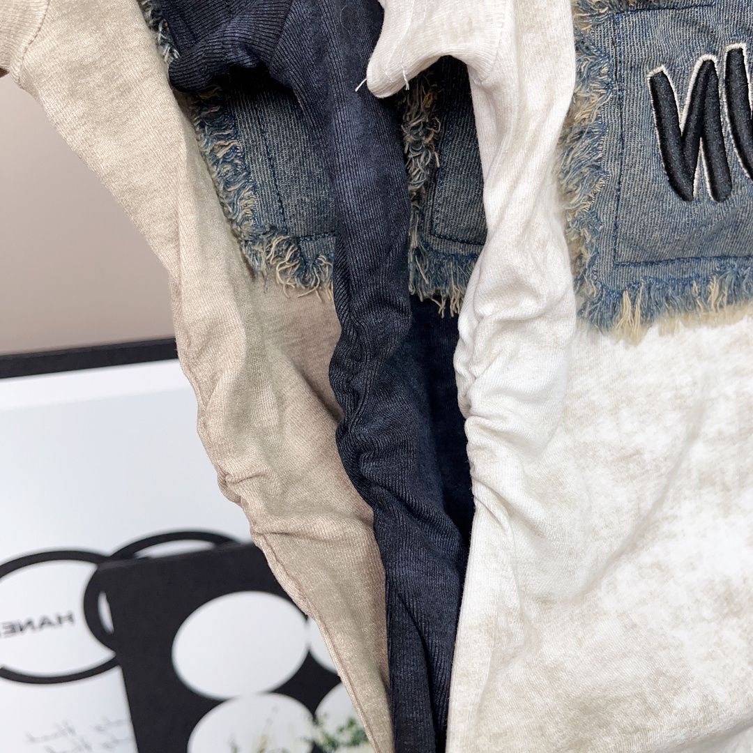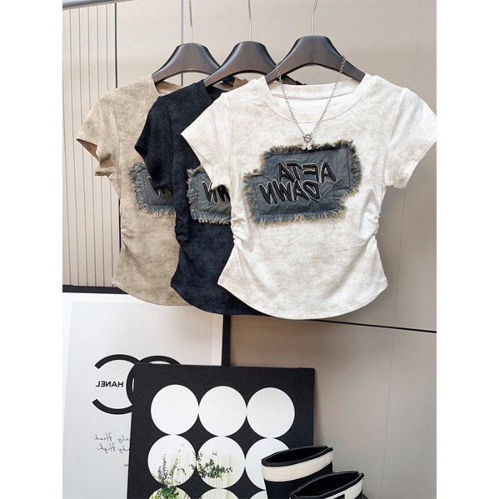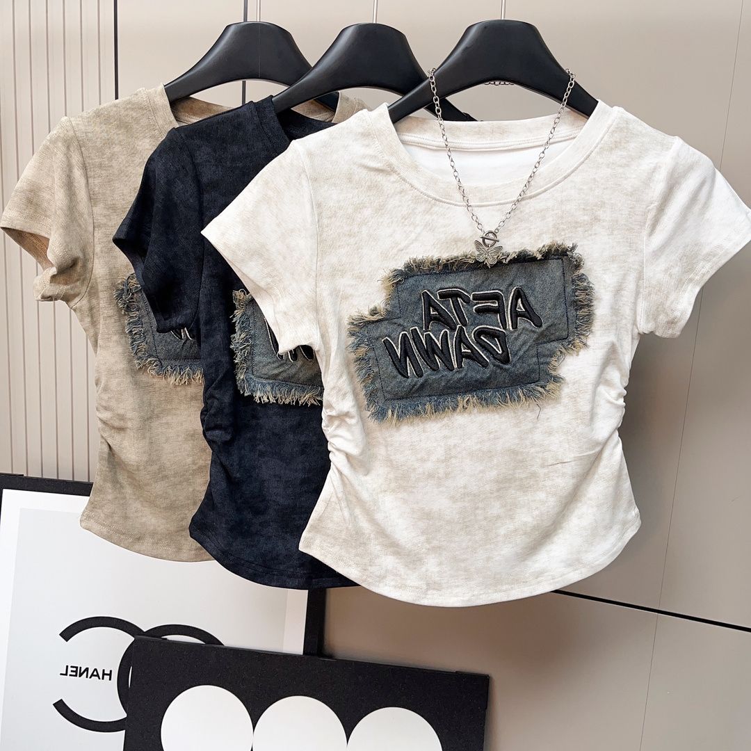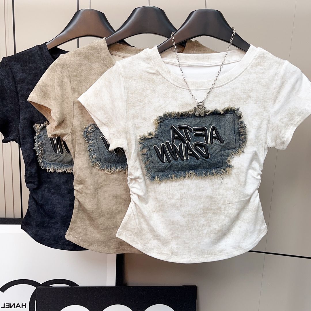 ((92棉8氨纶)) 40支精棉 修身扎染女牛仔贴布设计感休闲褶皱T恤