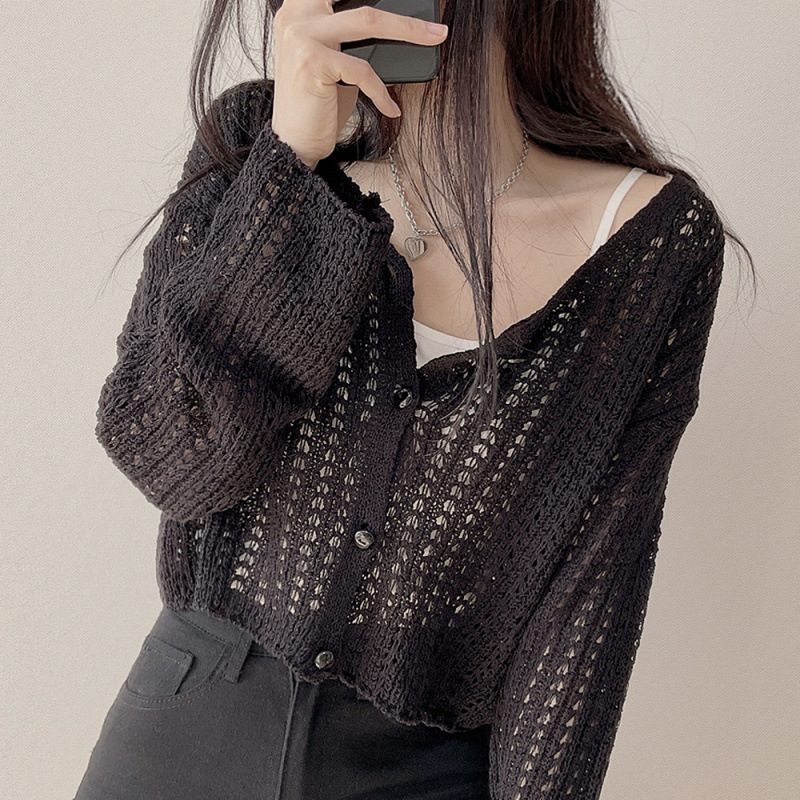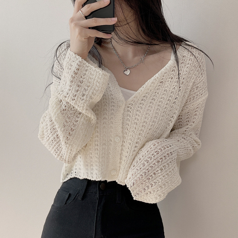 여름 새로운 게으른 스타일 니트 카디건 코트 여성용 얇은 할로우 블라우스 스웨터 태양 건조 짧은 목도리 탑