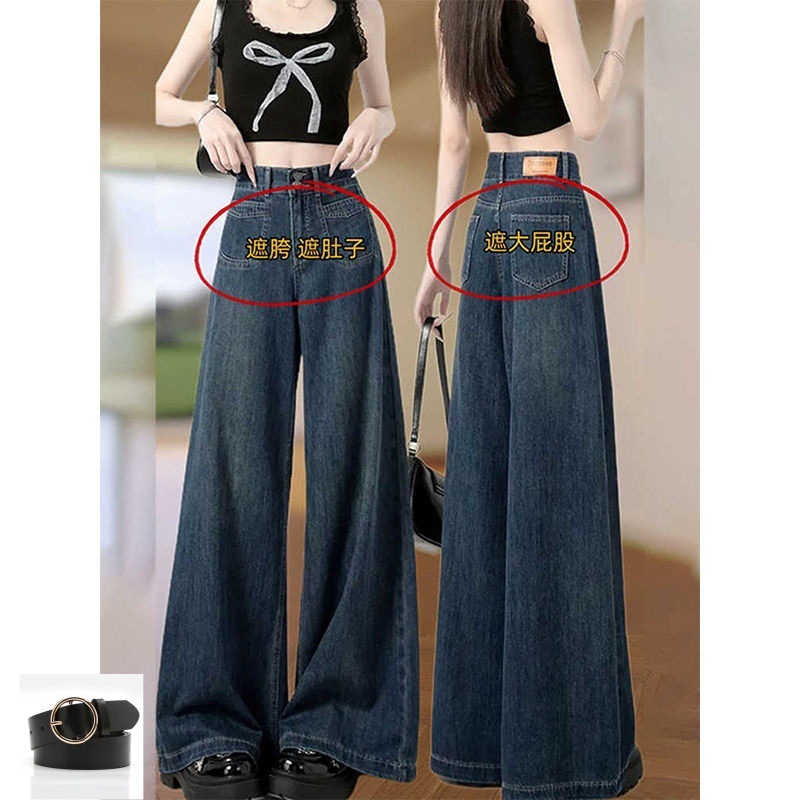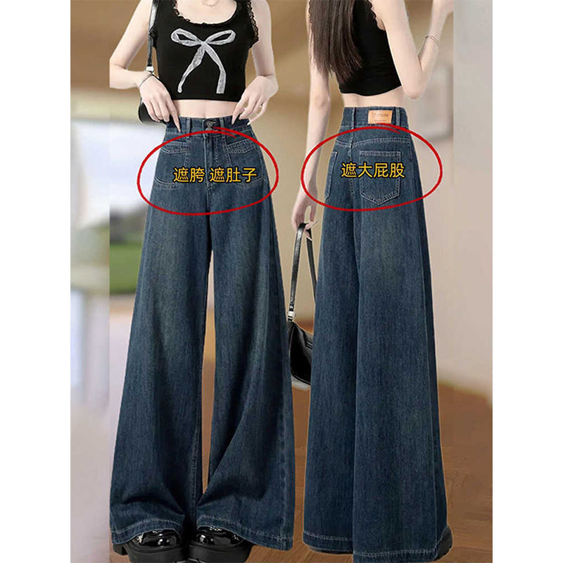빈티지 다크 블루 마이크로 와이드 다리 청바지 여성의 봄과 가을 높은 허리 느슨한 슬리밍 플러스 사이즈 배 모양의 바디 바지스토어 가기