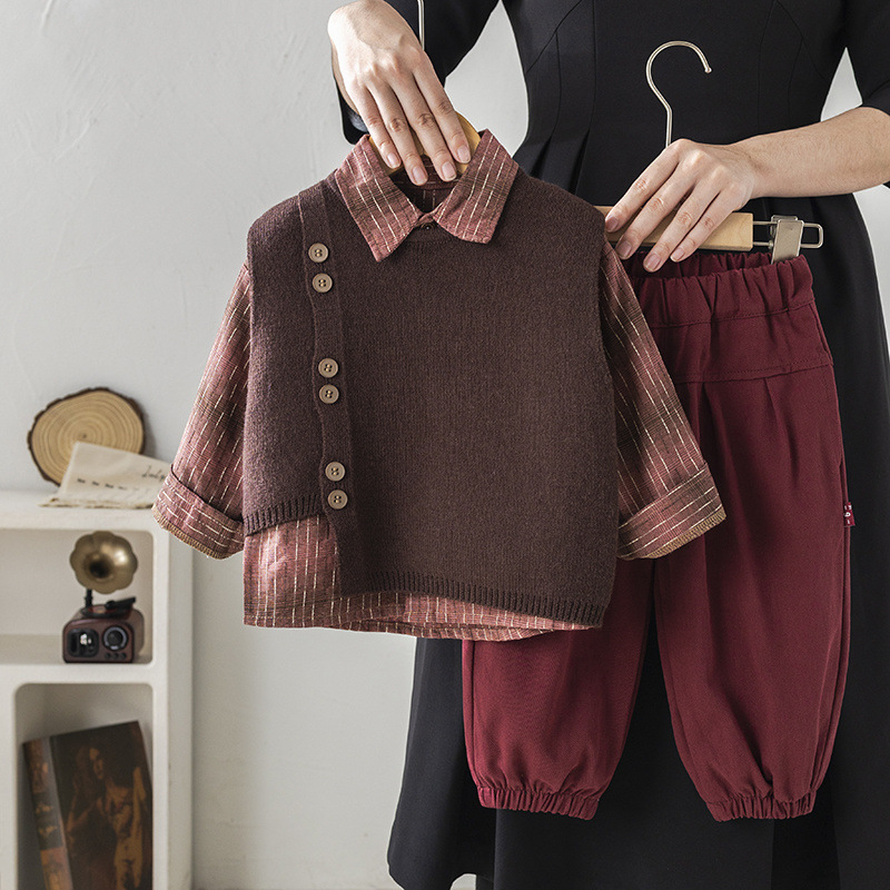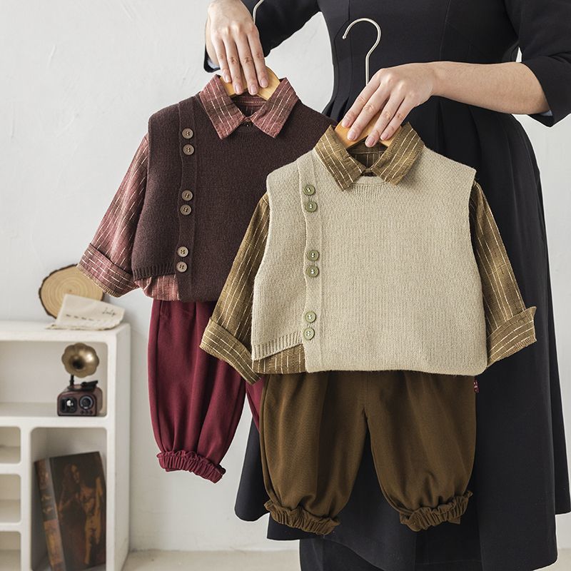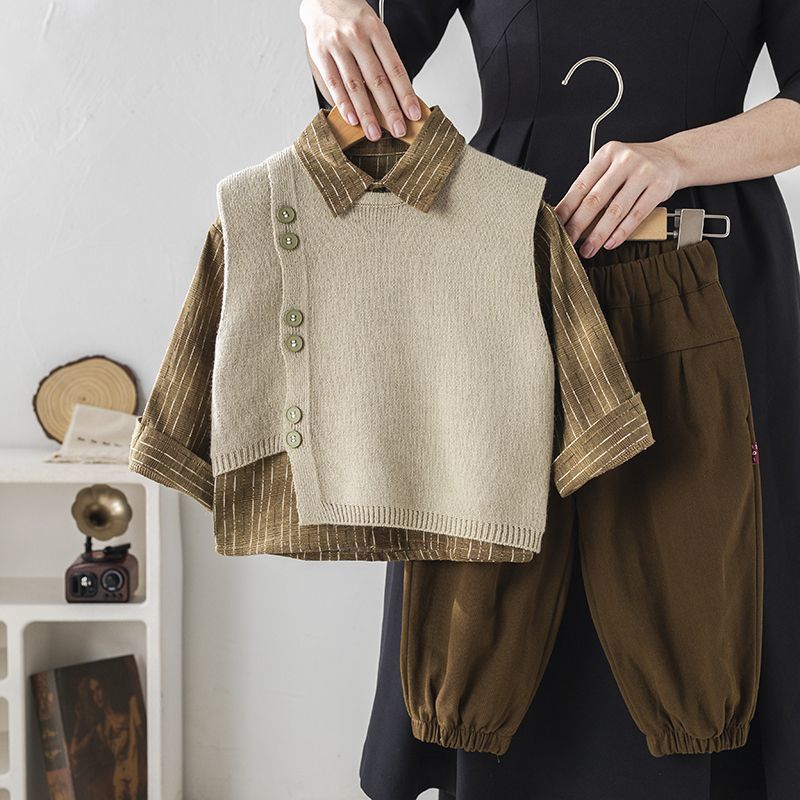 소년 세트 2025 새로운 한국 아기 봄과 가을 긴 소매 옷 어린이 셔츠 스웨터 조끼 3 조각 세트