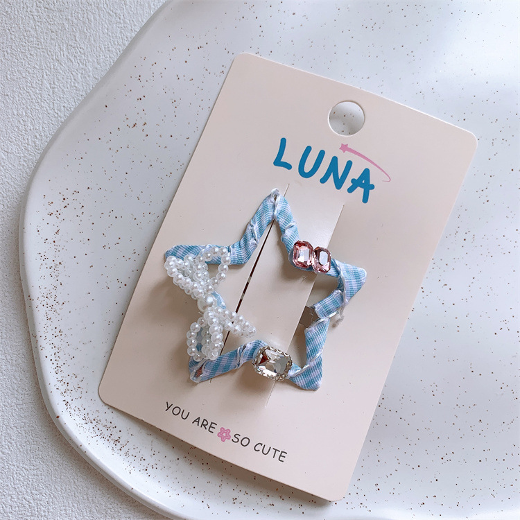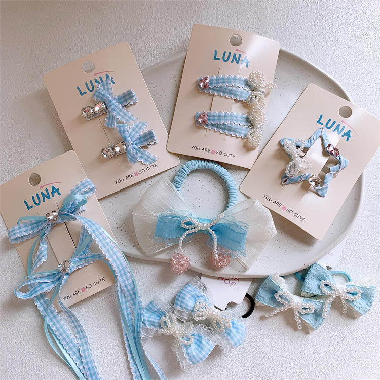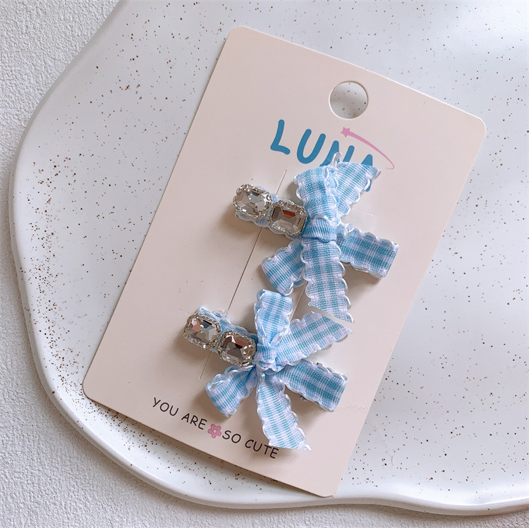 블루 신선한 스타일 라인스톤 격자 활 머리핀 어린이 방이들 사이드 클립 걸스 헤어 넥타이 고무 텐든 헤어 링