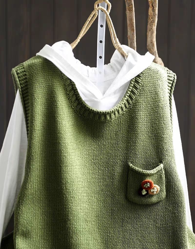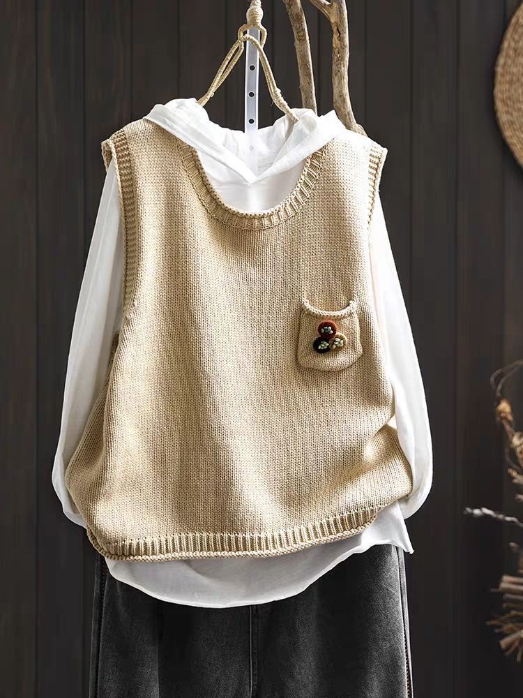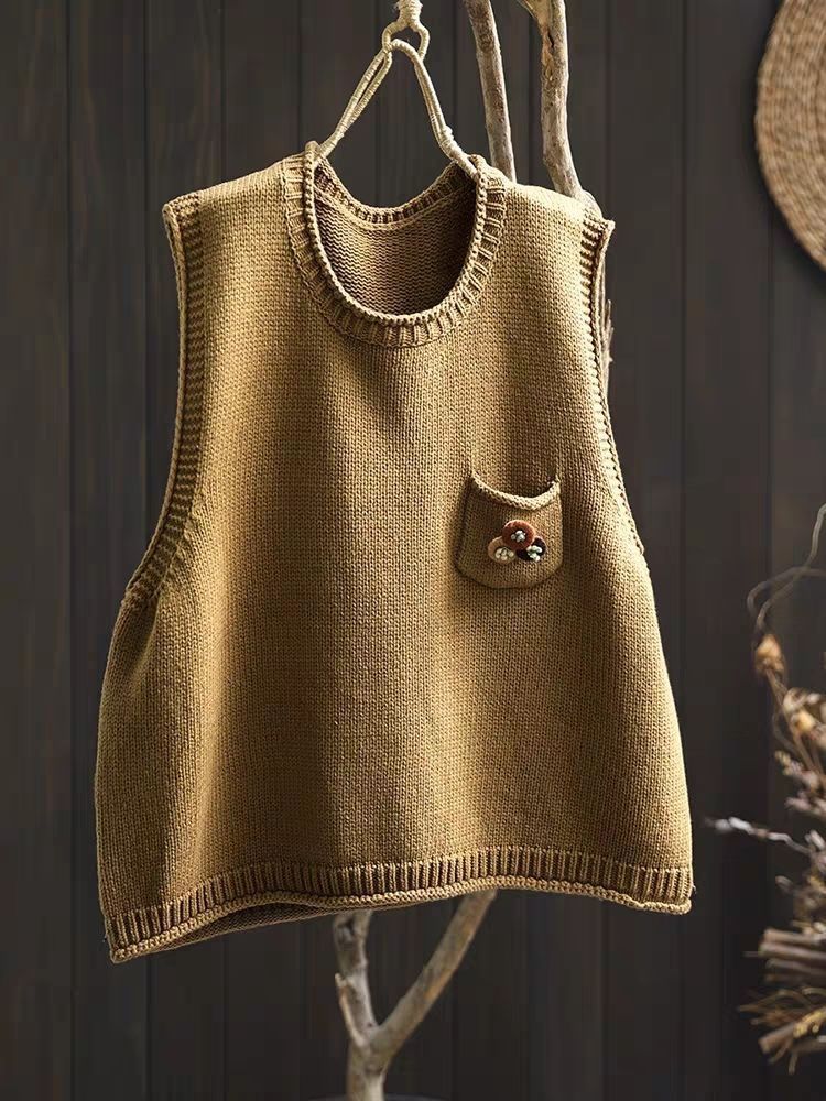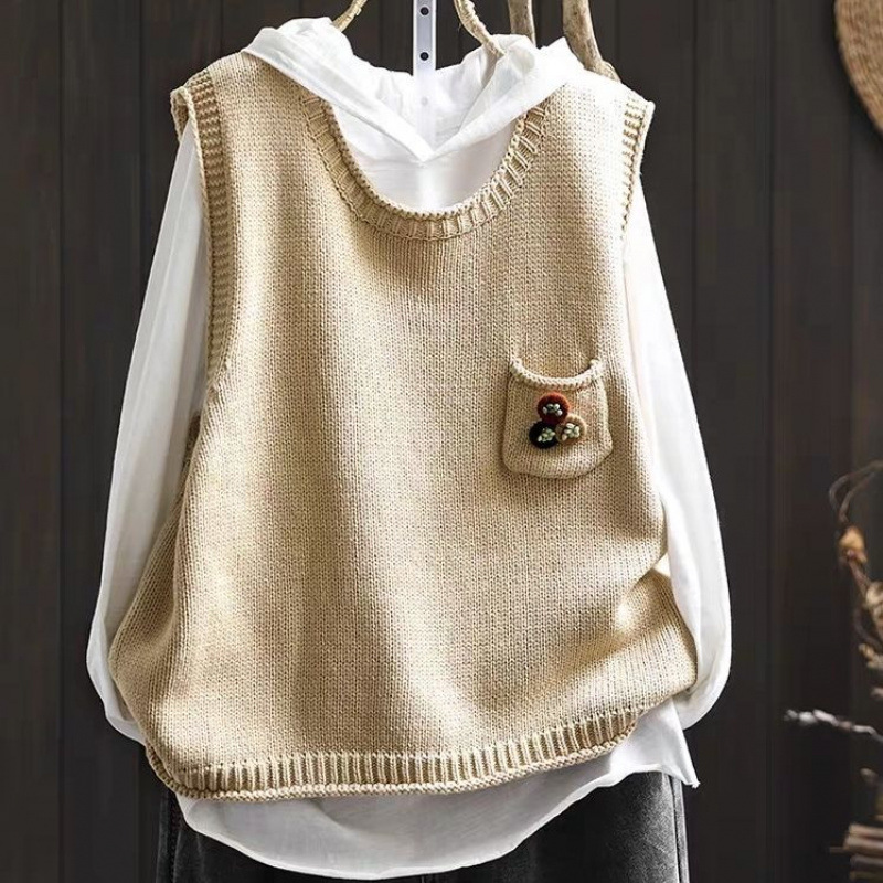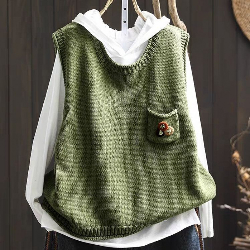 포켓 핸드 메이드 플라워 코튼 니트 조끼 여성 느슨한 봄 예술적 캐주얼 풀오버 민소매 코트