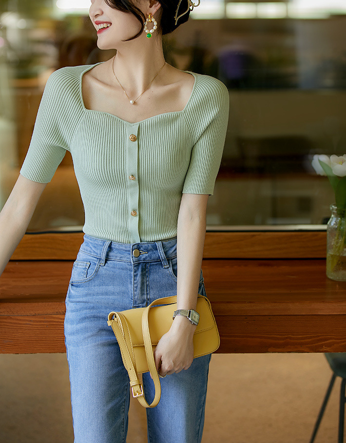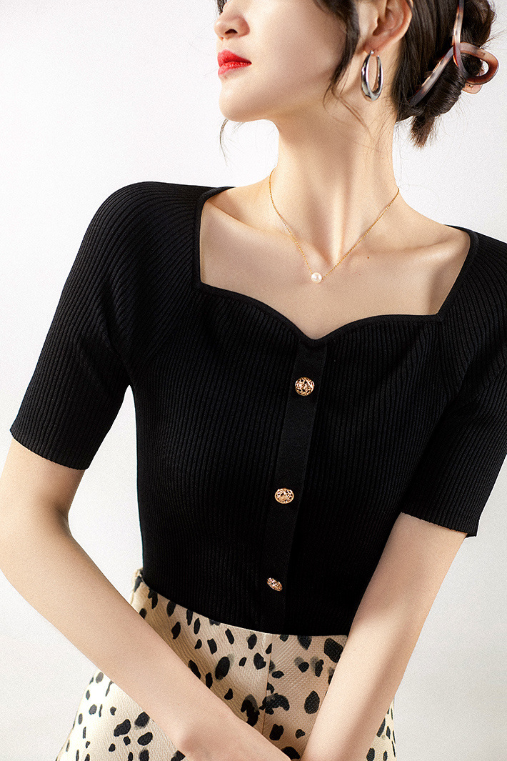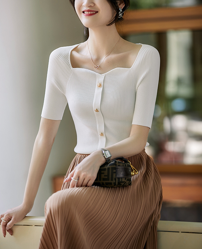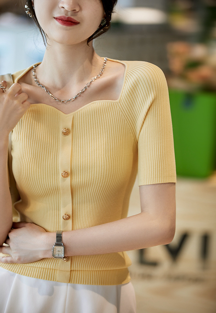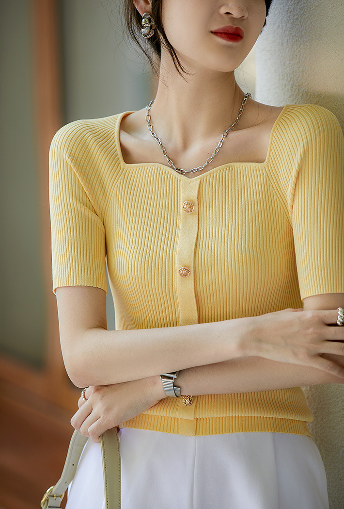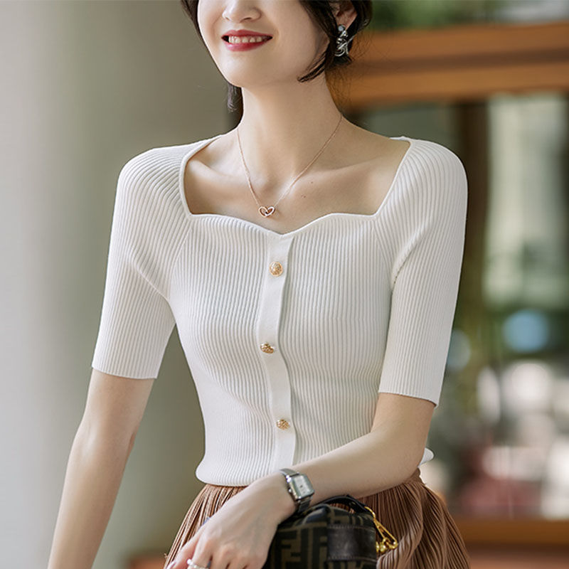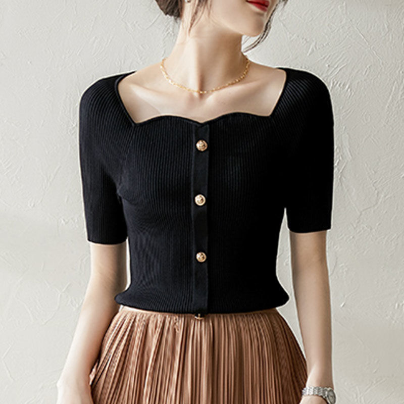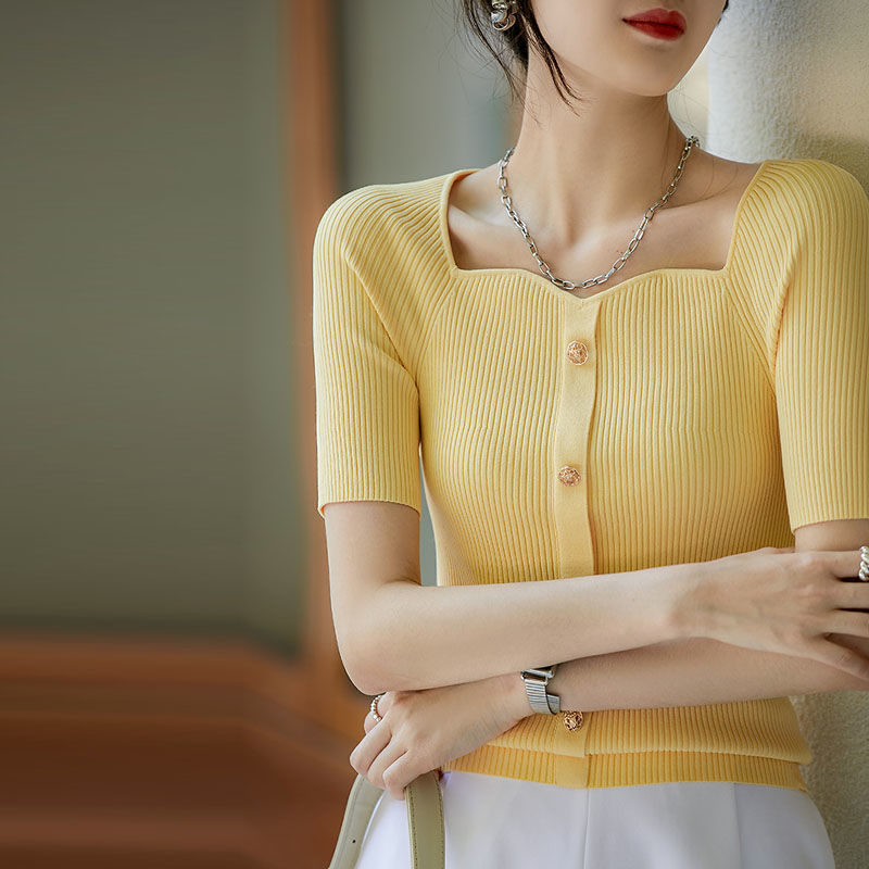 프랑스 스퀘어 칼라 반팔 티셔츠 여성 2024 여름 신식 서양식 아이스 실크 니트 스웨터 고급 쇼트 탑 씬스토어 가기