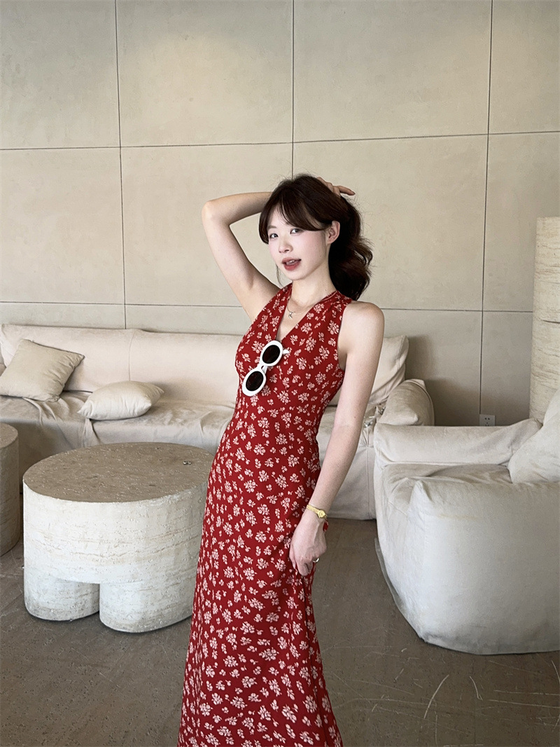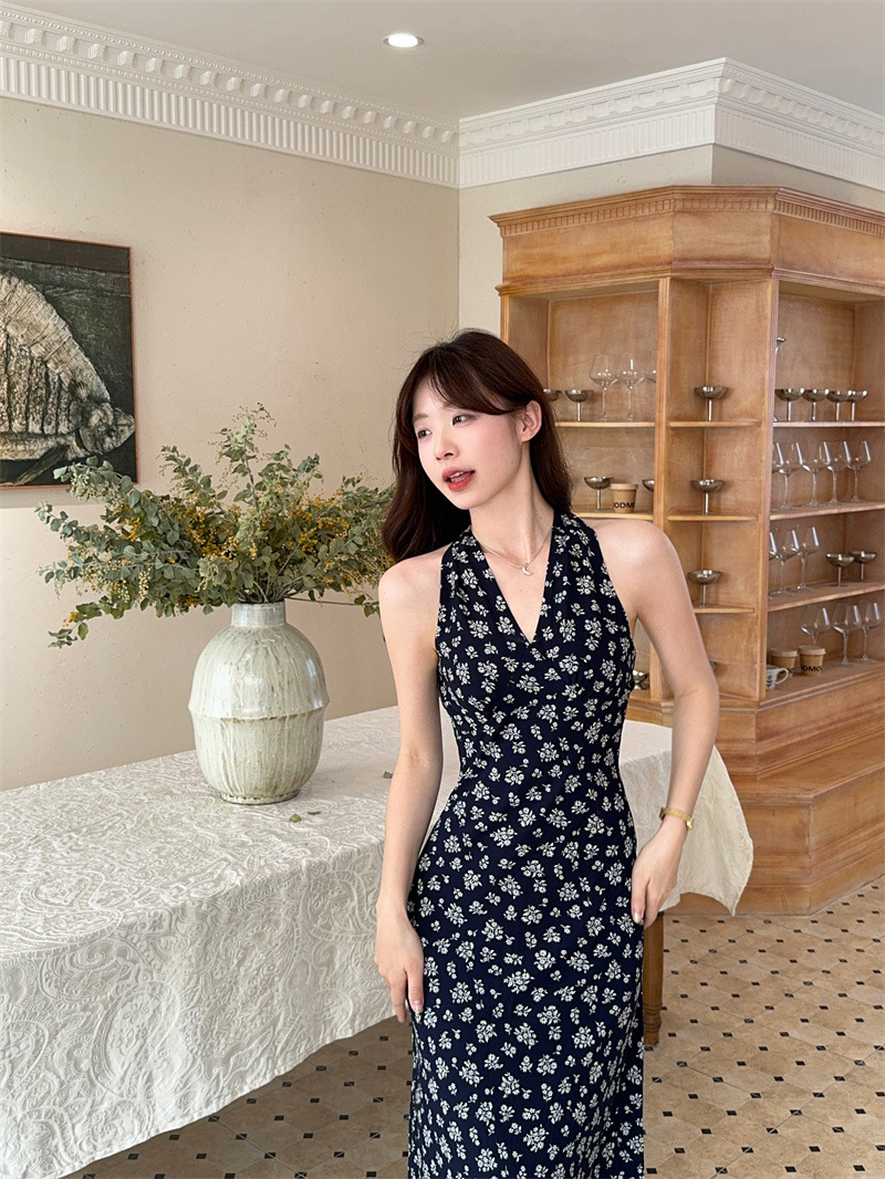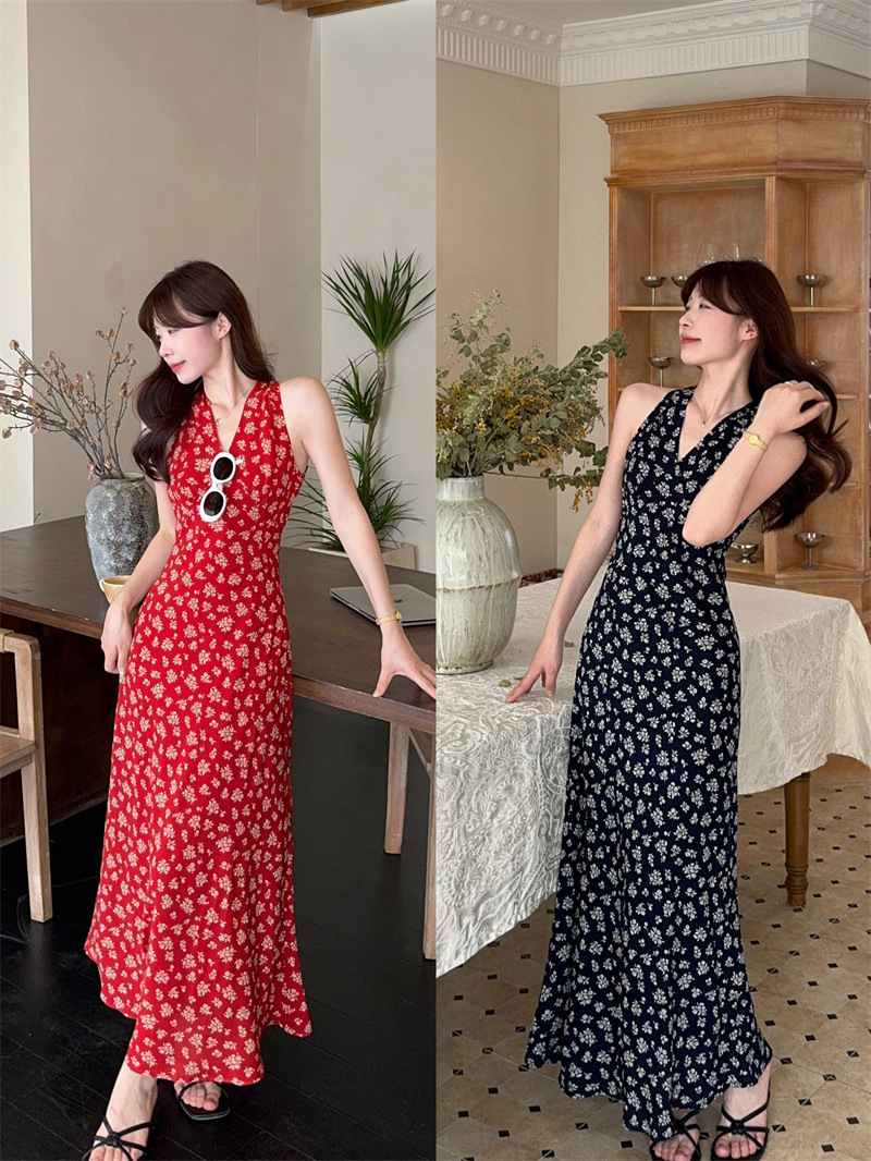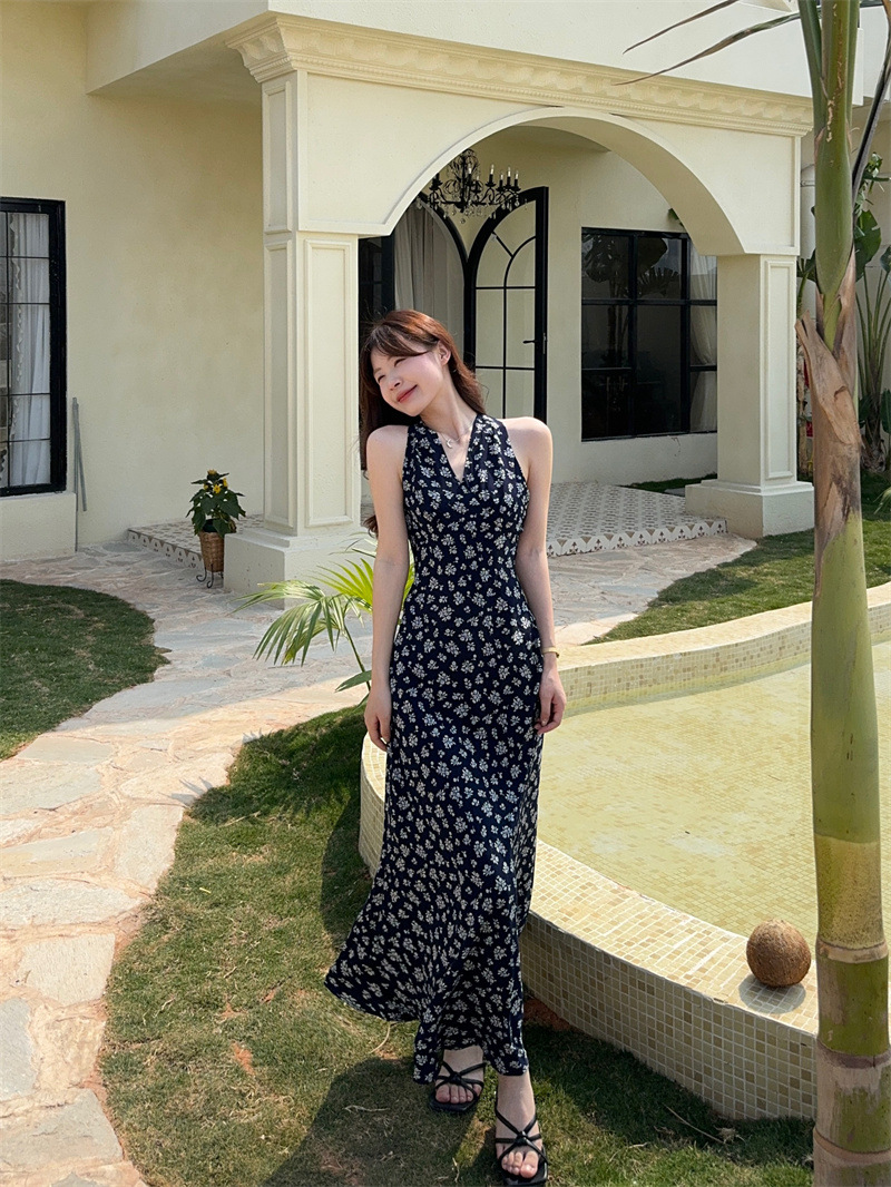 봄과 여름 긴 치마 78053 원피스 진짜 샷 ~ 순수한 욕망의 뜨거운 소녀 목 꽃 등이없는 접이식 휴일 분위기스토어 가기