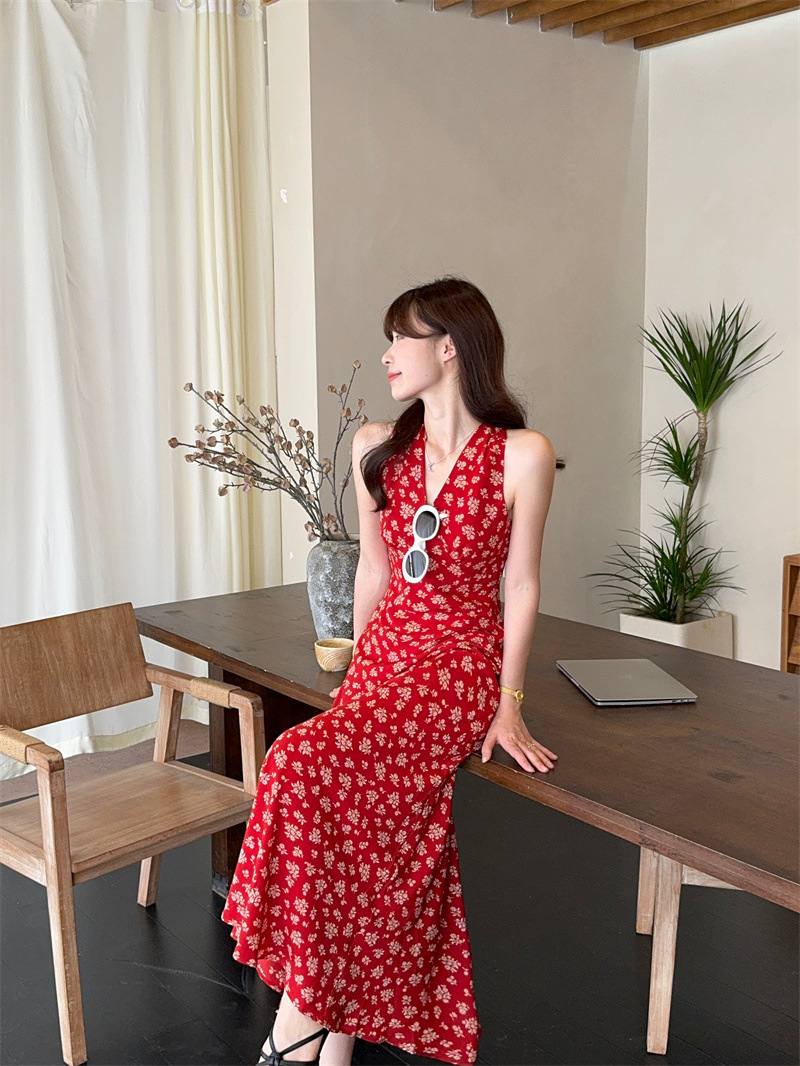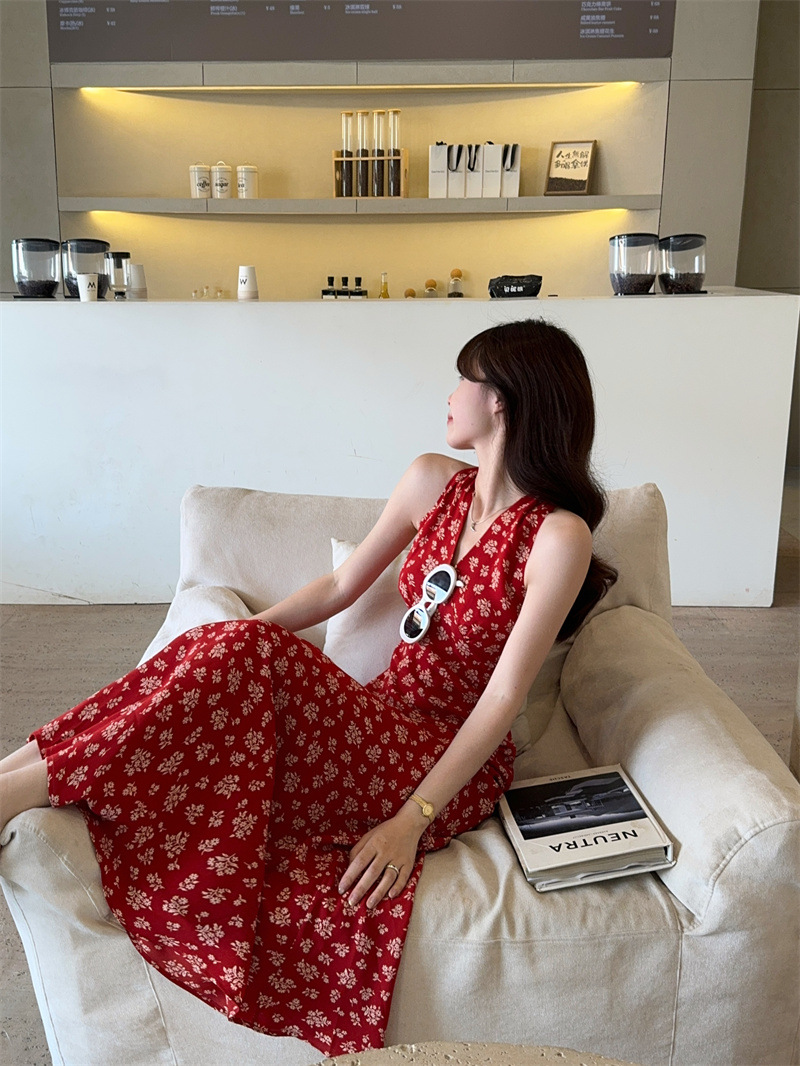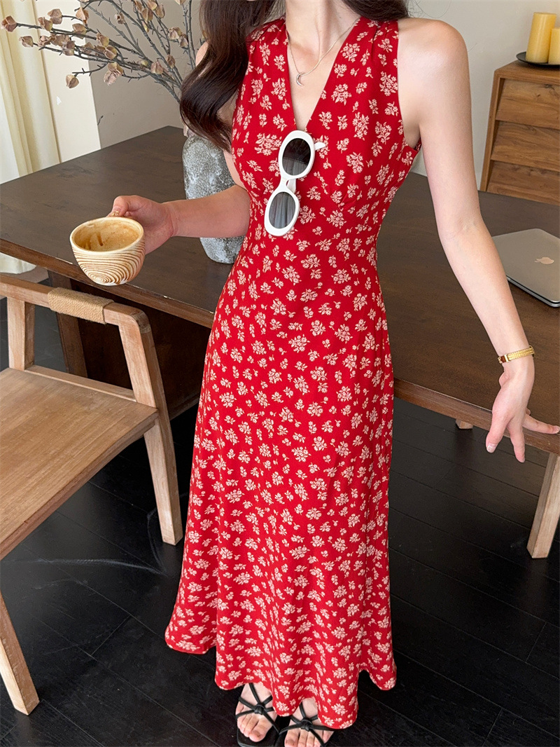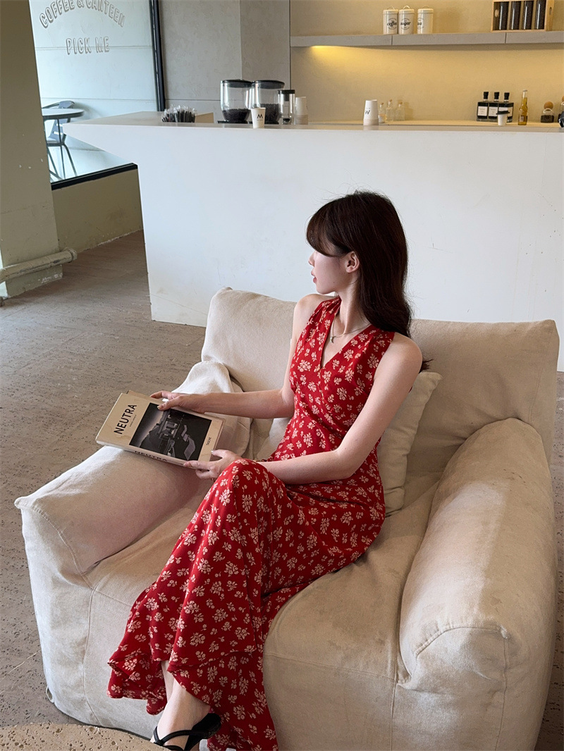 봄과 여름 긴 치마 78053 원피스 진짜 샷 ~ 순수한 욕망의 뜨거운 소녀 목 꽃 등이없는 접이식 휴일 분위기스토어 가기