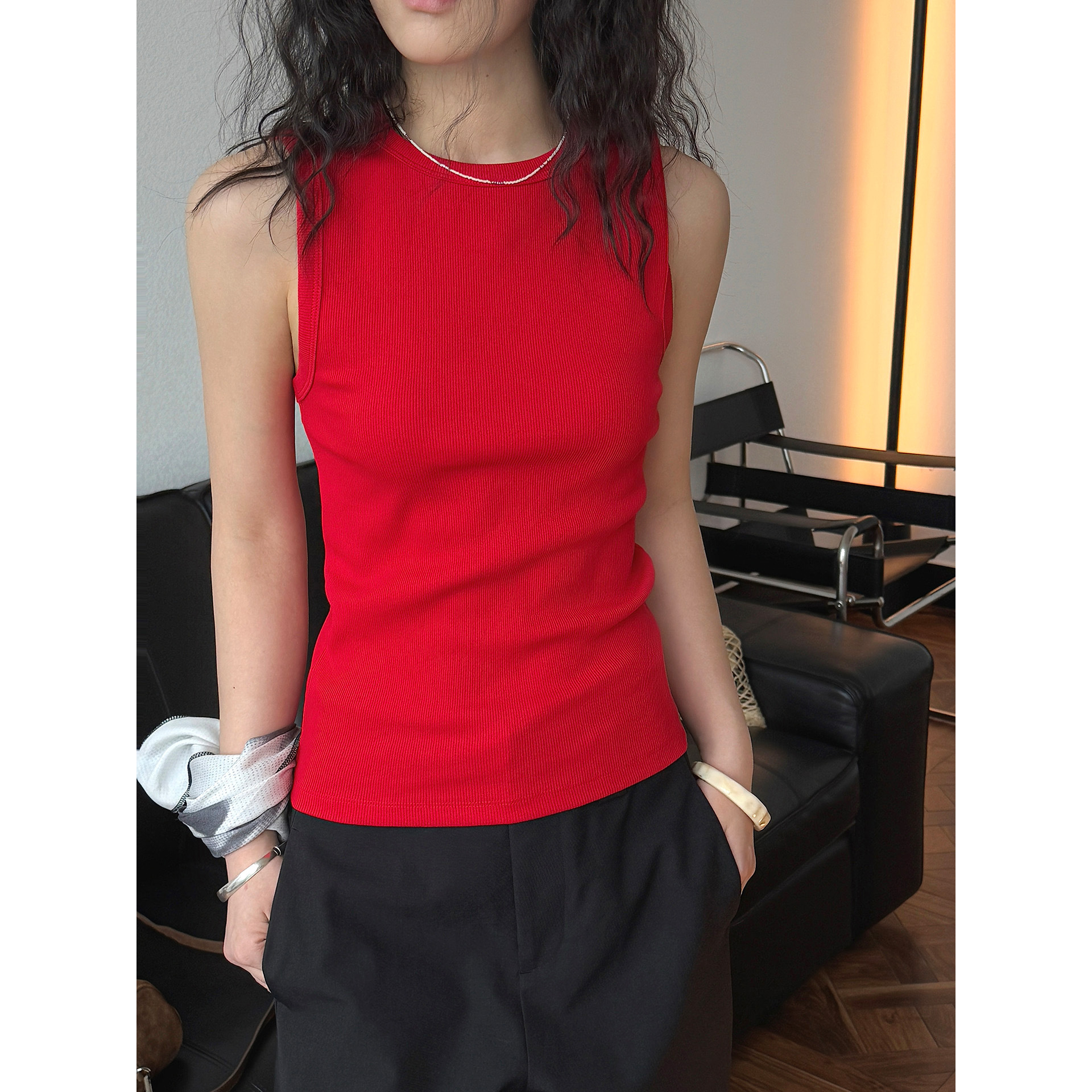 루푸 봄과 여름 새로운 한국식 캐주얼 컬러 리브 I 자형 조끼 슬림 핏 슬리밍 여성용 탄성 민소매 조끼