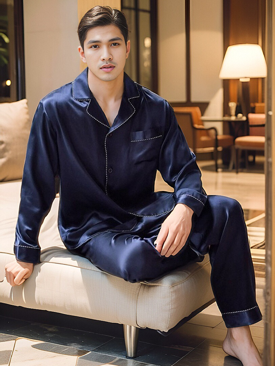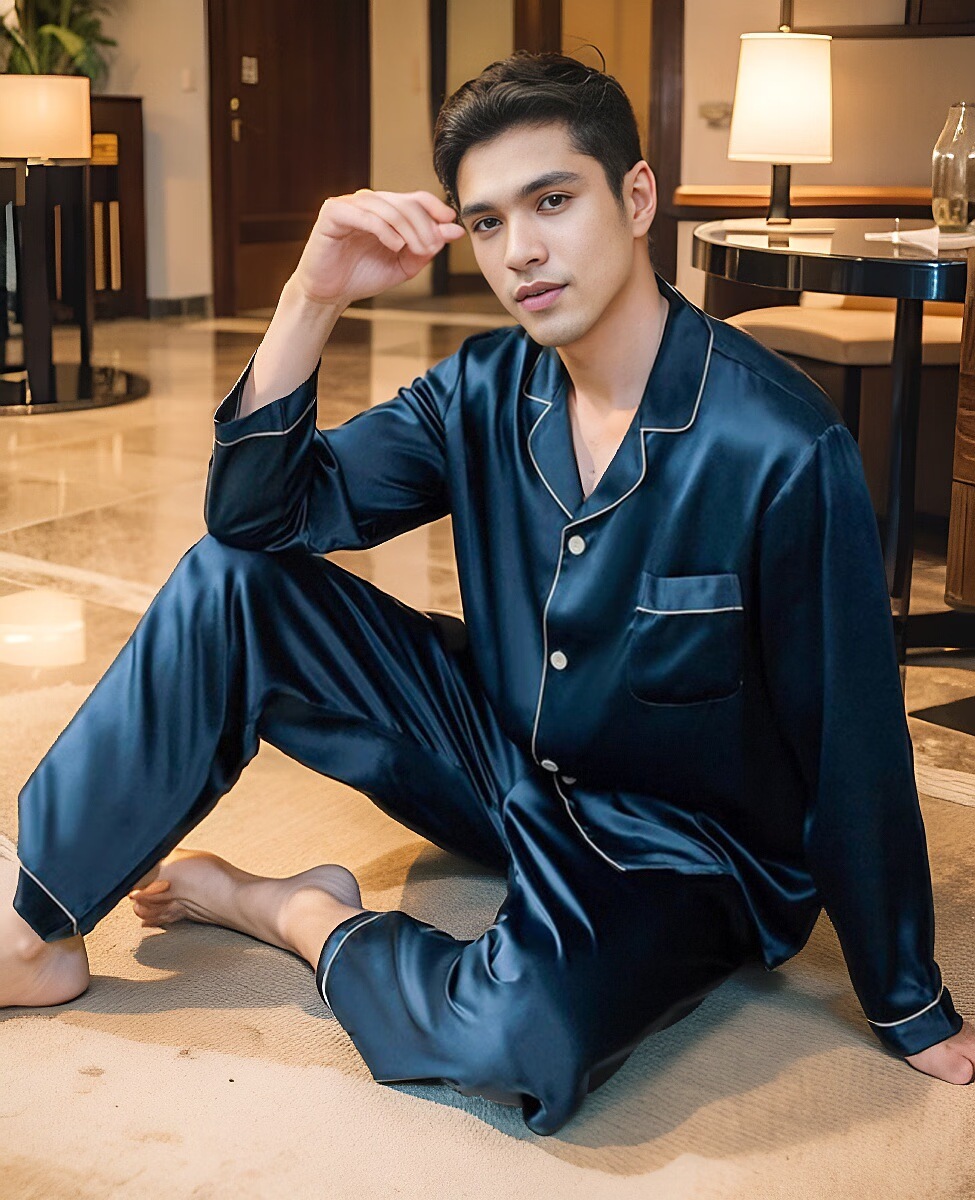 • [남성-네이비블루(파란색과 흰색 엣지) 뽕나무 실크 롱+롱슈트