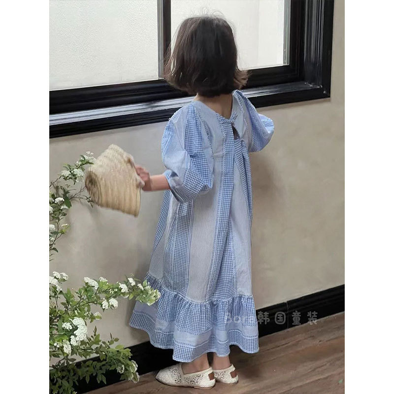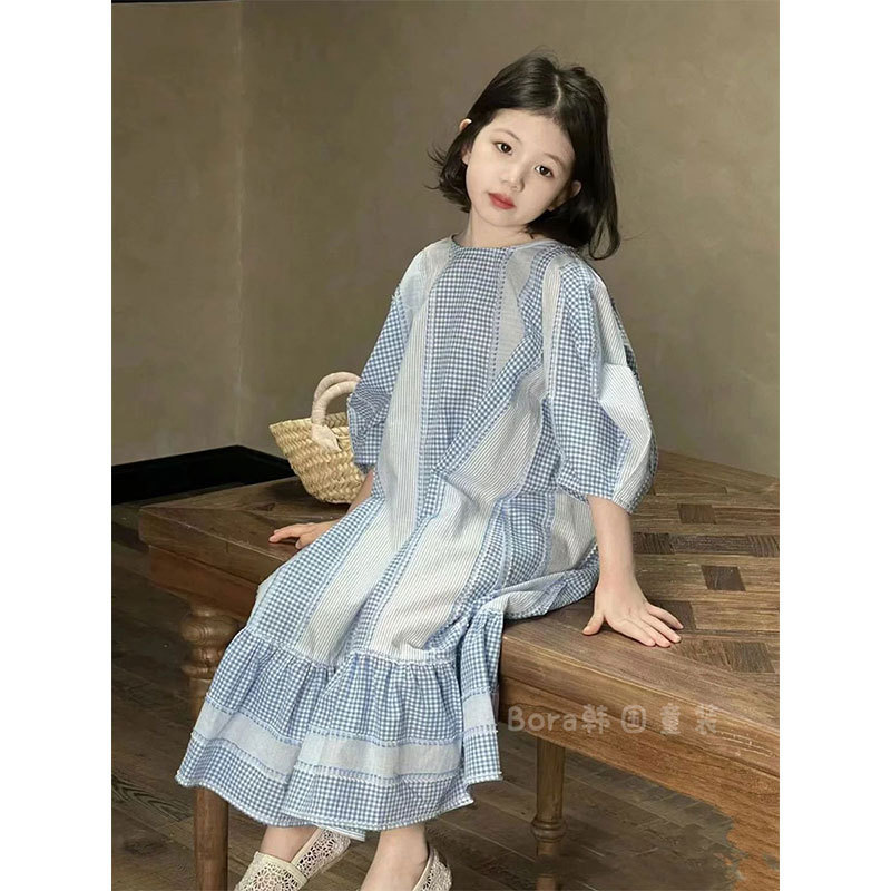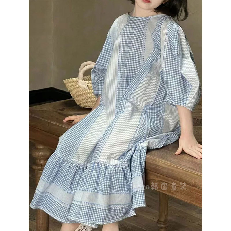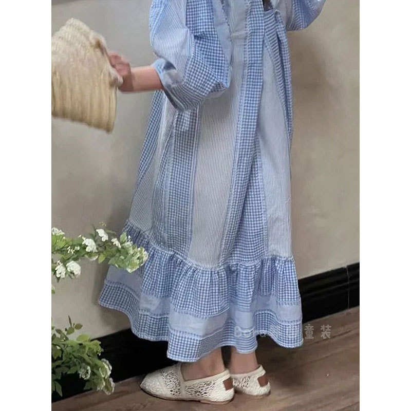 여아 드레스 여름 2025 새로운 스타일의 매우 아름답고 세련된 파란색 스커트, 큰 어린이 해변 휴가 비치 스커트, 얇은스토어 가기