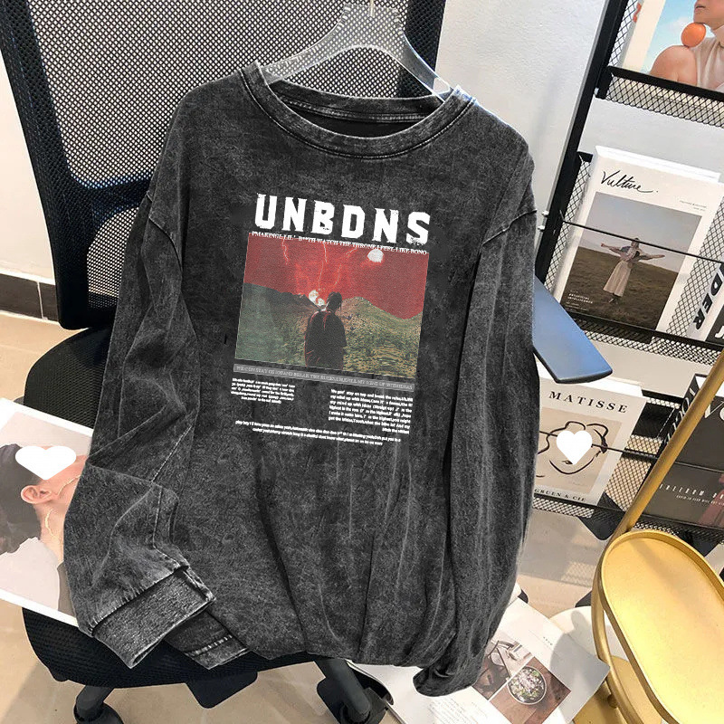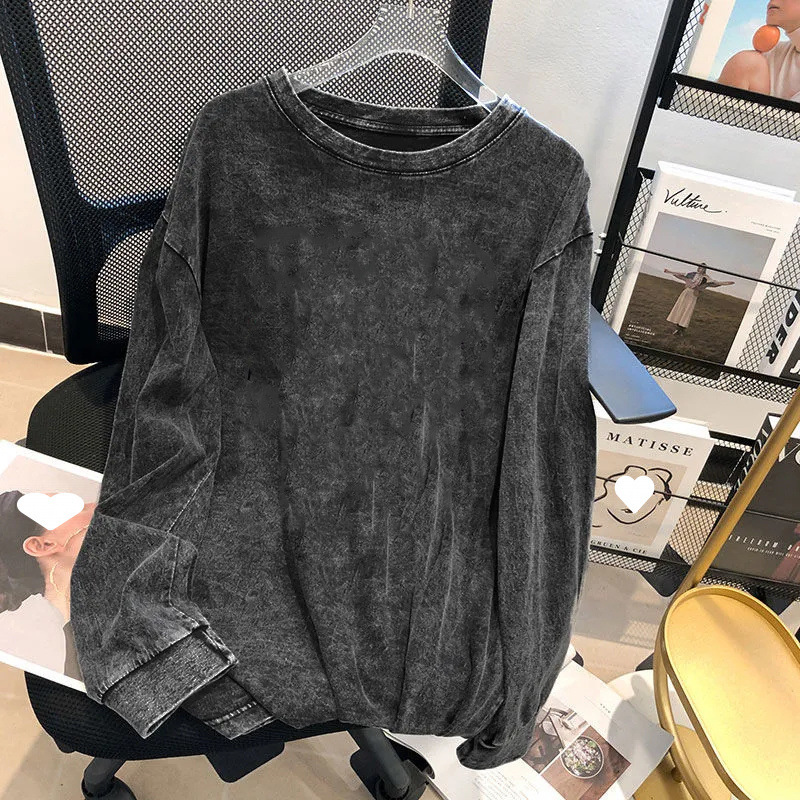 가을 씻은 올드 블랙 빈티지 헤비 뉴 남성 하이 스트리트 아메리칸 크루 넥 롱 슬리브 티셔츠 탑 옷