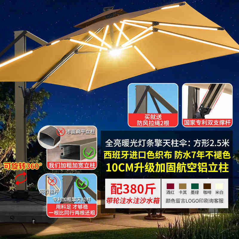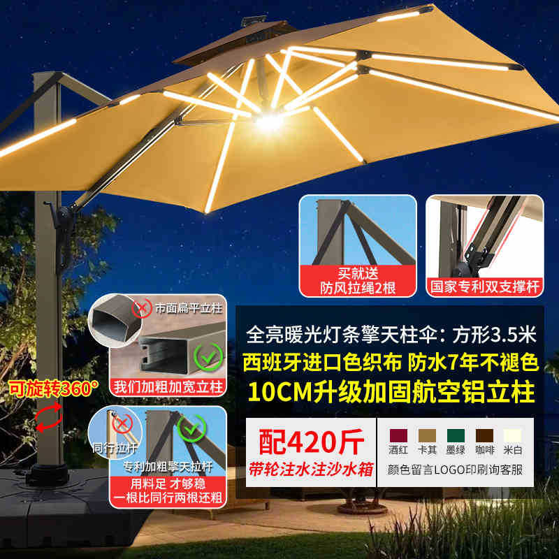 태양광 충전식 안뜰 대형 우산, 야외 파라솔, 상업용 파라솔, 커피숍 4각 우산, 테라스 로마 우산