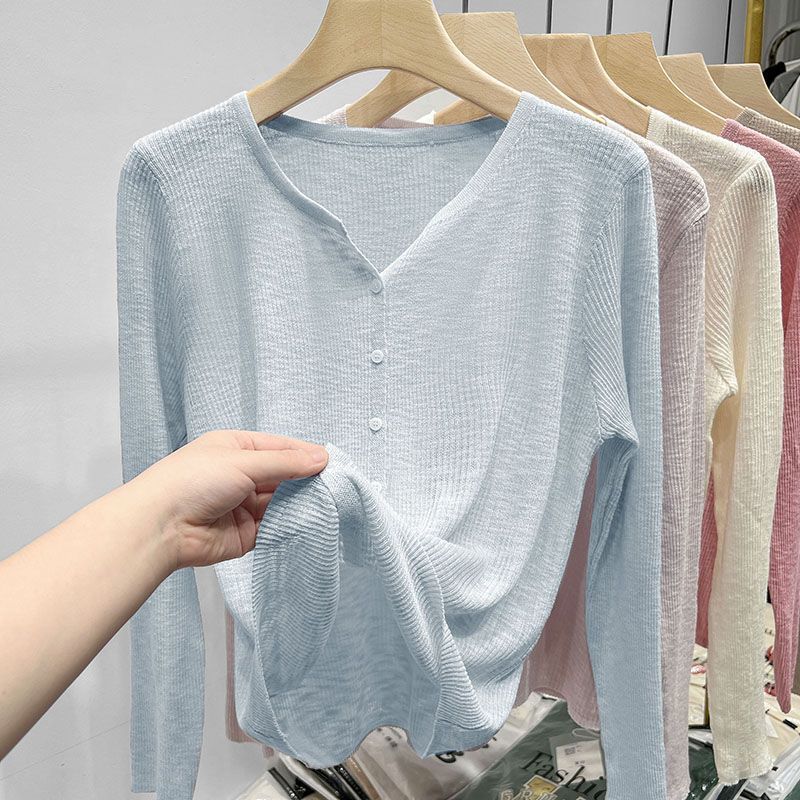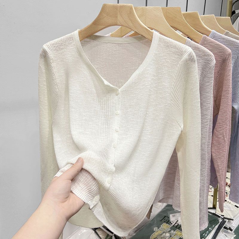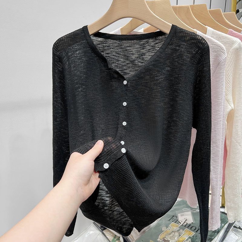 여름 아이스 실크 선 스크린 카디건 여성 외관 디자인 얇은 매칭 서스펜더 스커트 긴팔 스웨터 코트 탑스토어 가기