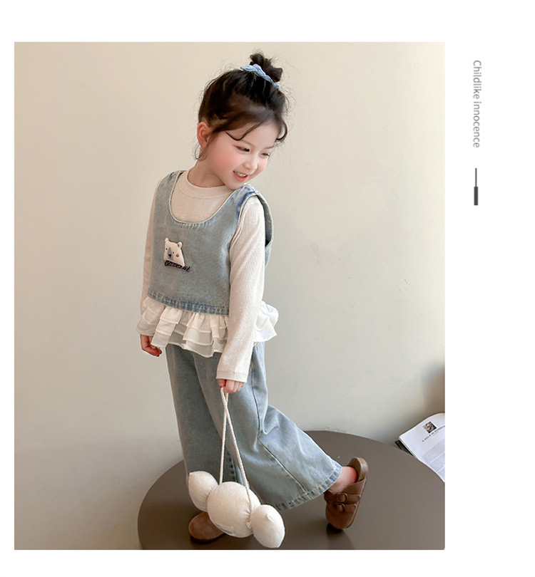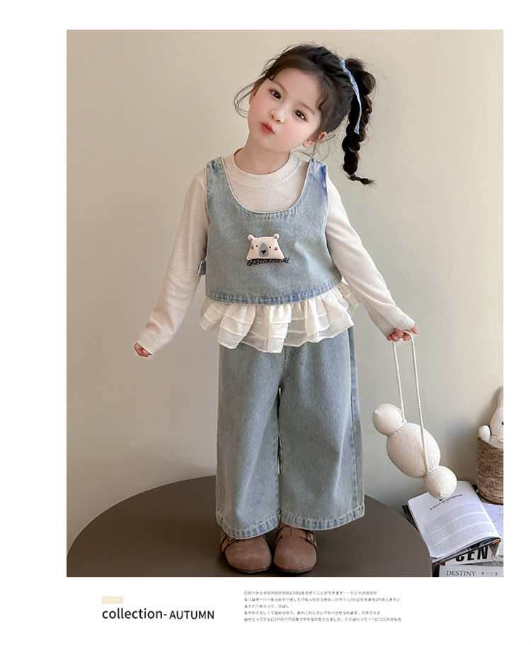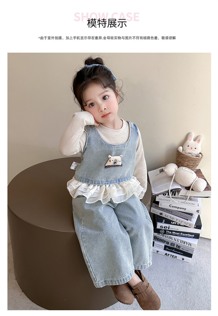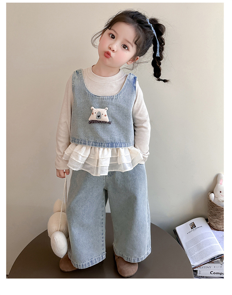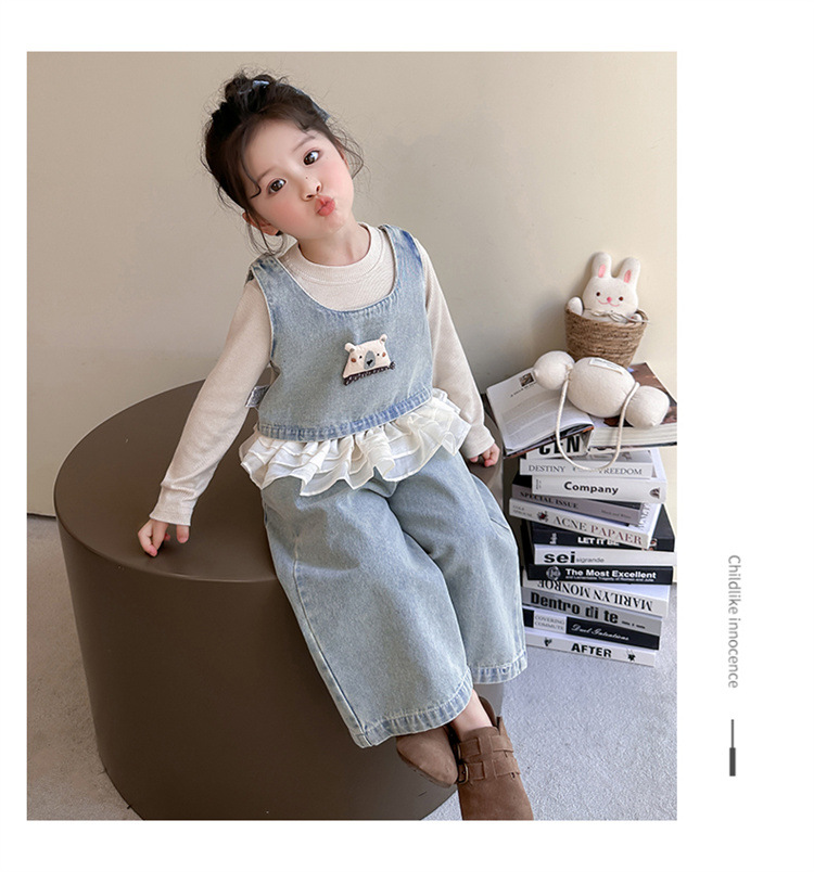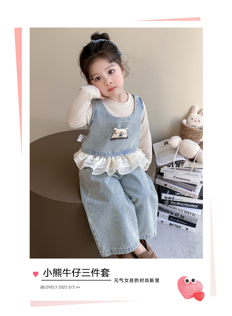 여자 곰 데님 3 조각 세트 봄과 가을 2025 새로운 패션 작은 소녀 넓은 다리 바지 셔츠 스트랩 세트스토어 가기