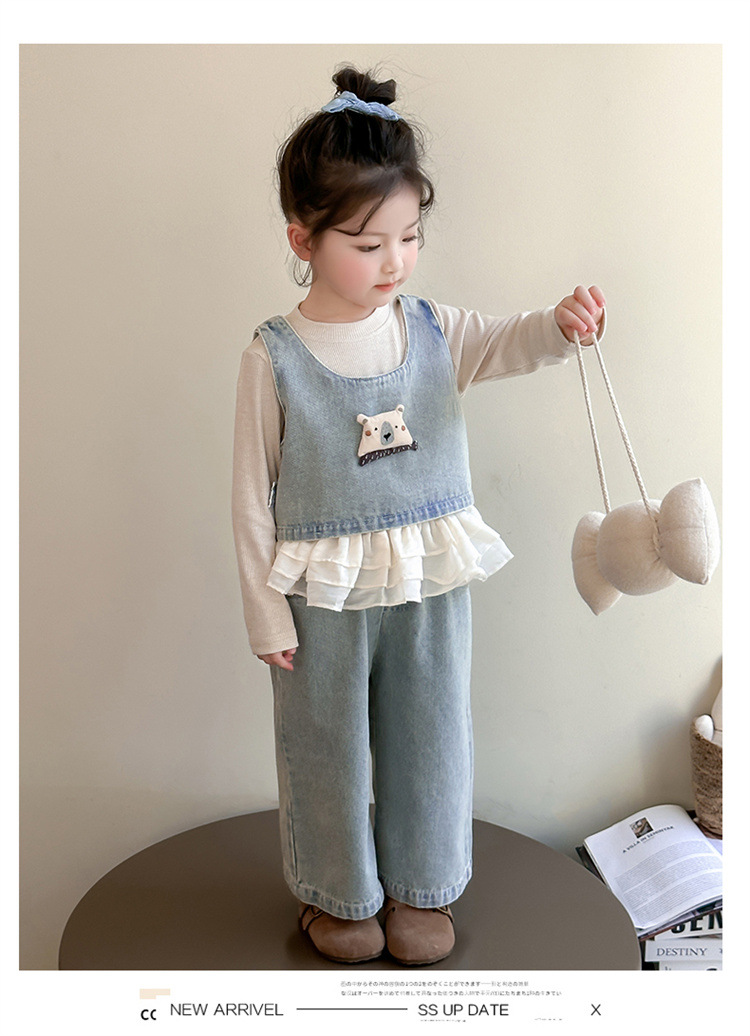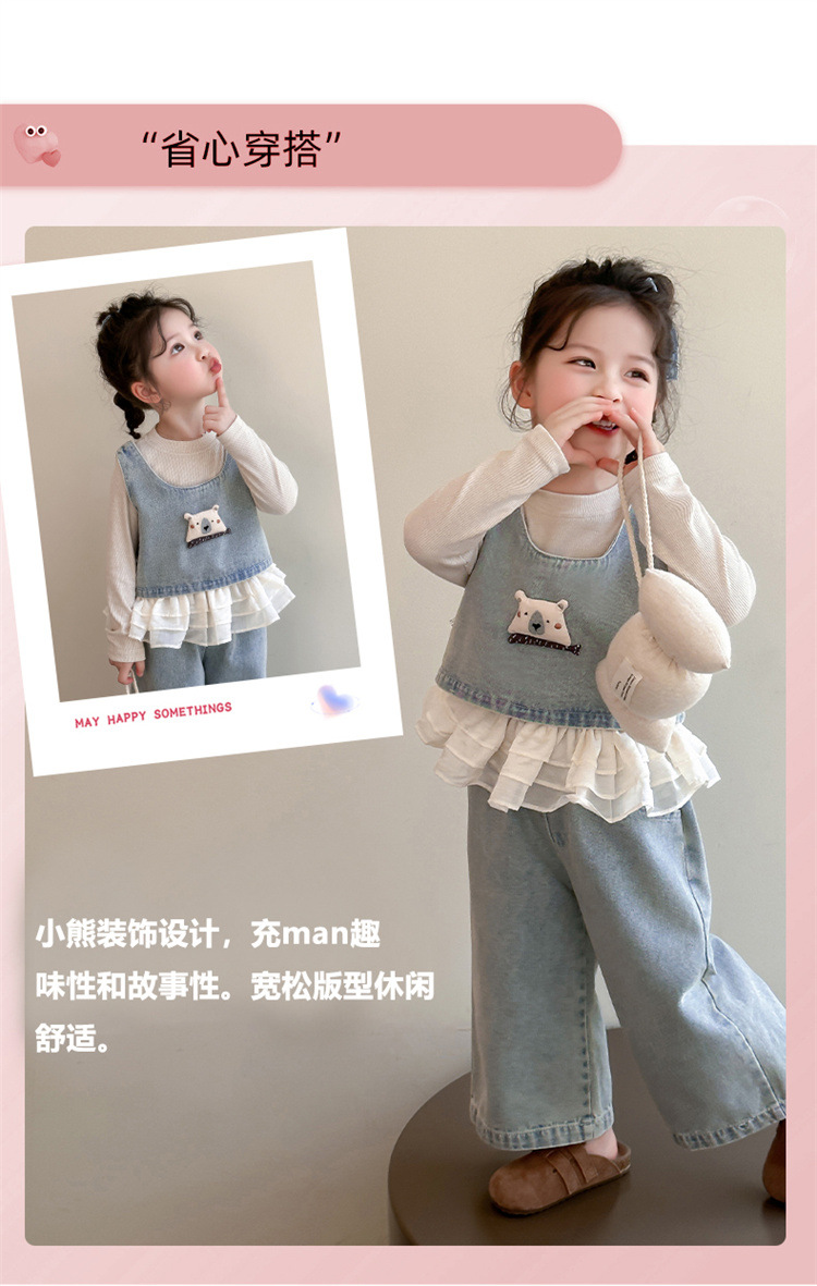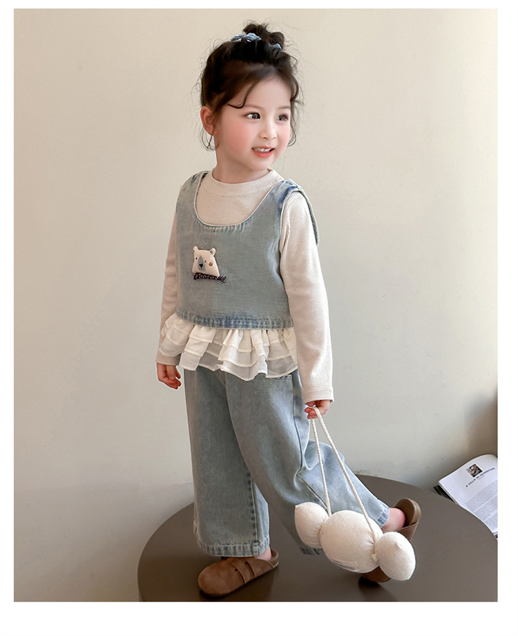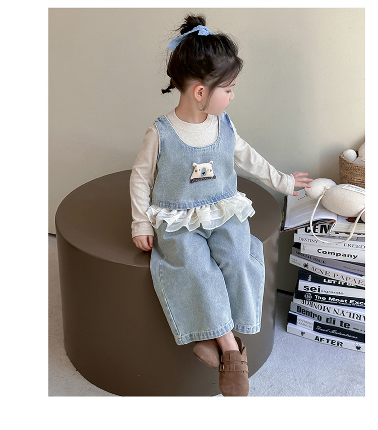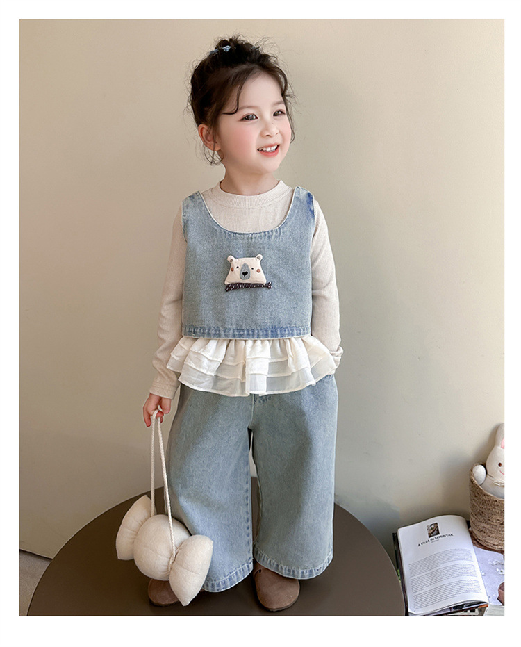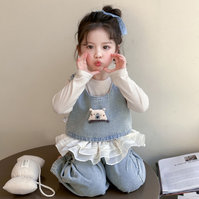 여자 곰 데님 3 조각 세트 봄과 가을 2025 새로운 패션 작은 소녀 넓은 다리 바지 셔츠 스트랩 세트스토어 가기