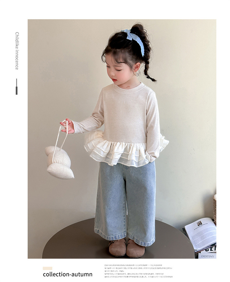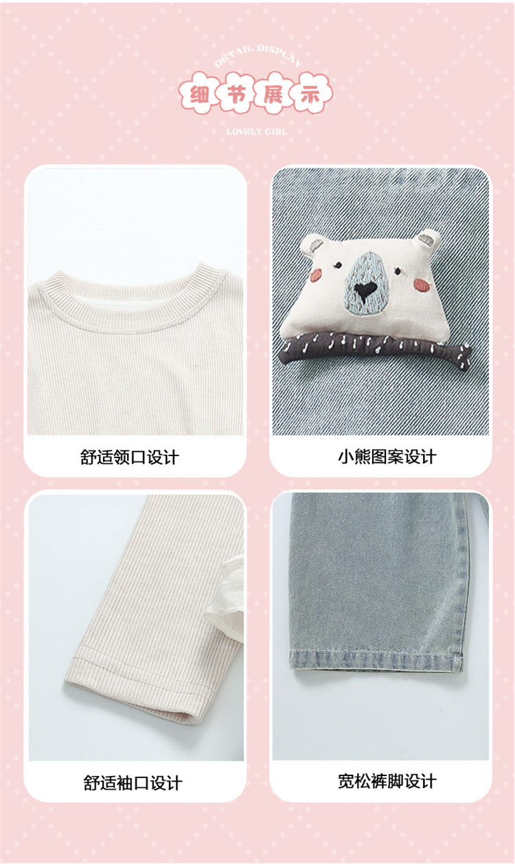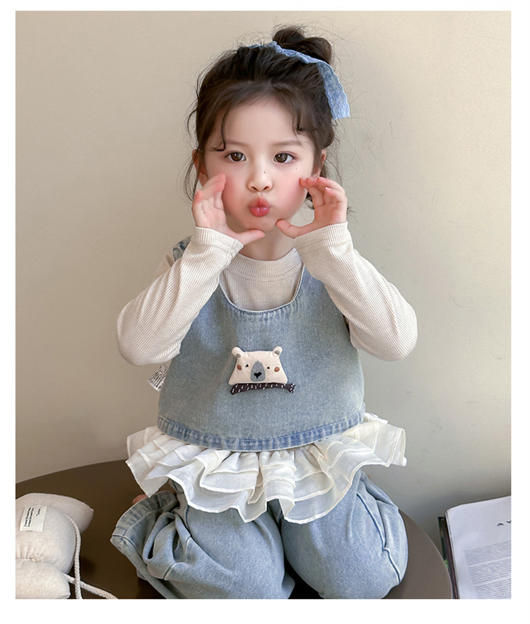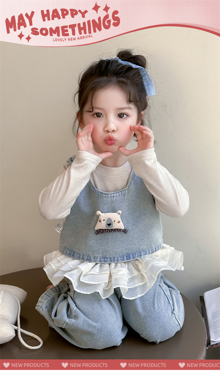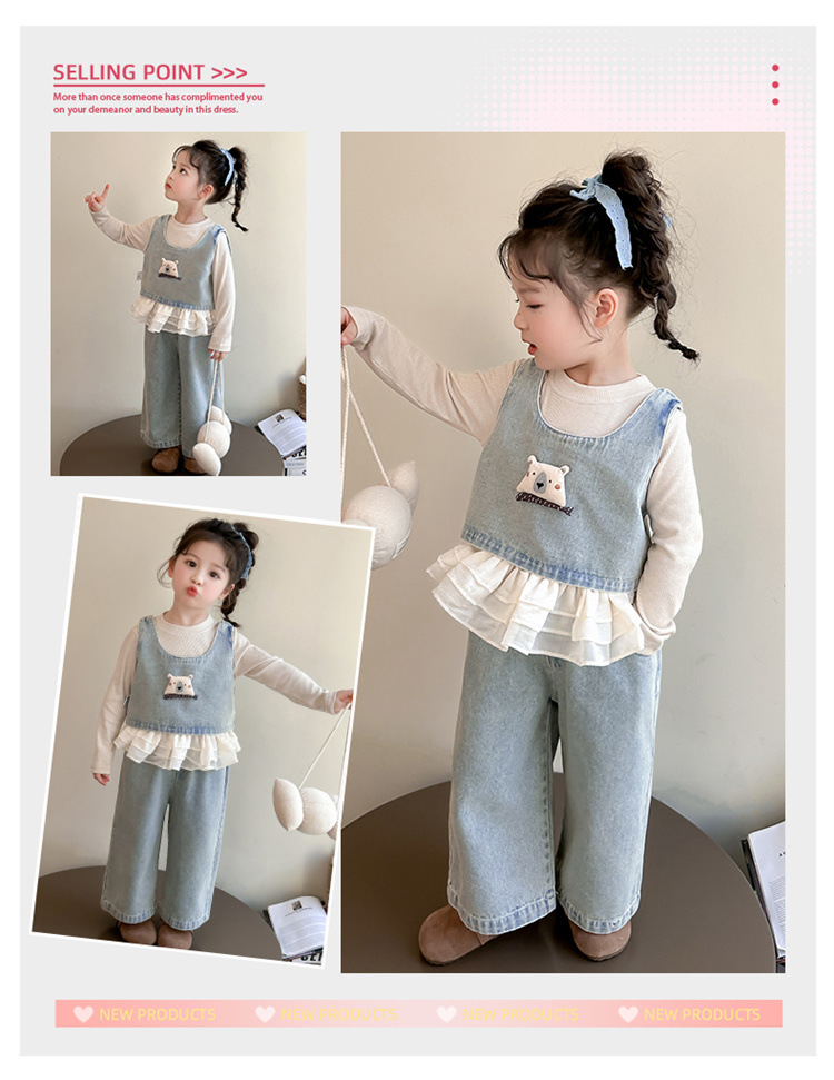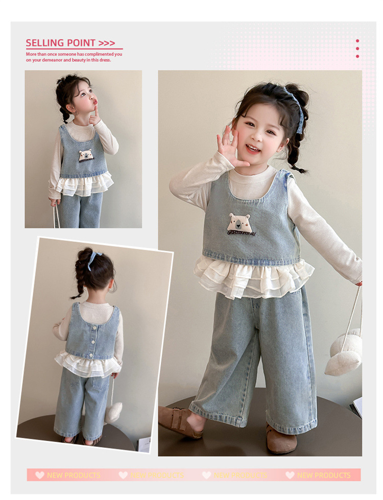 여자 곰 데님 3 조각 세트 봄과 가을 2025 새로운 패션 작은 소녀 넓은 다리 바지 셔츠 스트랩 세트스토어 가기
