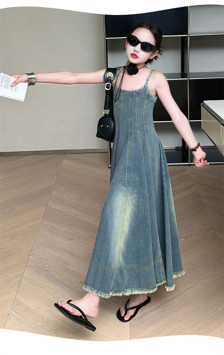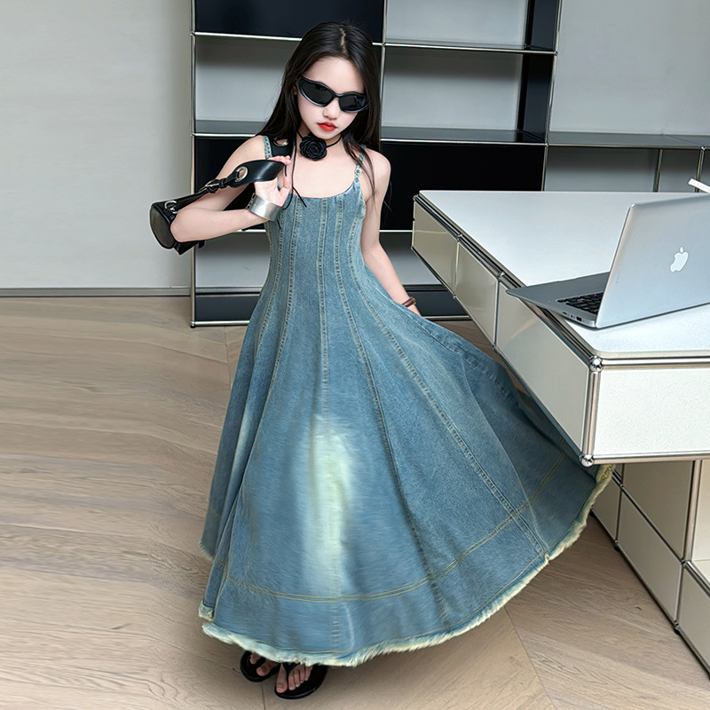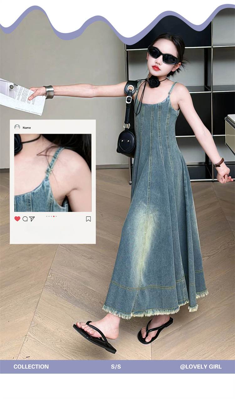 소녀 2025 새로운 여름 프랑스 스타일 레트로 데님 큰 반지와 슬림 핏 슬립 스커트 트렌디 한 소녀 스커트 원피스