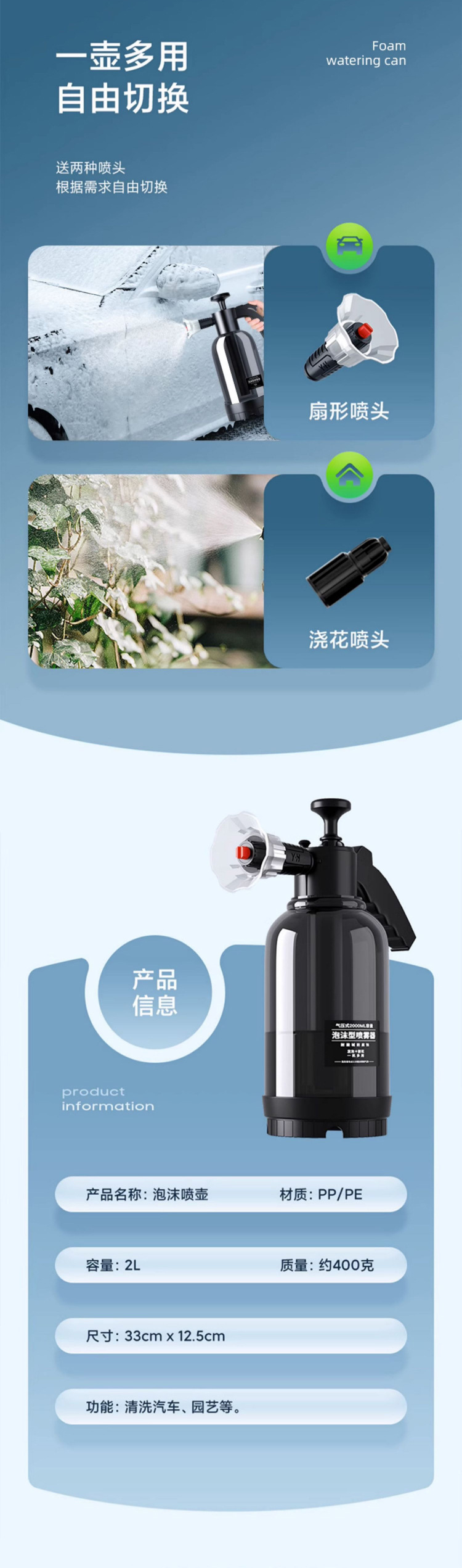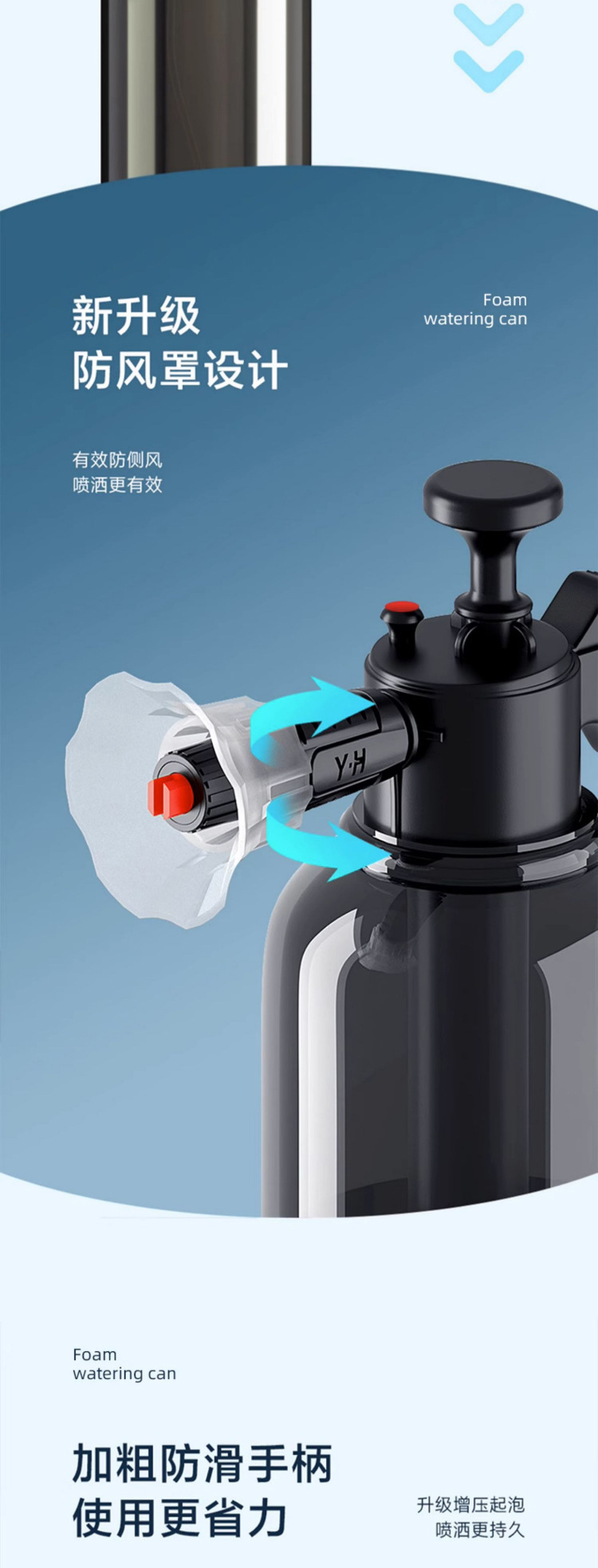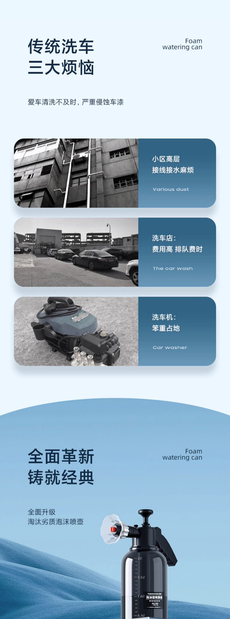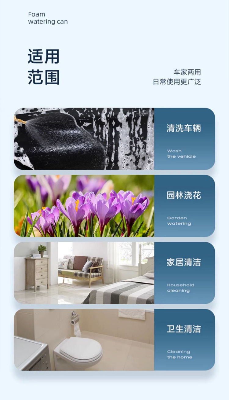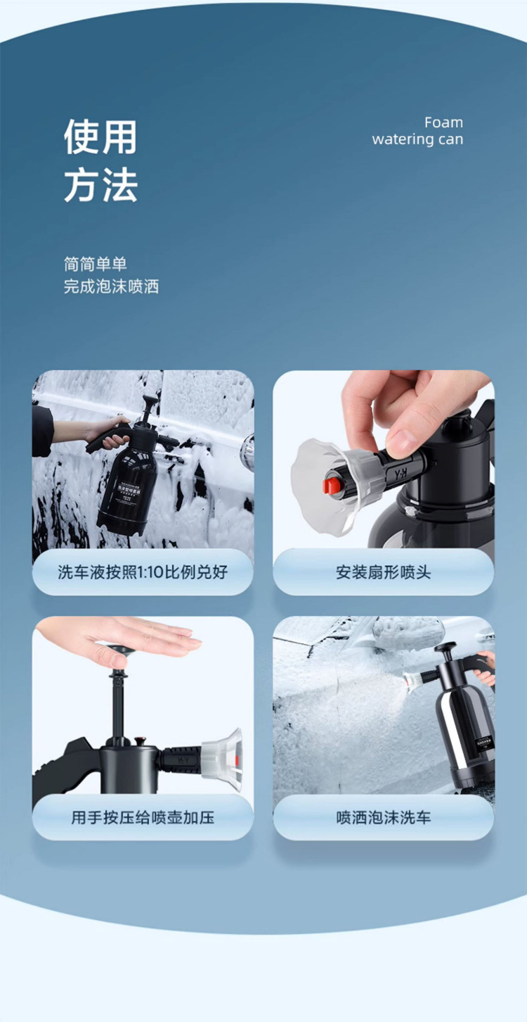 注:泡沫壶壶体有刻度线,加水不能超1.5L,洗车液和水比列1:50,气泡效果更佳。