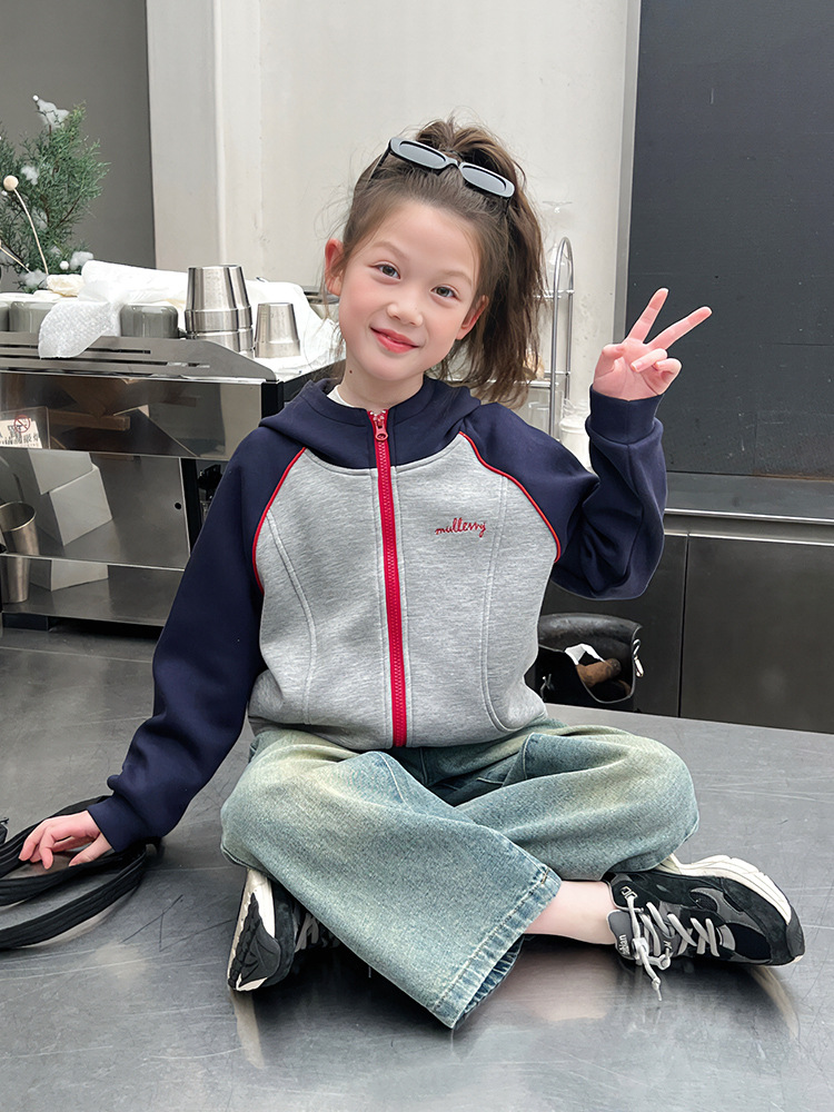 소녀 대비 컬러 스포츠 카디건 어린이 후드 라글란 슬리브 코트 대형 아동복 서양식 탑 2025 봄 새로운 스타일스토어 가기