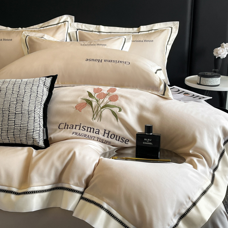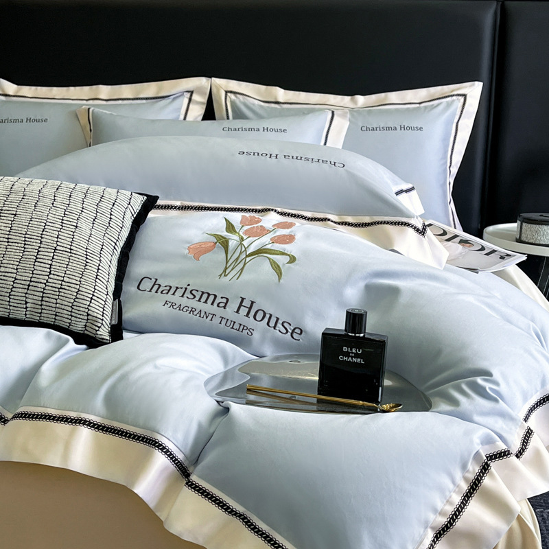 유럽식 작은 샤넬 스타일 아이스 실크 4 피스 세트 여름 실키 슬리핑 알몸 침구 라이트 럭셔리 하이 엔드 감각 침구 3 피스 세트