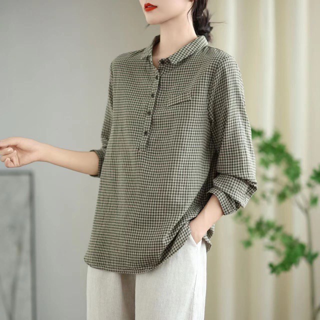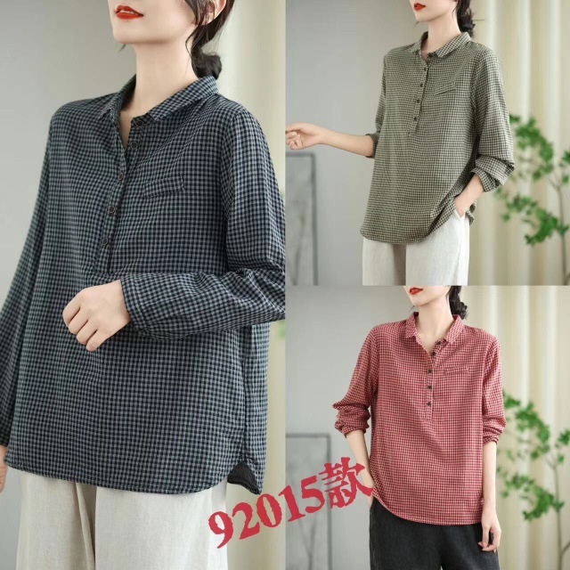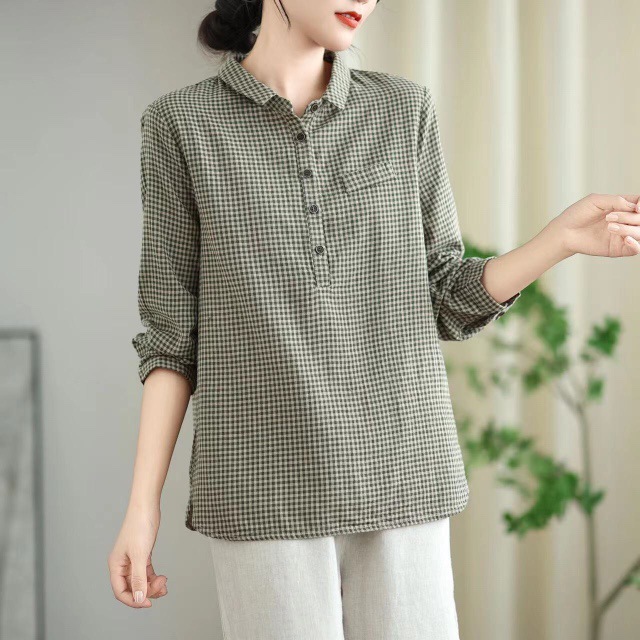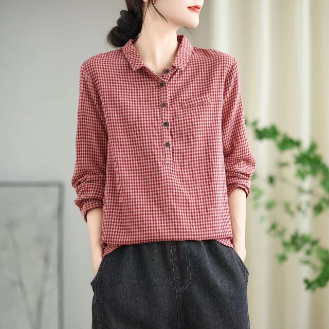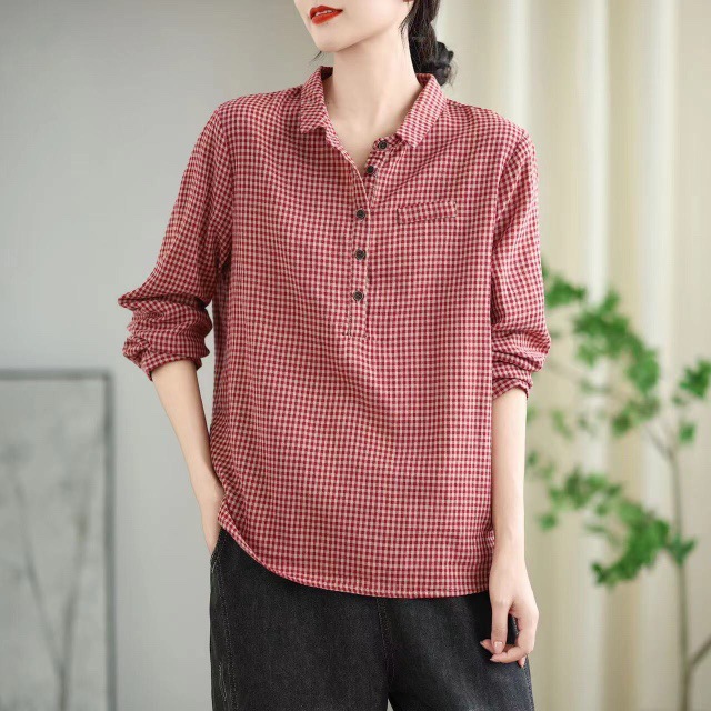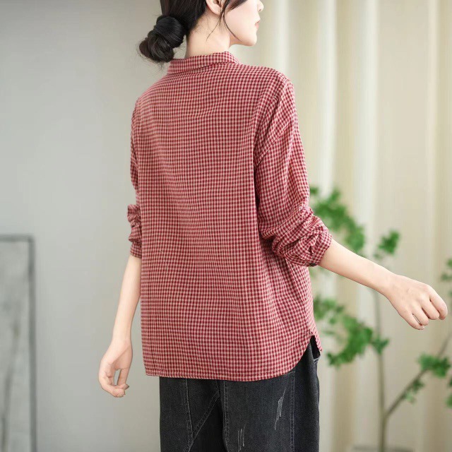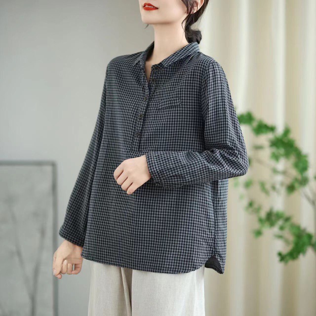 2025 봄 새로운 격자 무늬 긴팔 셔츠 여성용 느슨한 슬리밍 예술적 캐주얼 하프 오픈 칼라 탑