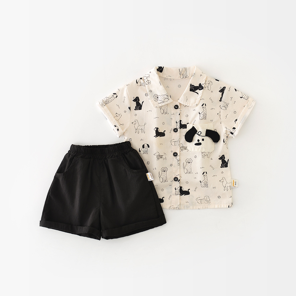Yue Ji 의류 여름 어린이 옷깃 반팔 투피스 세트 아기와 어린 아이들의 풀 프린트 강아지 셔츠 세트 52755