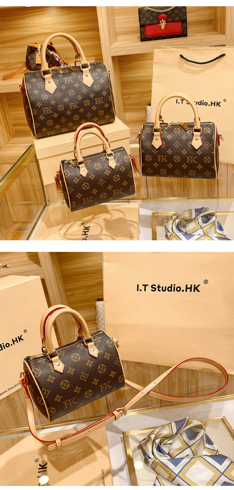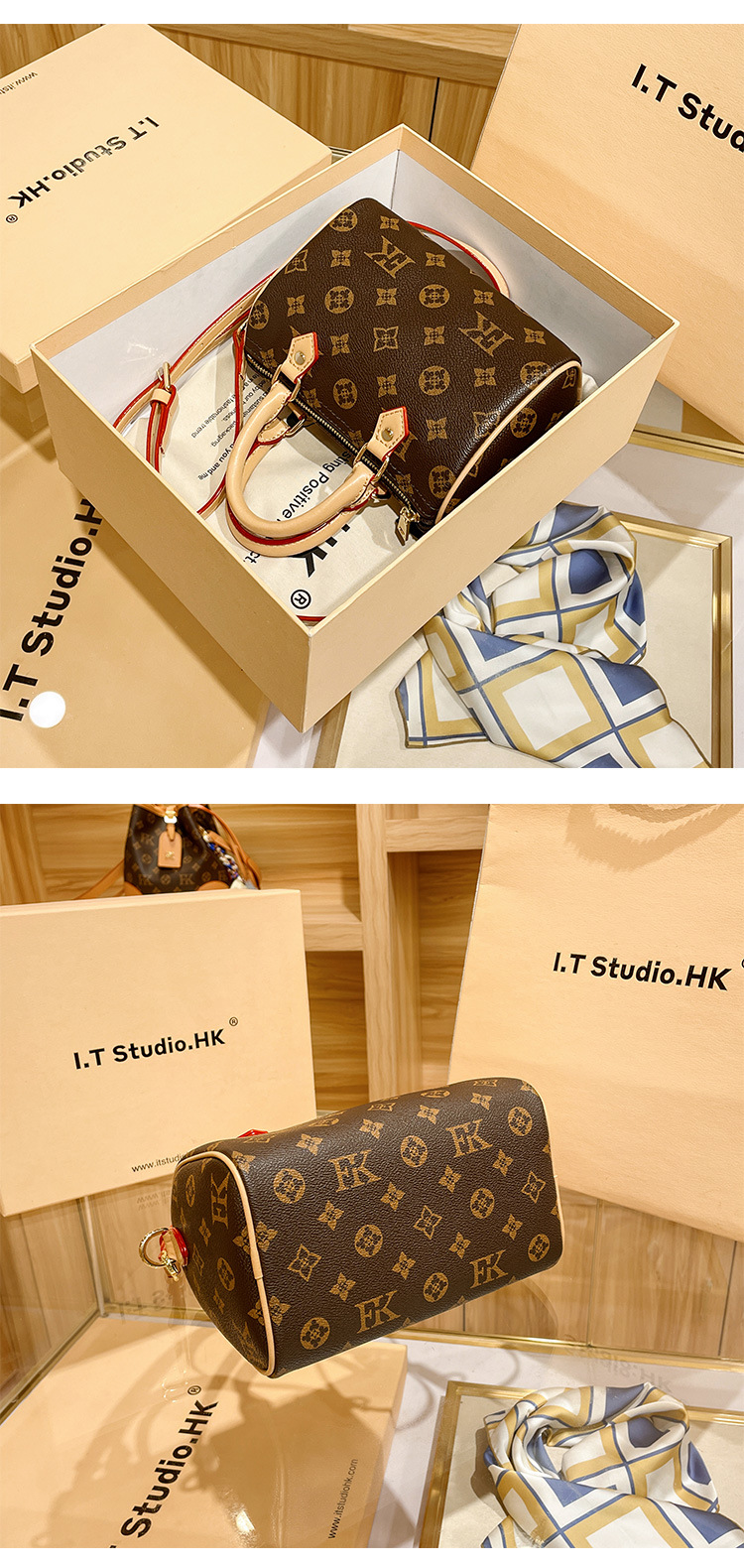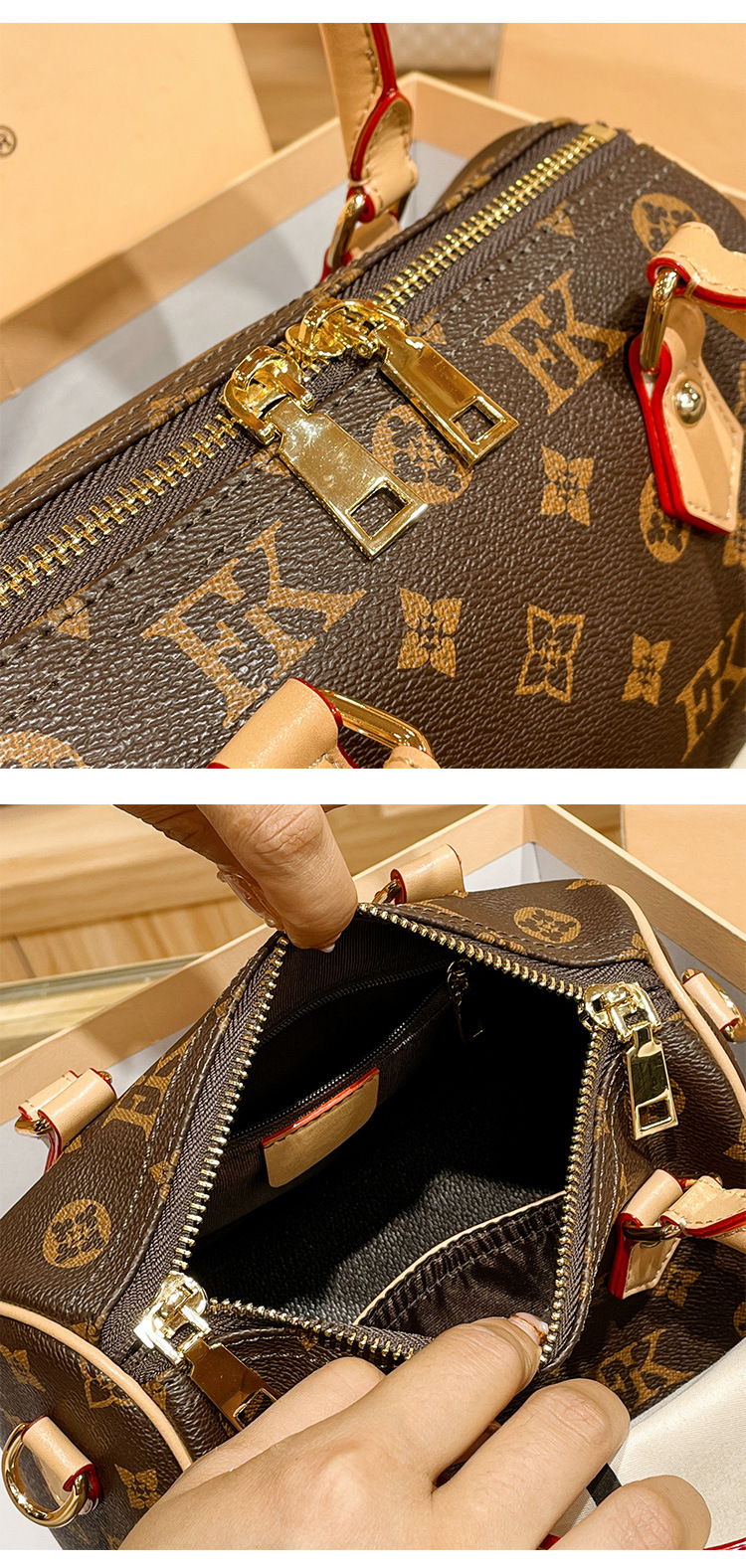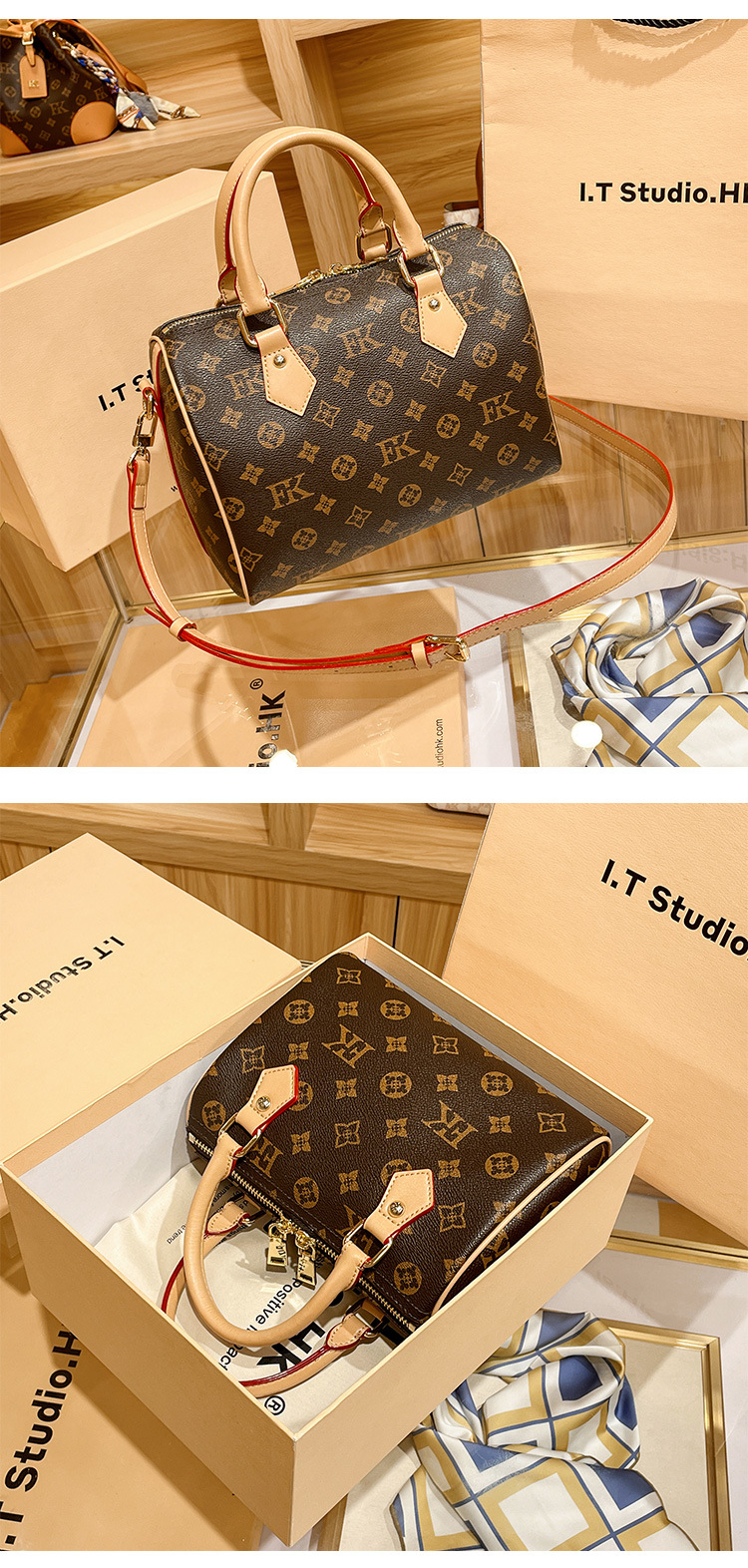 香港专柜真皮波士顿枕头包包女式2024新款秋冬时尚老花手提斜挎包