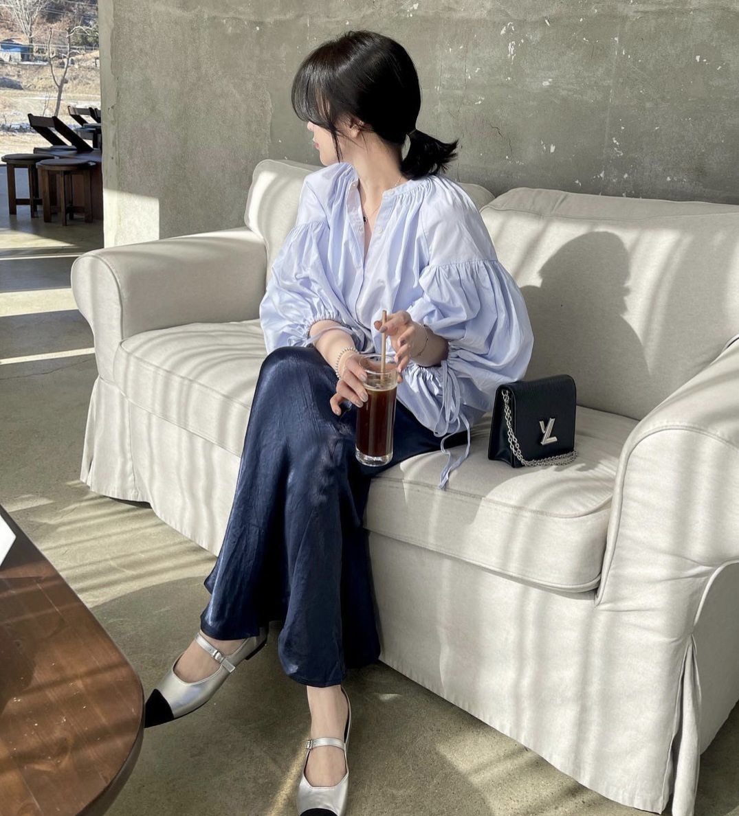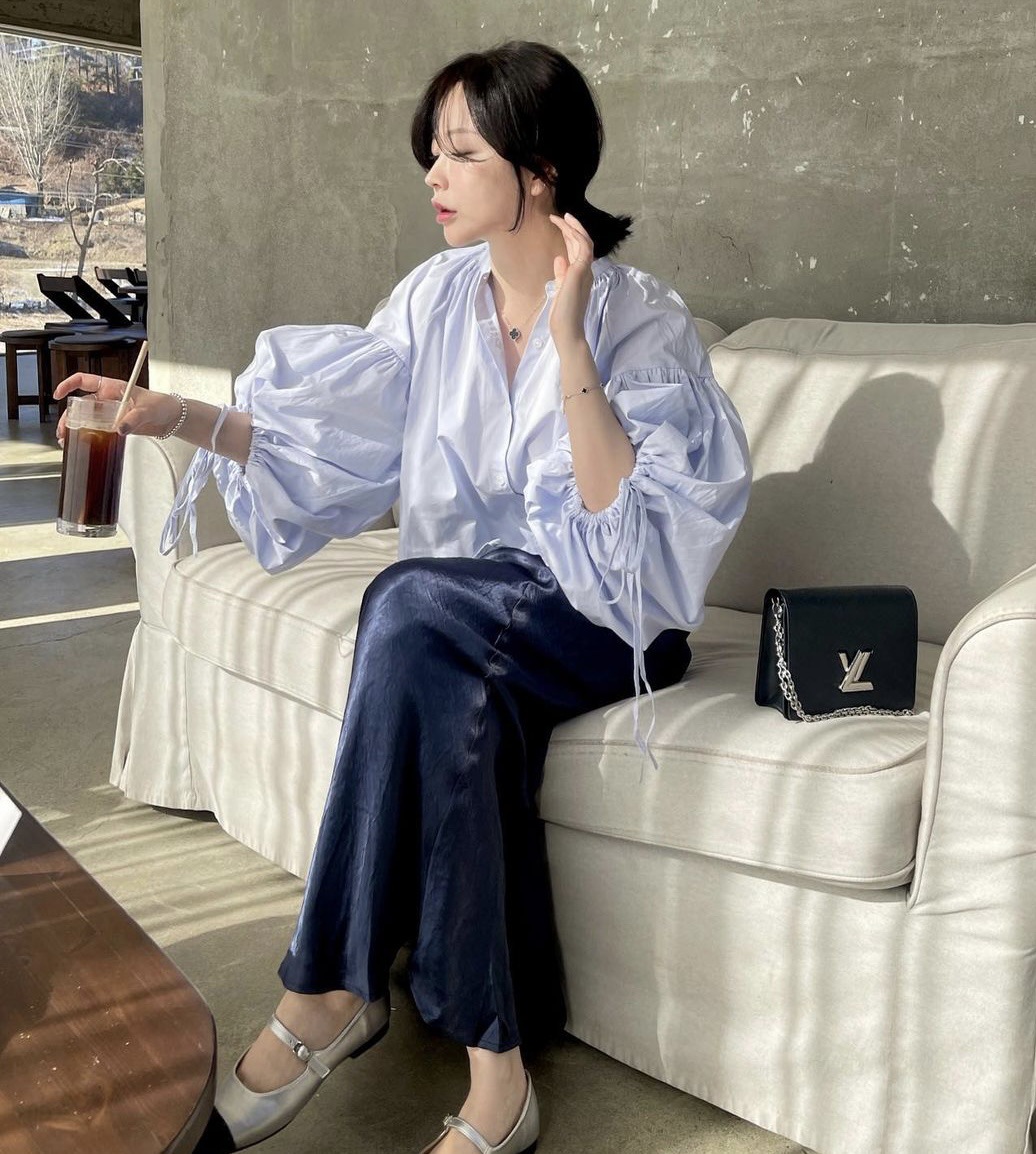 한국 세련된 가을 틈새 디자인 크루 넥 작은 가슴 레이스 업 느슨한 올 매치 랜턴 슬리브 셔츠 탑스토어 가기