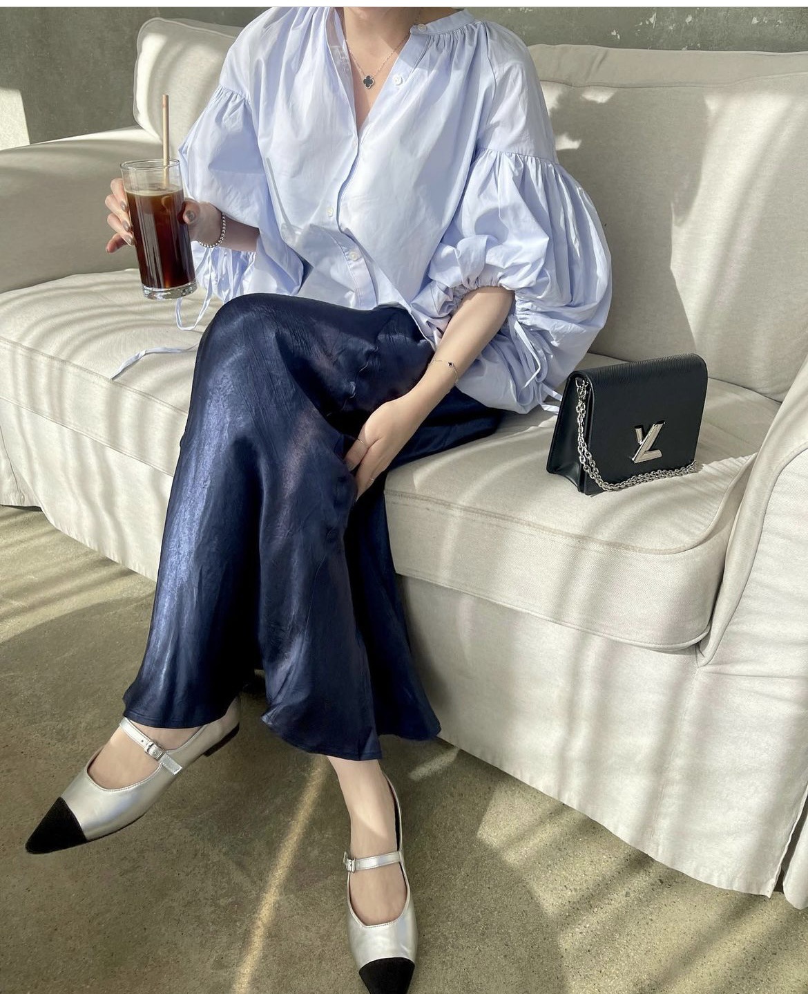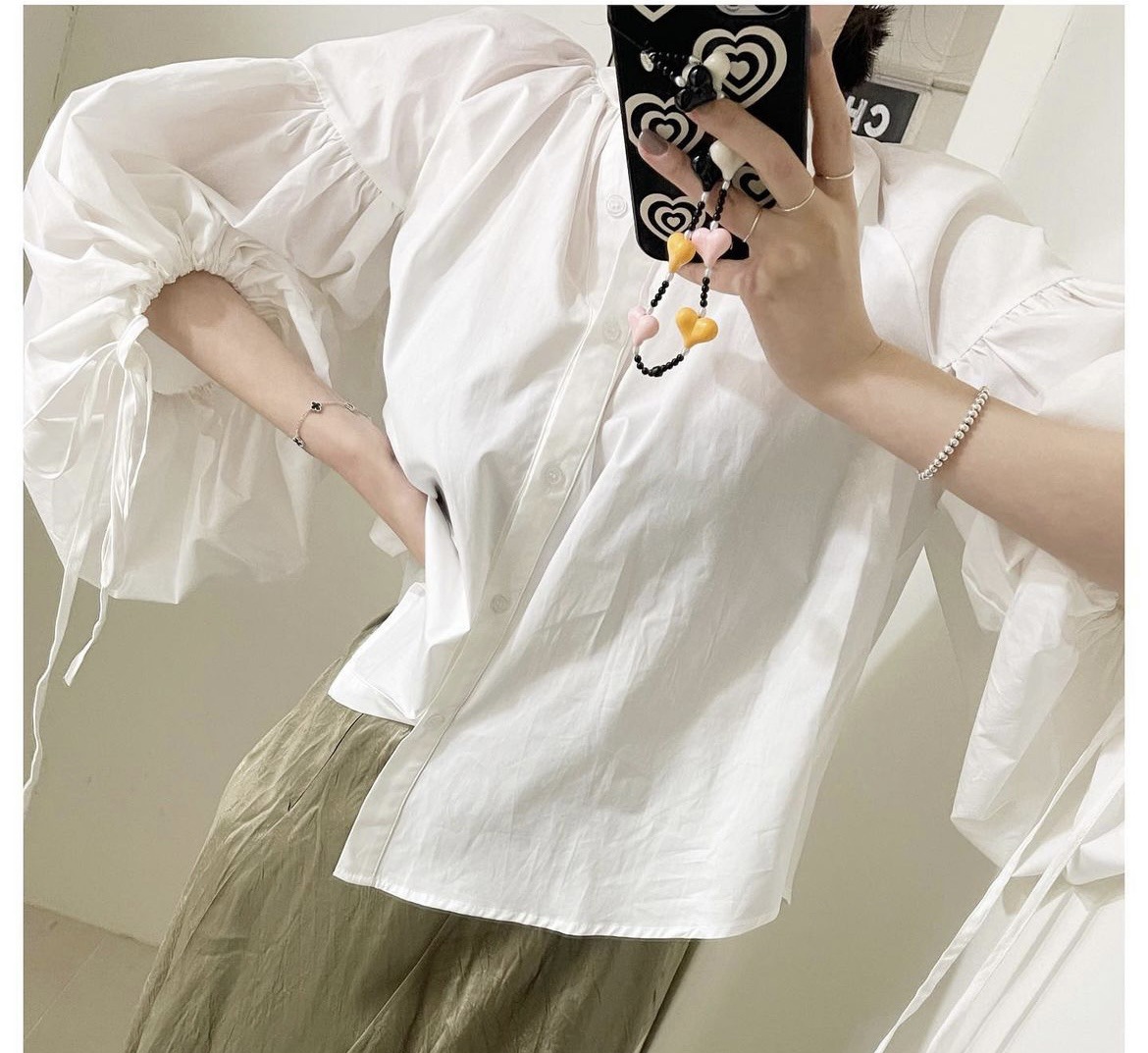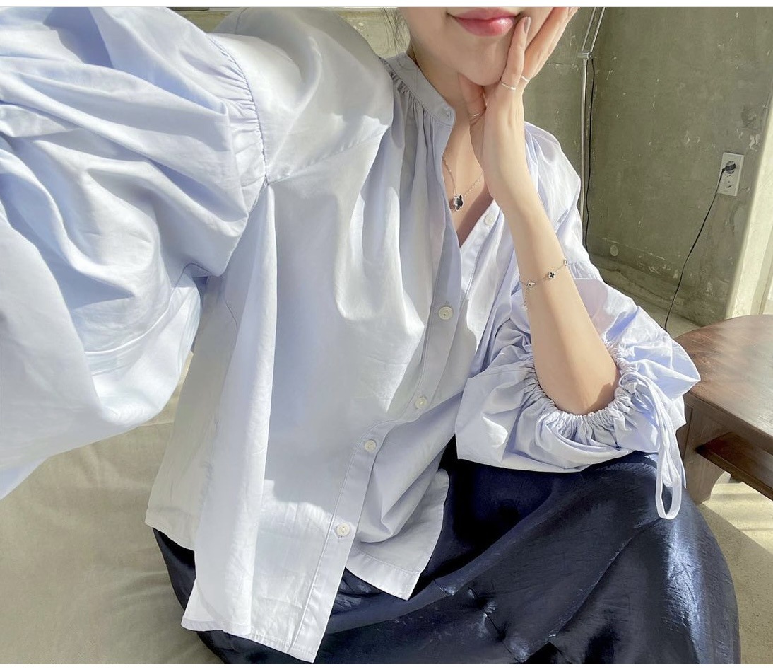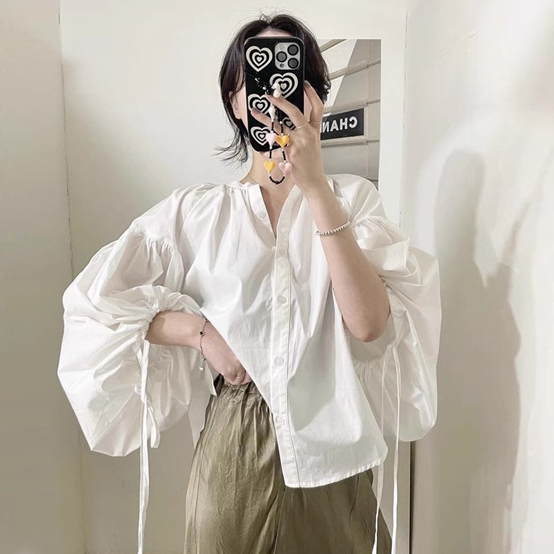 한국 세련된 가을 틈새 디자인 크루 넥 작은 가슴 레이스 업 느슨한 올 매치 랜턴 슬리브 셔츠 탑