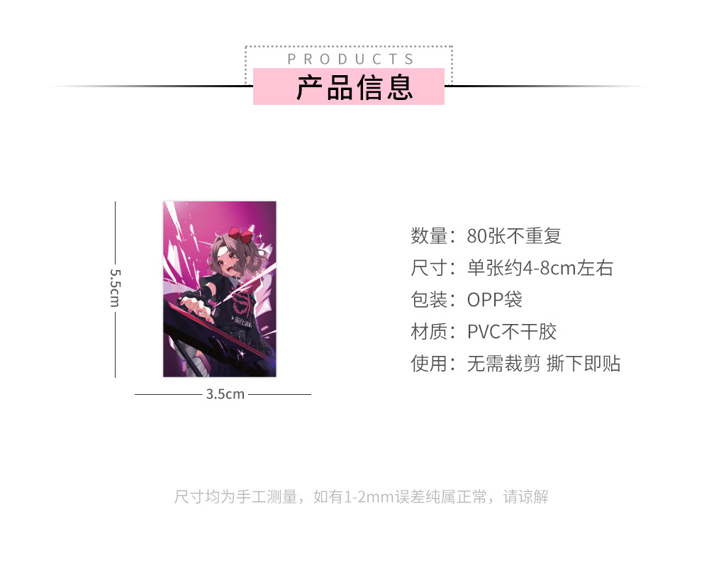 产品采用防水材质,进口海德堡高清印刷、覆膜,贴纸按形状模切完好,不用担心自己裁剪地歪歪扭扭
