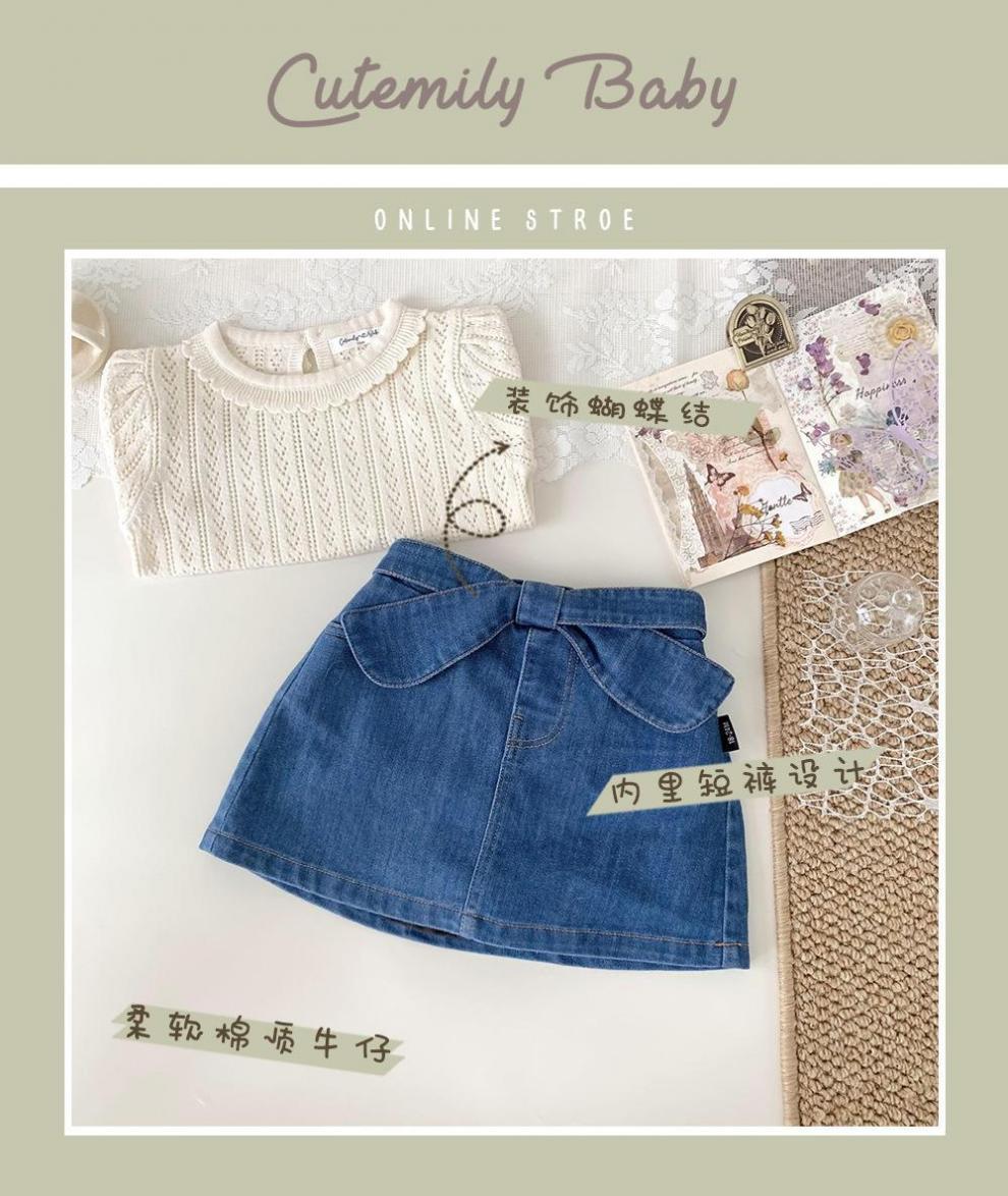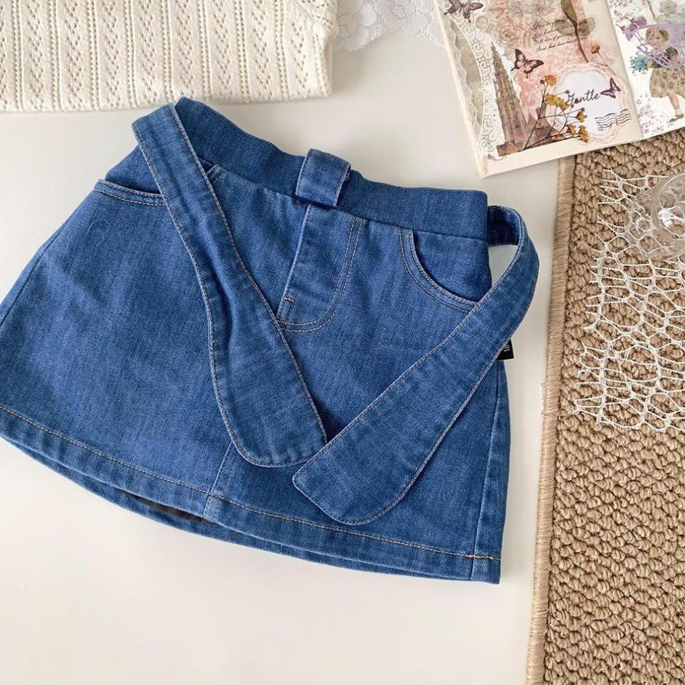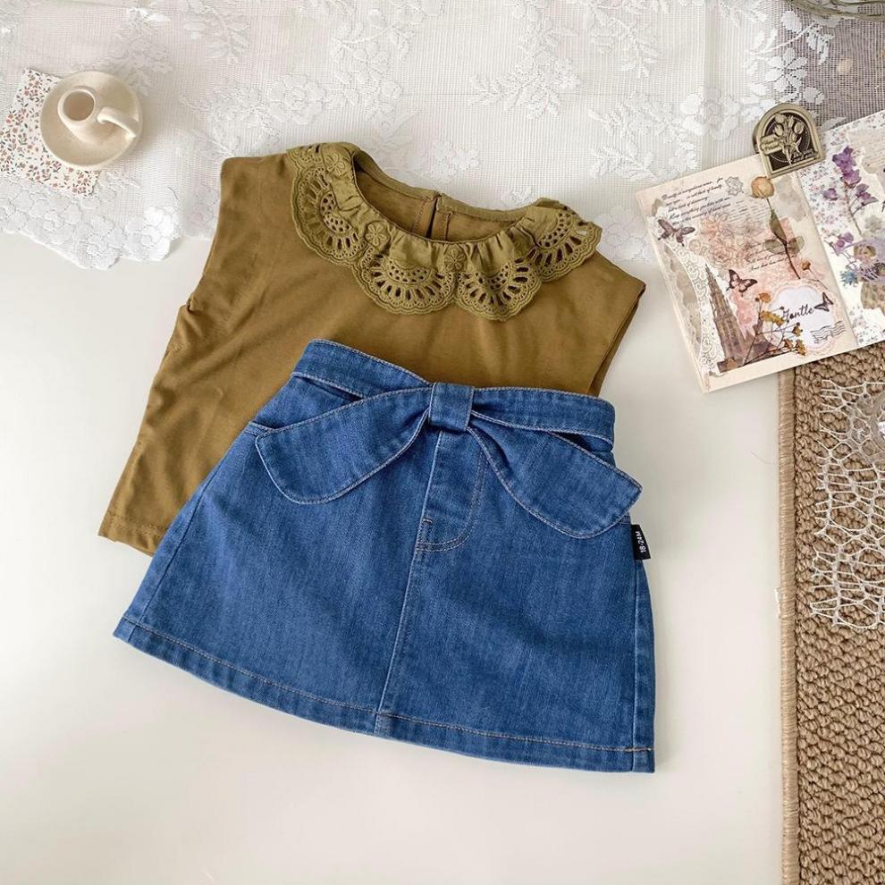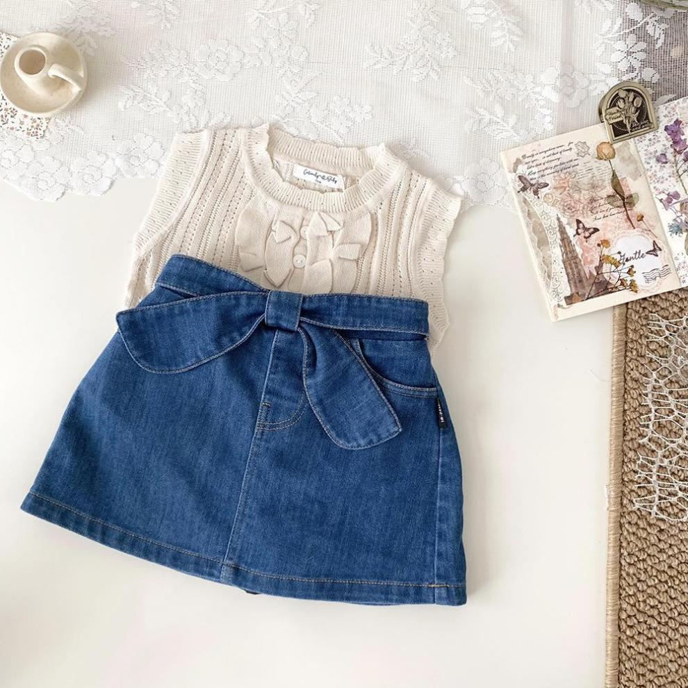여름 소녀의 귀여운 데님 치마 짧은 치마 아기 소녀의 활 레이스 업 짧은 치마 치마스토어 가기