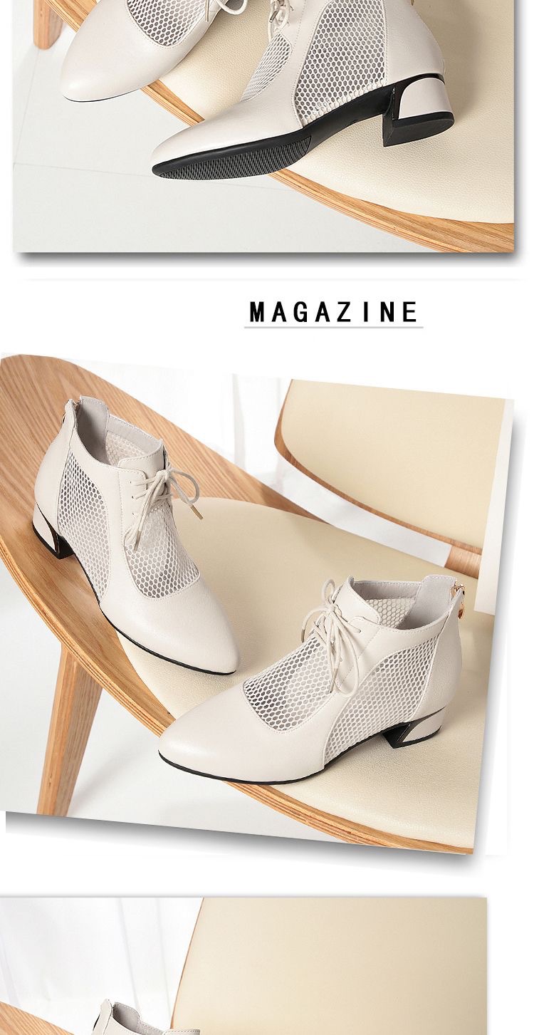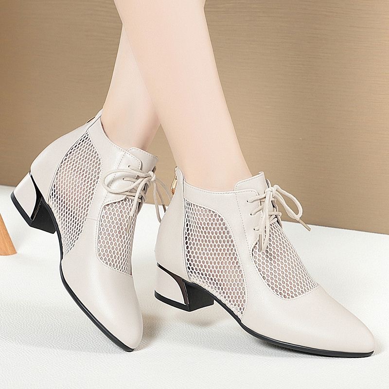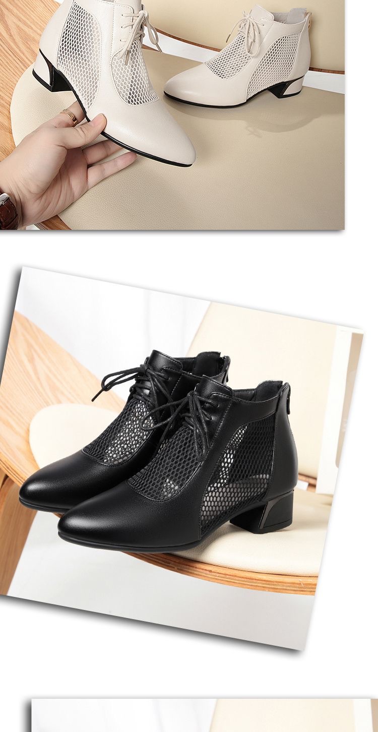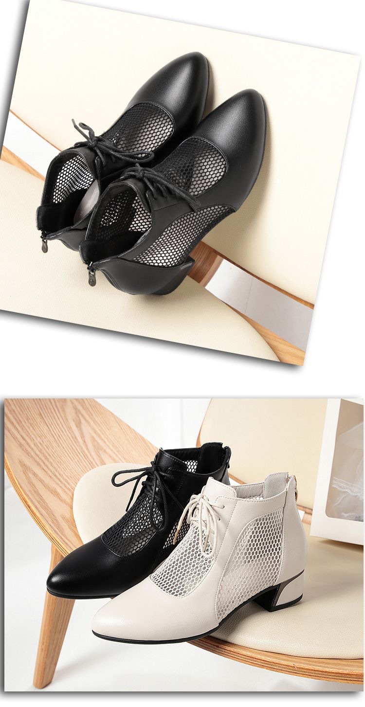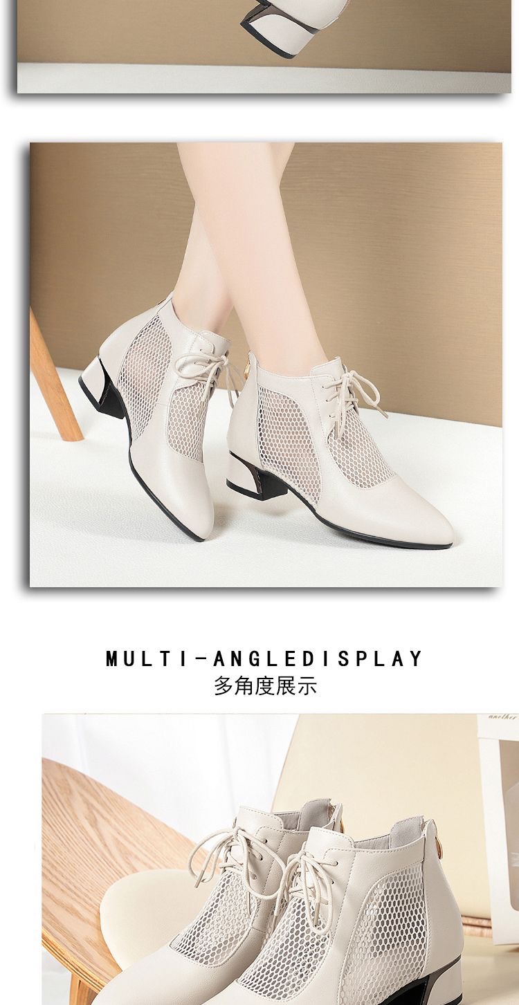 부드러운 가죽 포인팅 할로우 여성 신발 올매치 로우 힐 메쉬 커버 샌들 유행 틱 힐 메시 레이스 업 로마 샌들