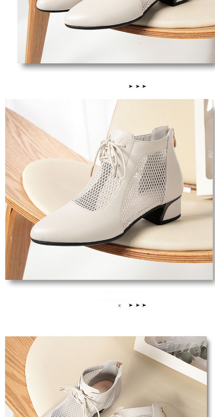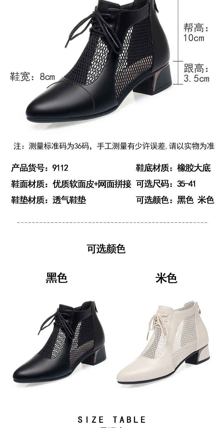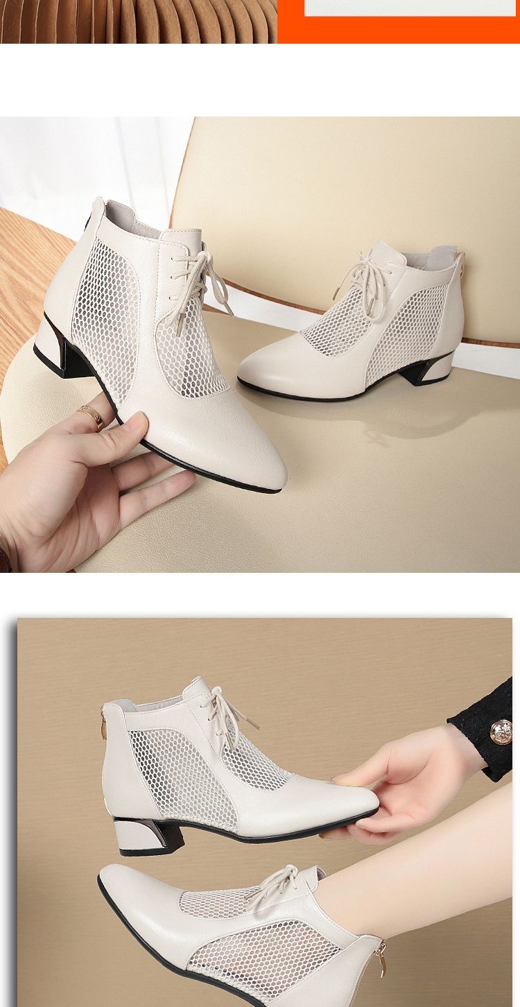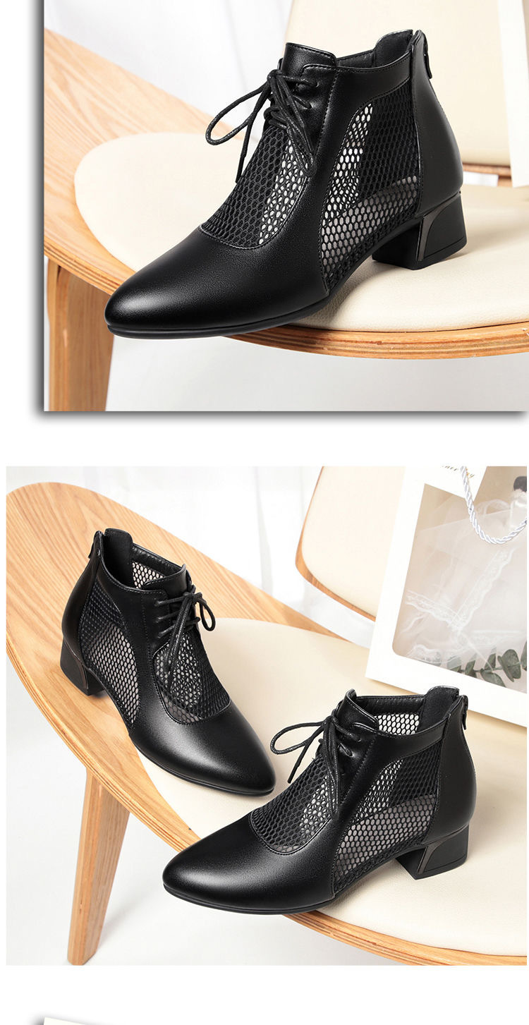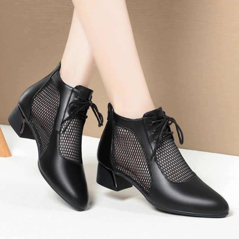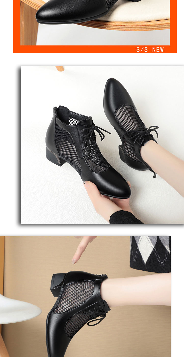 부드러운 가죽 포인팅 할로우 여성 신발 올매치 로우 힐 메쉬 커버 샌들 유행 틱 힐 메시 레이스 업 로마 샌들