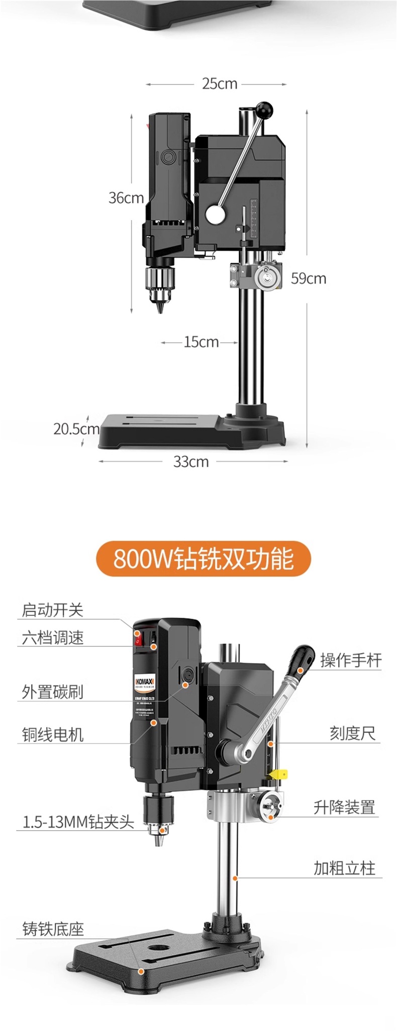 • [드릴링 및 밀링 겸용/6단 속도 조절] 800W 드릴링 및 밀링 겸용 + 견고한 다기능 작업대 + 트위스트 드릴 13개 세트